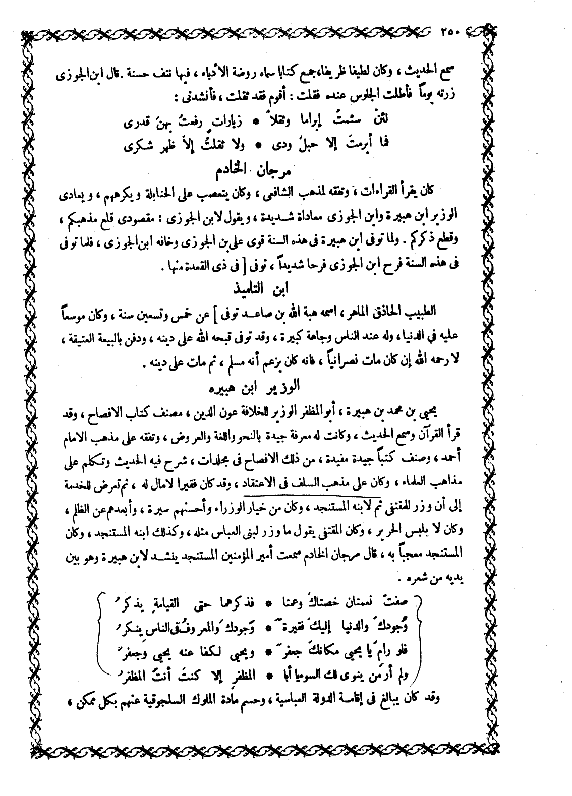 يَحْيَى بْنُ مُحَمَّدِ بْنِ هُبَيْرَةَ، أَبُو الْمُظَفَّرِ الوزير للخلافة عون الدين، مصنف كتاب الإفصاح، وقد قرأ القرآن وَسَمِعَ الْحَدِيثَ، وَكَانَتْ لَهُ مَعْرِفَةٌ جَيِّدَةٌ بِالنَّحْوِ وَاللُّغَةِ وَالْعَرُوضِ، وَتَفَقَّهَ عَلَى مَذْهَبِ الْإِمَامِ أَحْمَدَ، وَصَنَّفَ كُتُبًا جَيِّدَةً مُفِيدَةً، مِنْ ذَلِكَ الْإِفْصَاحُ في مجلدات، شرح فيه الحديث وتكلم على مذاهب الْعُلَمَاءِ، وَكَانَ عَلَى مَذْهَبِ السَّلَفِ فِي الِاعْتِقَادِ، وَقَدْ كَانَ فَقِيرًا لَا مَالَ لَهُ، ثُمَّ تَعَرَّضَ لِلْخِدْمَةِ إِلَى أَنْ وَزَرَ لِلْمُقْتَفِي ثُمَّ لِابْنِهِ الْمُسْتَنْجِدِ، وَكَانَ مِنْ خِيَارِ الْوُزَرَاءِ وَأَحْسَنِهِمْ سِيرَةً، وَأَبْعَدِهِمْ عَنِ الظُّلْمِ، وَكَانَ لَا يَلْبَسُ الْحَرِيرَ، وَكَانَ الْمُقْتَفِي يَقُولُ مَا وَزَرَ لِبَنِي العباس مثله، وكذلك ابنه المستنجد، وكان المستنجد مُعْجَبًا بِهِ، قَالَ مَرْجَانُ الْخَادِمُ سَمِعْتُ أَمِيرَ الْمُؤْمِنِينَ الْمُسْتَنْجِدَ يُنْشِدُ لِابْنِ هُبَيْرَةَ وَهُوَ بَيْنَ يَدَيْهِ مِنْ شِعْرِهِ.