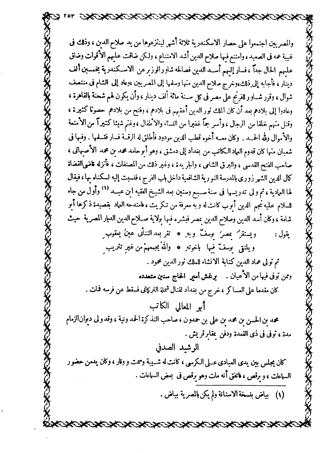 وَالْمِصْرِيِّينَ اجْتَمَعُوا عَلَى حِصَارِ الْإِسْكَنْدَرِيَّةِ ثَلَاثَةَ أَشْهُرٍ لِيَنْتَزِعُوهَا مِنْ يَدِ صَلَاحِ الدِّينِ، وَذَلِكَ فِي غيبة عمه في الصعيد، وامتنع فيها صلاح الدين أَشَدَّ الِامْتِنَاعِ، وَلَكِنْ ضَاقَتْ عَلَيْهِمُ الْأَقْوَاتُ وَضَاقَ عَلَيْهِمُ الْحَالُ جِدًّا، فَسَارَ إِلَيْهِمْ أَسَدُ الدِّينِ فَصَالَحَهُ شَاوَرُ الْوَزِيرُ عَنِ الْإِسْكَنْدَرِيَّةِ بِخَمْسِينَ أَلْفَ دِينَارٍ، فَأَجَابَهُ إِلَى ذَلِكَ، وَخَرَجَ صَلَاحُ الدِّينِ مِنْهَا وَسَلَّمَهَا إِلَى الْمِصْرِيِّينَ، وَعَادَ إِلَى الشَّامِ في منتصف شوال، وَقَرَّرَ شَاوَرُ للْفِرِنْجِ عَلَى مِصْرَ فِي كُلِّ سَنَةٍ مِائَةَ أَلْفِ دِينَارٍ، وَأَنْ يَكُونَ لَهُمْ شحنة بالقاهرة، وعادوا إِلَى بِلَادِهِمْ بَعْدَ أَنْ كَانَ الْمَلِكُ نُورُ الدين أعقبهم في بلادهم، وفتح من بلادهم حصونا كثيرة، وقتل منهم خلقا من الرجال، وأسر جما غفيرا من النساء والأطفال، وغنم شيئا كثيرا من الأمتعة والأموال وللَّه الْحَمْدُ. وَكَانَ مَعَهُ أَخُوهُ قُطْبُ الدِّينِ مودود فأطلق له الرقة فسار فتسلمها. وفيها فِي شَعْبَانَ مِنْهَا كَانَ قُدُومُ الْعِمَادِ الْكَاتِبِ مِنْ بَغْدَادَ إِلَى دِمَشْقَ، وَهُوَ أَبُو حَامِدٍ مُحَمَّدُ بْنُ مُحَمَّدٍ الْأَصْبَهَانِيُّ، صَاحِبُ الْفَتْحِ الْقُدْسِيِّ، والبرق الشامي، والجريدة، وَغَيْرِ ذَلِكَ مِنَ الْمُصَنَّفَاتِ، فَأَنْزَلَهُ قَاضِي الْقُضَاةِ كَمَالُ الدَّيْنِ الشَّهْرُزُورِيُّ بِالْمَدْرَسَةِ النُّورِيَّةِ الشَّافِعِيَّةِ دَاخِلَ بَابِ الْفَرَجِ، فَنُسِبَتْ إِلَيْهِ لِسُكْنَاهُ بِهَا، فَيُقَالُ لَهَا الْعِمَادِيَّةُ، ثُمَّ وَلِيَ تَدْرِيسَهَا فِي سَنَةِ سَبْعٍ وَسِتِّينَ بَعْدَ الشَّيْخِ الْفَقِيهِ ابْنِ عَبْدٍ [1] وَأَوَّلُ مَنْ جَاءَ لِلسَّلَامِ عَلَيْهِ نَجْمُ الدِّينِ أيوب كانت له وبه مَعْرِفَةٌ مِنْ تَكْرِيتَ، فَامْتَدَحَهُ الْعِمَادُ بِقَصِيدَةٍ ذَكَرَهَا أبو شامة، وكان أسد الدين وصلاح الدين بِمِصْرَ فَبَشَّرَهُ فِيهَا بِوِلَايَةِ صَلَاحِ الدِّينِ الدِّيَارَ الْمِصْرِيَّةَ حَيْثُ يَقُولُ: