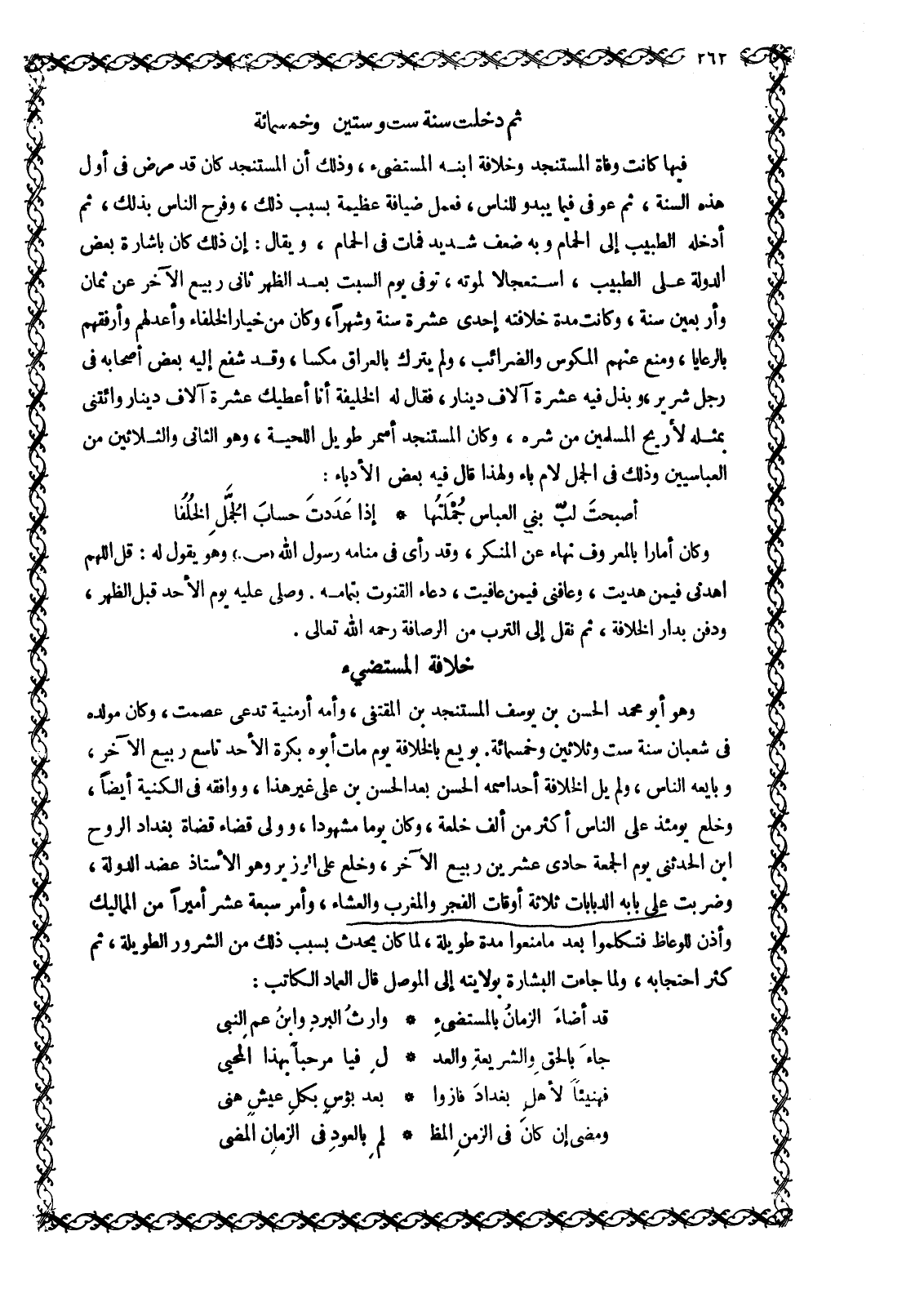 قد أضاء الزمان بالمستضيء ... وَارِثِ الْبَرْدِ وَابْنِ عَمِّ النَّبِيِّ