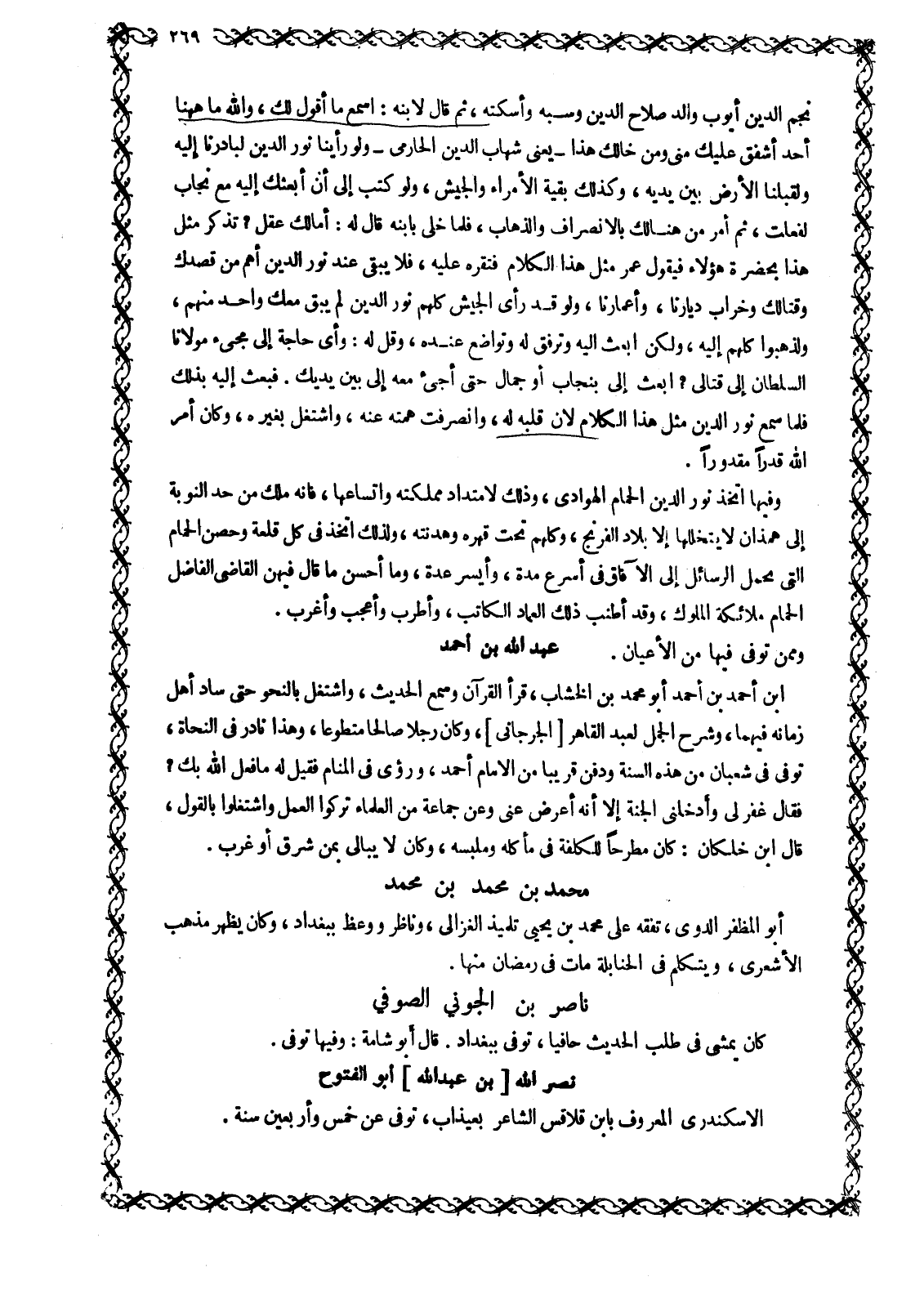 نجم الدين أيوب والد صلاح الدين وسبه وَأَسْكَتَهُ، ثُمَّ قَالَ لِابْنِهِ: اسْمَعْ مَا أَقُولُ لَكَ، وَاللَّهِ مَا هَاهُنَا أَحَدٌ أَشْفَقُ عَلَيْكَ مِنِّي وَمِنْ خَالِكَ هَذَا- يَعْنِي شِهَابَ الدِّينِ الْحَارِمِيَّ- وَلَوْ رَأَيْنَا نُورَ الدِّينِ لَبَادَرْنَا إِلَيْهِ وَلَقَبَّلْنَا الْأَرْضَ بَيْنَ يَدَيْهِ، وَكَذَلِكَ بَقِيَّةُ الْأُمَرَاءِ والجيش، وَلَوْ كَتَبَ إِلَيَّ أَنْ أَبْعَثَكَ إِلَيْهِ مَعَ نَجَّابٍ لَفَعَلْتُ، ثُمَّ أَمَرَ مَنْ هُنَالِكَ بِالِانْصِرَافِ والذهاب، فلما خلى بِابْنِهِ قَالَ لَهُ: أَمَا لَكَ عَقْلٌ؟ تَذْكُرُ مِثْلَ هَذَا بِحَضْرَةِ هَؤُلَاءِ فَيَقُولُ عُمْرُ مِثْلَ هَذَا الْكَلَامِ فَتُقِرُّهُ عَلَيْهِ، فَلَا يَبْقَى عِنْدَ نور الدين أهم من قصدك وقتالك وخراب ديارنا، وأعمارنا، ولو قد رأى الجيش كلهم نور الدين لم يبق معك واحد منهم، ولذهبوا كلهم إليه، وَلَكِنِ ابْعَثْ إِلَيْهِ وَتَرَفَّقْ لَهُ وَتَوَاضَعْ عِنْدَهُ، وَقُلْ لَهُ: وَأَيُّ حَاجَةٍ إِلَى مَجِيءِ مَوْلَانَا السلطان إلى قتالي؟ ابعث إلى بنجاب أو جمال حَتَّى أَجِيءَ مَعَهُ إِلَى بَيْنِ يَدَيْكَ. فَبَعَثَ إِلَيْهِ بِذَلِكَ فَلَمَّا سَمِعَ نُورُ الدِّينِ مِثْلَ هَذَا الْكَلَامِ لَانَ قَلْبُهُ لَهُ، وَانْصَرَفَتْ هِمَّتُهُ عَنْهُ، وَاشْتَغَلَ بِغَيْرِهِ، وَكَانَ أَمْرُ اللَّهِ قَدَرًا مَقْدُورًا.