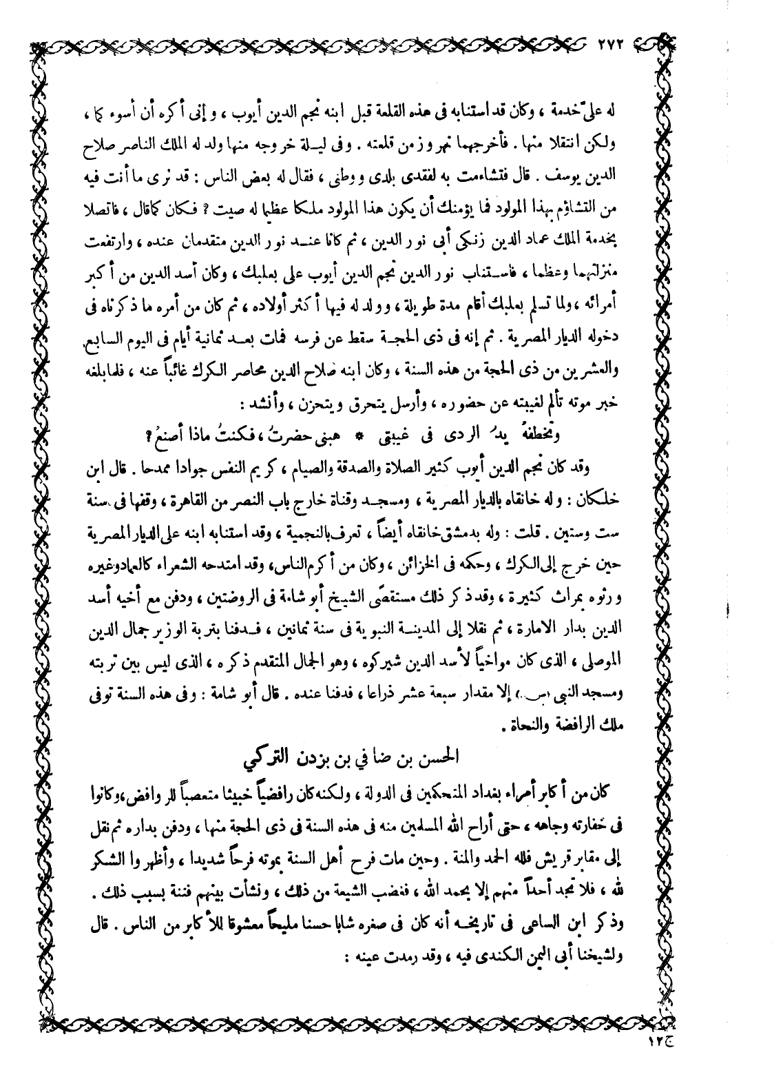 لَهُ عَلَيَّ خِدْمَةٌ، وَكَانَ قَدِ اسْتَنَابَهُ فِي هذه القلعة قبل ابنه نجم الدين أيوب، وإني أكره أن أسوأ كما، ولكن انتقلا منها. فأخرجهما نهروز مِنْ قَلْعَتِهِ. وَفِي لَيْلَةِ خُرُوجِهِ مِنْهَا وُلِدَ لَهُ الْمَلِكُ النَّاصِرُ صَلَاحُ الدِّينِ يُوسُفُ. قَالَ فتشاءمت به لفقدى بلدي ووطني، فقال له بَعْضُ النَّاسِ: قَدْ نَرَى مَا أَنْتَ فِيهِ مِنَ التَّشَاؤُمِ بِهَذَا الْمَوْلُودِ فَمَا يُؤَمِّنُكَ أَنْ يَكُونَ هَذَا الْمَوْلُودُ مَلِكًا عَظِيمًا لَهُ صِيتٌ؟ فكان كما قال، فاتصلا بخدمة الملك عماد الدين زنكي أبى نور الدين، ثم كانا عند نور الدين متقدمان عنده، وارتفعت منزلتهما وعظما، فاستناب نور الدين نجم الدين أيوب على بعلبكّ، وكان أسد الدين من أكبر أمرائه، ولما تسلم بعلبكّ أقام مدة طويلة، وولد له فيها أكثر أولاده، ثم كان من أمره ما ذكرناه في دخوله الديار المصرية. ثم أَنَّهُ فِي ذِي الْحِجَّةِ سَقَطَ عَنْ فَرَسِهِ فمات بَعْدَ ثَمَانِيَةِ أَيَّامٍ فِي الْيَوْمِ السَّابِعِ وَالْعِشْرِينَ مِنْ ذِي الْحِجَّةِ مِنْ هَذِهِ السَّنَةِ، وَكَانَ ابنه صلاح الدين محاصر الكرك غائبا عنه، فلما بلغه خبر موته تألم لغيبته عن حضوره، وأرسل يتحرق ويتحزن، وأنشد: