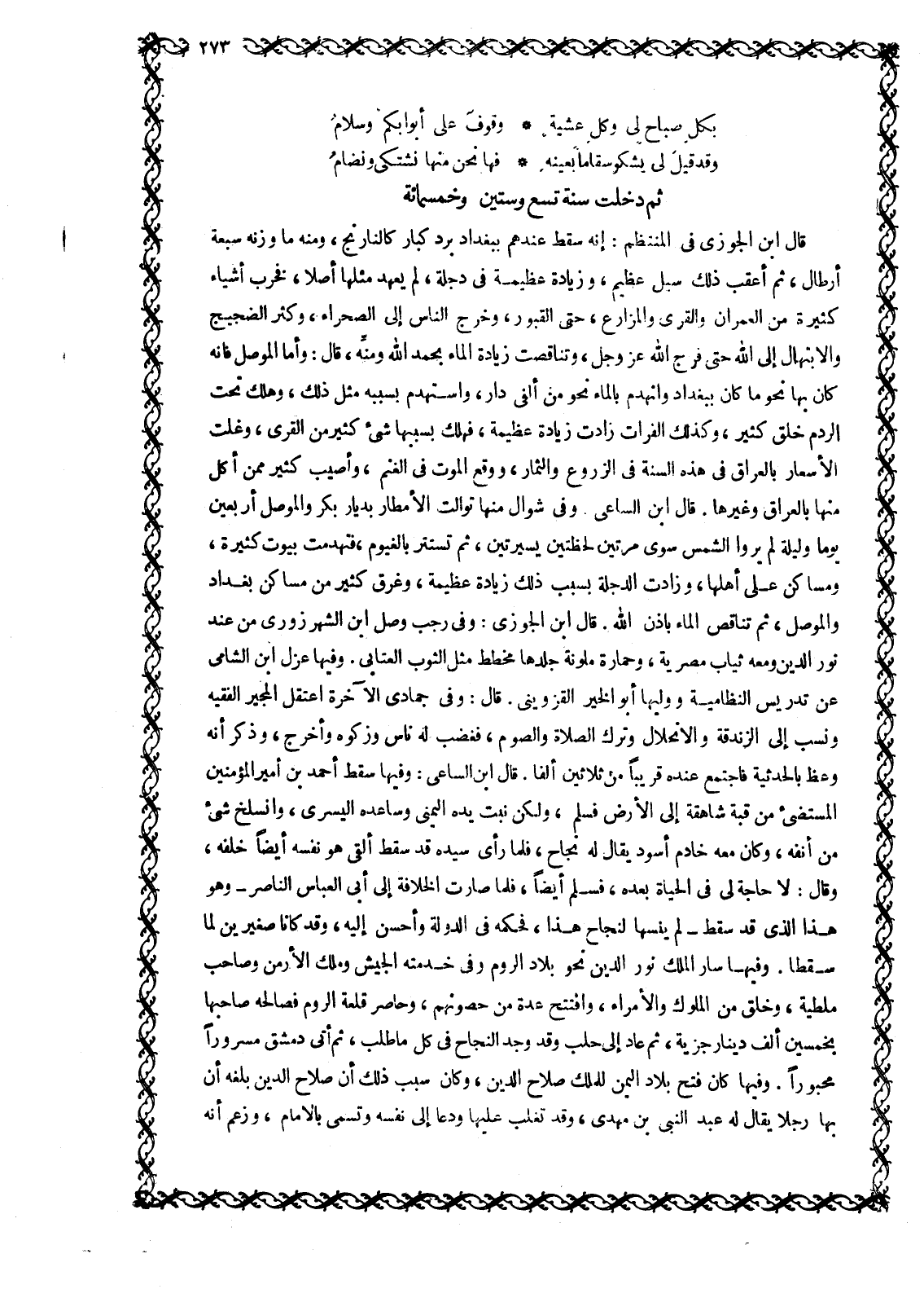 قَالَ ابْنُ الْجَوْزِيِّ فِي الْمُنْتَظَمِ: إِنَّهُ سَقَطَ عندهم ببغداد بَرَدٌ كِبَارٌ كَالنَّارَنْجِ، وَمِنْهُ مَا وَزْنُهُ سَبْعَةُ أرطال، ثم أعقب ذلك سيل عظيم، وزيادة عظيمة في دجلة، لم يعهد مثلها أصلا، فخرب أشياء كثيرة مِنَ الْعُمْرَانِ وَالْقُرَى وَالْمَزَارِعِ، حَتَّى الْقُبُورِ، وَخَرَجَ الناس إلى الصحراء، وكثر الضجيج والابتهال إلى الله حَتَّى فَرَّجَ اللَّهُ عَزَّ وَجَلَّ، وَتَنَاقَصَتْ زِيَادَةُ الماء بحمد الله ومنّه، قال: وأما الموصل فإنه كان بها نحو ما كان ببغداد وَانْهَدَمَ بِالْمَاءِ نَحْوٌ مِنْ أَلْفَيْ دَارٍ، وَاسْتُهْدِمَ بسببه مثل ذلك، وهلك تحت الردم خَلْقٌ كَثِيرٌ، وَكَذَلِكَ الْفُرَاتُ زَادَتْ زِيَادَةً عَظِيمَةً، فَهَلَكَ بِسَبَبِهَا شَيْءٌ كَثِيرٌ مِنَ الْقُرَى، وَغَلَتِ الْأَسْعَارُ بِالْعِرَاقِ فِي هَذِهِ السَّنَةِ فِي الزُّرُوعِ والثمار، ووقع الموت في الغنم، وأصيب كَثِيرٌ مِمَّنْ أَكَلَ مِنْهَا بِالْعِرَاقِ وَغَيْرِهَا. قَالَ ابن الساعي: وفي شوال منها تَوَالَتِ الْأَمْطَارُ بِدِيَارِ بَكْرٍ وَالْمَوْصِلِ أَرْبَعِينَ يَوْمًا وليلة لم يروا الشمس سوى مرتين لحظتين يسيرتين، ثم تستتر بالغيوم، فتهدمت بيوت كثيرة، ومساكن على أهلها، وزادت الدجلة بسبب ذلك زيادة عظيمة، وغرق كَثِيرٌ مِنْ مَسَاكِنِ بَغْدَادَ وَالْمَوْصِلِ، ثُمَّ تَنَاقَصَ الماء باذن الله. قَالَ ابْنُ الْجَوْزِيِّ: وَفِي رَجَبٍ وَصَلَ ابْنُ الشهرزوري من عند نُورِ الدِّينِ وَمَعَهُ ثِيَابٌ مِصْرِيَّةٌ، وَحِمَارَةٌ مُلَوَّنَةٌ جلدها مخطط مثل الثوب العتابى. وفيها عزل ابن الشامي عن تدريس النظامية ووليها أَبُو الْخَيْرِ الْقَزْوِينِيُّ. قَالَ: وَفِي جُمَادَى الْآخِرَةِ اعْتُقِلَ الْمُجِيرُ الْفَقِيهُ وَنُسِبَ إِلَى الزَّنْدَقَةِ وَالِانْحِلَالِ وترك الصلاة والصوم، فغضب له ناس وزكوه وأخرج، وذكر أنه وعظ بالحدثية فاجتمع عنده قريبا مِنْ ثَلَاثِينَ أَلْفًا. قَالَ ابْنُ السَّاعِي: وَفِيهَا سقط أَحْمَدُ بْنُ أَمِيرِ الْمُؤْمِنِينَ الْمُسْتَضِيءِ مِنْ قُبَّةٍ شاهقة إلى الأرض فسلم، ولكن نبت يده اليمنى وساعده الْيُسْرَى، وَانْسَلَخَ شَيْءٌ مِنْ أَنْفِهِ، وَكَانَ مَعَهُ خَادِمٌ أَسْوَدُ يُقَالُ لَهُ نَجَاحٌ، فَلَمَّا رَأَى سَيِّدَهُ قَدْ سَقَطَ أَلْقَى هُوَ نَفْسَهُ أَيْضًا خلفه، وقال: لا حاجة لي في الحياة بَعْدَهُ، فَسَلِمَ أَيْضًا، فَلَمَّا صَارَتِ الْخِلَافَةُ إِلَى أَبِي الْعَبَّاسِ النَّاصِرِ- وَهُوَ هَذَا الَّذِي قَدْ سَقَطَ- لَمْ يَنْسَهَا لِنَجَاحٍ هَذَا، فَحَكَّمَهُ فِي الدولة وأحسن إليه، وقد كانا صغيرين لما سقطا. وَفِيهَا سَارَ الْمَلِكُ نُورُ الدِّينِ نَحْوَ بِلَادِ الرُّومِ وَفِي خِدْمَتِهِ الْجَيْشُ وَمَلِكُ الْأَرْمَنِ وَصَاحِبُ مَلَطْيَةَ، وَخَلْقٌ مِنَ الْمُلُوكِ وَالْأُمَرَاءِ، وَافْتَتَحَ عِدَّةً من حصونهم، وَحَاصَرَ قَلْعَةَ الرُّومِ فَصَالَحَهُ صَاحِبُهَا بِخَمْسِينَ أَلْفَ دِينَارٍ جِزْيَةً، ثُمَّ عَادَ إِلَى حَلَبَ وَقَدْ وَجَدَ النَّجَاحَ فِي كُلِّ مَا طَلَبَ، ثُمَّ أتى دمشق مسرورا محبورا. وفيها كَانَ فَتْحُ بِلَادِ الْيَمَنِ لِلْمَلِكِ صَلَاحِ الدِّينِ، وكان سبب ذلك أن صلاح الدين بَلَغَهُ أَنَّ بِهَا رَجُلًا يُقَالُ لَهُ عَبْدُ النبي بن مهدي، وقد تَغَلَّبَ عَلَيْهَا وَدَعَا إِلَى نَفْسِهِ وَتَسَمَّى بِالْإِمَامِ، وزعم أنه