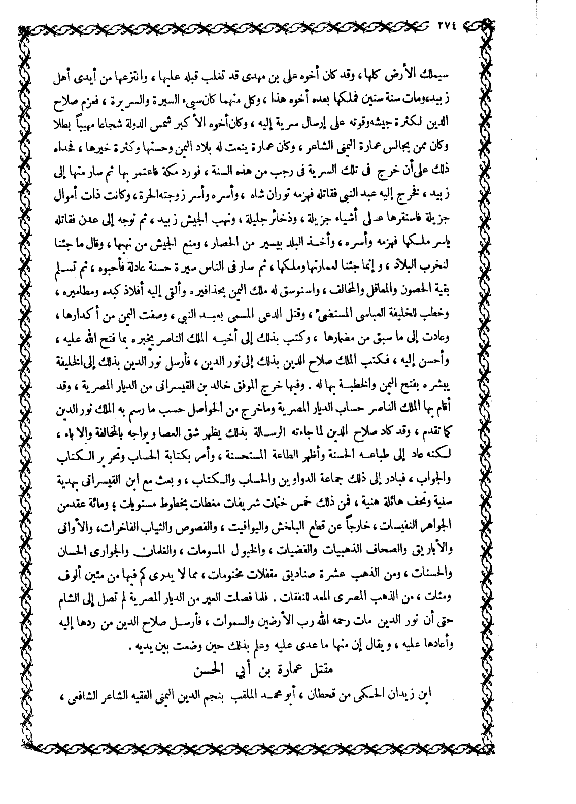 سَيَمْلِكُ الْأَرْضَ كُلَّهَا، وَقَدْ كَانَ أَخُوهُ عَلِيُّ بن مهدي قد تغلب قبله عليها، وَانْتَزَعَهَا مِنْ أَيْدِي أَهْلِ زَبِيدَ، وَمَاتَ سَنَةَ ستين فملكها بعده أخوه هذا، وكل منهما كان سيء السيرة والسريرة، فعزم صَلَاحُ الدِّينِ لِكَثْرَةِ جَيْشِهِ وَقُوَّتِهِ عَلَى إِرْسَالِ سَرِيَّةٍ إِلَيْهِ، وَكَانَ أَخُوهُ الْأَكْبَرُ شَمْسُ الدَّوْلَةِ شُجَاعًا مَهِيبًا بَطَلًا وَكَانَ مِمَّنْ يُجَالِسُ عُمَارَةَ اليمنى الشاعر، وكان عمارة يَنْعَتُ لَهُ بِلَادَ الْيَمَنِ وَحُسْنَهَا وَكَثْرَةَ خَيْرِهَا، فحداه ذلك على أن خرج في تلك السَّرِيَّةِ فِي رَجَبٍ مِنْ هَذِهِ السَّنَةِ، فَوَرَدَ مكة فَاعْتَمَرَ بِهَا ثُمَّ سَارَ مِنْهَا إِلَى زَبِيدَ، فخرج إليه عبد النبي فقاتله فهزمه توران شاه، وَأَسَرَهُ وَأَسَرَ زَوْجَتَهُ الْحُرَّةَ، وَكَانَتْ ذَاتَ أَمْوَالٍ جزيلة فاستقرها على أشياء جزيلة، وذخائر جليلة، ونهب الجيش زبيد، ثم توجه إلى عدن فقاتله ياسر ملكها فهزمه وَأَسَرَهُ، وَأَخَذَ الْبَلَدَ بِيَسِيرٍ مِنَ الْحِصَارِ، وَمَنَعَ الْجَيْشَ مِنْ نَهْبِهَا، وَقَالَ مَا جِئْنَا لِنُخَرِّبَ الْبِلَادَ، وَإِنَّمَا جِئْنَا لِعِمَارَتِهَا وَمُلْكِهَا، ثُمَّ سَارَ فِي النَّاسِ سِيرَةً حَسَنَةً عَادِلَةً فَأَحَبُّوهُ، ثُمَّ تسلم بقية الحصون والمعاقل والمخالف، وَاسْتَوْسَقَ لَهُ مُلْكُ الْيَمَنِ بِحَذَافِيرِهِ وَأَلْقَى إِلَيْهِ أفلاذ كبده ومطاميره، وخطب للخليفة العباسي الْمُسْتَضِيءِ، وَقَتَلَ الدَّعِيَّ الْمُسَمَّى بِعَبْدِ النَّبِيِّ، وَصَفَتِ الْيَمَنُ مِنْ أَكْدَارِهَا، وَعَادَتْ إِلَى مَا سَبَقَ مِنْ مِضْمَارِهَا، وَكَتَبَ بِذَلِكَ إِلَى أَخِيهِ الْمَلِكِ الناصر يُخْبِرُهُ بِمَا فَتَحَ اللَّهُ عَلَيْهِ، وَأَحْسَنَ إِلَيْهِ، فَكَتَبَ الْمَلِكُ صَلَاحُ الدِّينِ بِذَلِكَ إِلَى نُورِ الدِّينِ، فَأَرْسَلَ نُورُ الدِّينِ بِذَلِكَ إِلَى الْخَلِيفَةِ يُبَشِّرُهُ بِفَتْحِ الْيَمَنِ وَالْخُطْبَةِ بِهَا لَهُ. وَفِيهَا خَرَجَ الْمُوَفَّقُ خَالِدُ بْنُ الْقَيْسَرَانِيِّ مِنَ الدِّيَارِ الْمِصْرِيَّةِ، وَقَدْ أَقَامَ بِهَا الْمَلِكُ النَّاصِرُ حِسَابَ الديار المصرية وما خرج من الحواصل حسب ما رَسَمَ بِهِ الْمَلِكُ نُورُ الدِّينِ كَمَا تَقَدَّمَ، وقد كاد صلاح الدين لَمَّا جَاءَتْهُ الرِّسَالَةُ بِذَلِكَ يُظْهِرُ شَقَّ الْعَصَا ويواجه بالمخالفة والاباء، لكنه عَادَ إِلَى طِبَاعِهِ الْحَسَنَةِ وَأَظْهَرَ الطَّاعَةَ الْمُسْتَحْسَنَةَ، وأمر بكتابة الحساب وتحرير الكتاب والجواب، فبادر إلى ذَلِكَ جَمَاعَةُ الدَّوَاوِينِ وَالْحِسَابِ وَالْكُتَّابُ، وَبَعَثَ مَعَ ابْنَ الْقَيْسَرَانِيِّ بِهَدِيَّةٍ سَنِيَّةٍ وَتُحَفٍ هَائِلَةٍ هَنِيَّةٍ، فَمِنْ ذَلِكَ خَمْسُ خَتَمَاتٍ شَرِيفَاتٍ مُغَطَّاتٍ بِخُطُوطٍ مُسْتَوَيَاتٍ، وَمِائَةُ عِقْدٍ مِنَ الْجَوَاهِرِ النَّفِيسَاتِ، خَارِجًا عن قطع البلخش واليواقيت، وَالْفُصُوصِ وَالثِّيَابِ الْفَاخِرَاتِ، وَالْأَوَانِي وَالْأَبَارِيقِ وَالصِّحَافِ الذَّهَبِيَّاتِ والفضيات، والخيول المسومات، وَالْغِلْمَانِ وَالْجَوَارِي الْحِسَانِ وَالْحَسَنَاتِ، وَمِنَ الذَّهَبِ عَشَرَةُ صَنَادِيقَ مُقَفَّلَاتٍ مَخْتُومَاتٍ، مِمَّا لَا يُدْرَى كَمْ فيها من مئين ألوف ومئات، مِنَ الذَّهَبِ الْمِصْرِيِّ الْمُعَدِّ لِلنَّفَقَاتِ. فَلَمَّا فَصَلَتِ الْعِيرُ مِنَ الدِّيَارِ الْمِصْرِيَّةِ لَمْ تَصِلْ إِلَى الشام حتى أن نور الدين مات رحمه الله رب الأرضين والسموات، فأرسل صلاح الدين من ردها إليه وأعادها عليه، وَيُقَالُ إِنَّ مِنْهَا مَا عُدِيَ عَلَيْهِ وَعَلِمَ بِذَلِكَ حِينَ وُضِعَتْ بَيْنَ يَدَيْهِ.