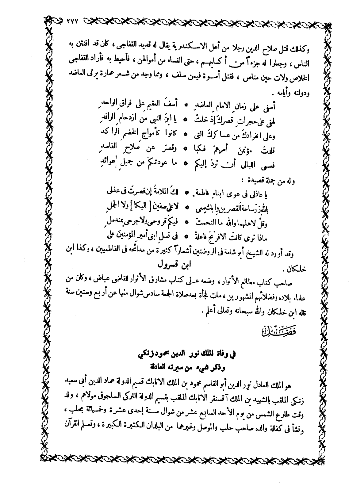 فَصْلٌ «فِي وَفَاةِ الْمَلِكِ الْعَادِلِ نُورِ الدِّينِ محمود بن زنكي بن آقسنقر التُّرْكِيِّ السَّلْجُوقِيِّ فِي هَذِهِ السَّنَةِ وَذِكْرُ شَيْءٍ من سيرته العادلة الْكَامِلَةِ»