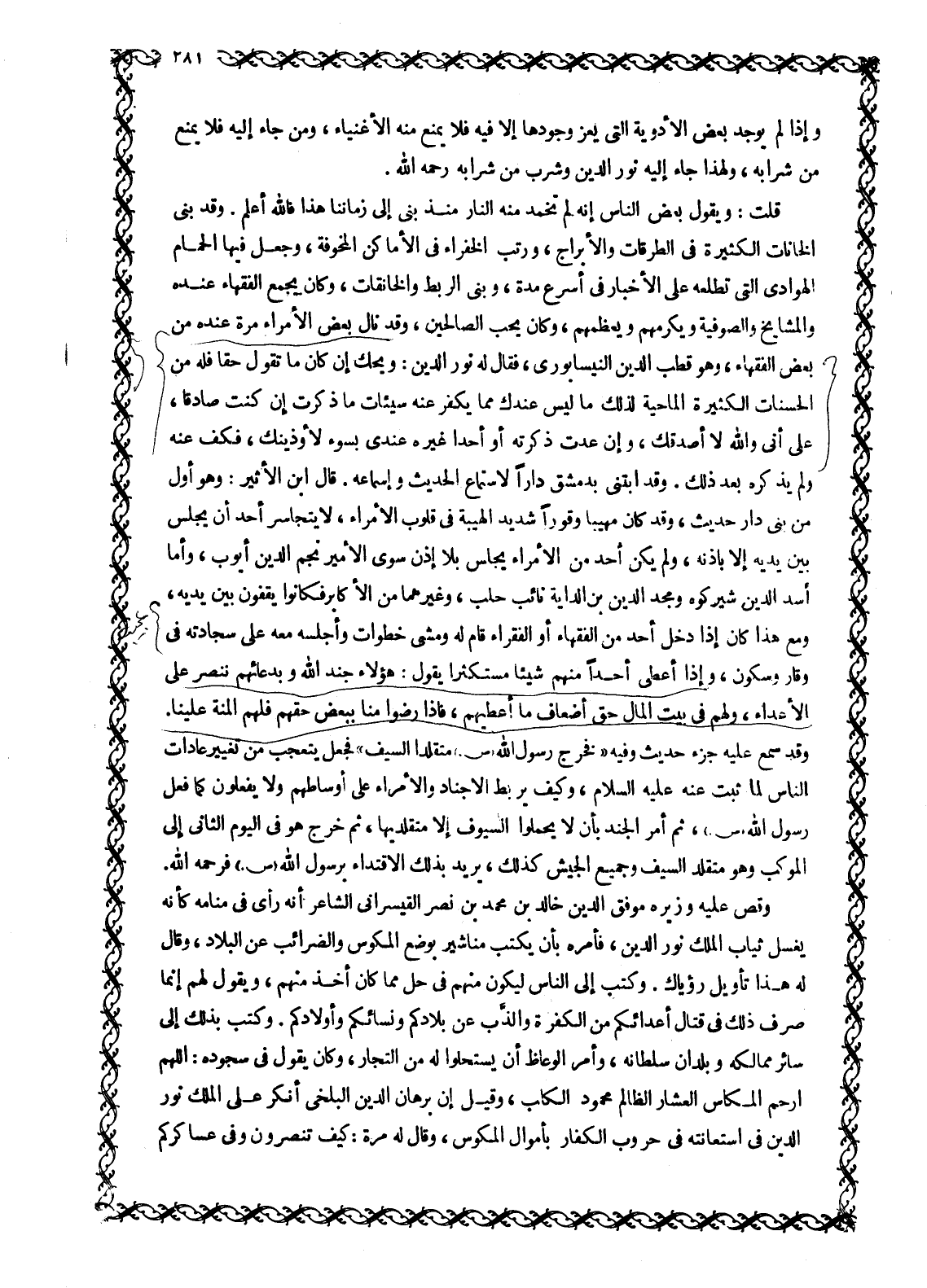 قُلْتُ: وَيَقُولُ بَعْضُ النَّاسِ إِنَّهُ لَمْ تَخْمُدْ مِنْهُ النَّارُ مُنْذُ بُنِيَ إِلَى زَمَانِنَا هَذَا فاللَّه أعلم. وقد بنى الخانات الكثيرة في الطرقات وَالْأَبْرَاجَ، وَرَتَّبَ الْخُفَرَاءَ فِي الْأَمَاكِنِ الْمَخُوفَةِ، وَجَعَلَ فيها الحمام الهوادي التي تطلعه على الأخبار في أسرع مدة، وبنى الربط والخانقات، وكان يجمع الفقهاء عنده والمشايخ والصوفية ويكرمهم ويعظمهم، وكان يحب الصالحين، وقد نال بعض الأمراء مرة عنده من بعض الفقهاء، وَهُوَ قُطْبُ الدِّينِ النَّيْسَابُورِيُّ، فَقَالَ لَهُ نُورُ الدِّينِ: وَيْحَكَ إِنْ كَانَ مَا تَقُولُ حَقًّا فله من الحسنات الكثيرة الماحية لذلك مَا لَيْسَ عِنْدَكَ مِمَّا يُكَفِّرُ عَنْهُ سَيِّئَاتِ مَا ذَكَرْتَ إِنْ كُنْتَ صَادِقًا، عَلَى أَنِّي وَاللَّهِ لَا أُصَدِّقُكَ، وَإِنْ عُدْتَ ذَكَرْتَهُ أَوْ أحدا غيره عندي بسوء لأوذينك، فكف عنه ولم يذكره بعد ذلك. وقد ابتنى بدمشق دارا لاستماع الْحَدِيثِ وَإِسْمَاعِهِ. قَالَ ابْنُ الْأَثِيرِ: وَهُوَ أَوَّلُ مَنْ بَنَى دَارَ حَدِيثٍ، وَقَدْ كَانَ مَهِيبًا وقورا شديد الهيبة في قلوب الأمراء، لَا يَتَجَاسَرُ أَحَدٌ أَنْ يَجْلِسَ بَيْنَ يَدَيْهِ إِلَّا بِإِذْنِهِ، وَلَمْ يَكُنْ أَحَدٌ مِنَ الْأُمَرَاءِ يَجْلِسُ بِلَا إِذْنٍ سِوَى الْأَمِيرِ نَجْمِ الدِّينِ أَيُّوبَ، وَأَمَّا أَسَدُ الدِّينِ شِيرَكُوهْ وَمَجْدُ الدِّينِ بن الداية نائب حلب، وغيرهما من الأكابر فكانوا يقفون بين يديه، ومع هذا كان إذا دخل أحد من الفقهاء أو الفقراء قام له ومشى خطوات وأجلسه معه على سجادته فِي وَقَارٍ وَسُكُونٍ، وَإِذَا أَعْطَى أَحَدًا مِنْهُمْ شيئا مستكثرا يقول: هؤلاء جند الله وبدعائهم ننصر على الأعداء، ولهم فِي بَيْتِ الْمَالِ حَقٌّ أَضْعَافُ مَا أُعْطِيهِمْ، فإذا رضوا منا ببعض حقهم فَلَهُمُ الْمِنَّةُ عَلَيْنَا.