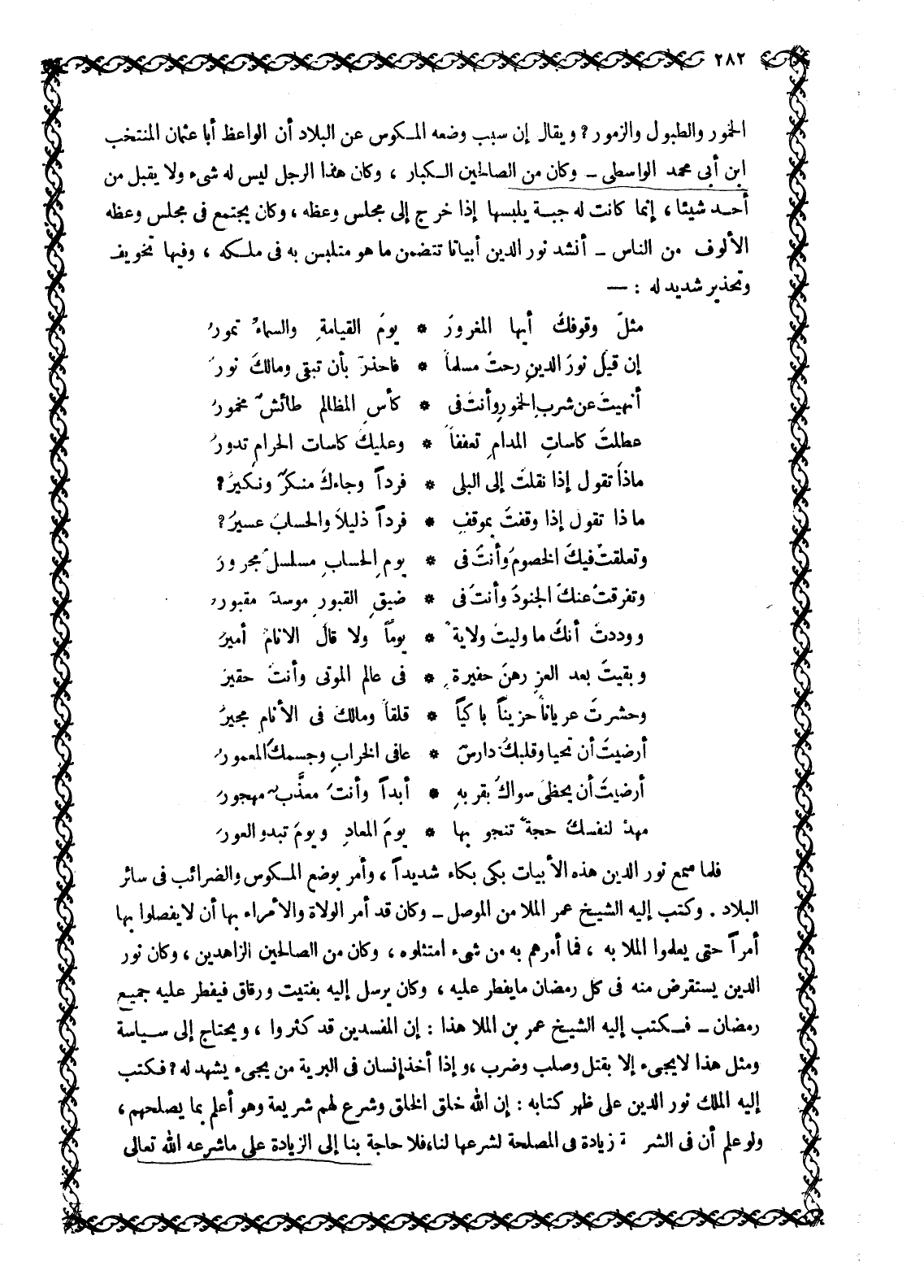 الْخُمُورُ وَالطُّبُولُ وَالزَّمُورُ؟ وَيُقَالُ إِنَّ سَبَبَ وَضْعِهِ المكوس عن البلاد أن الواعظ أبا عثمان المنتخب ابن أَبِي مُحَمَّدٍ الْوَاسِطِيَّ- وَكَانَ مِنَ الصَّالِحِينَ الْكِبَارِ، وكان هذا الرجل ليس له شيء ولا يقبل من أحد شيئا، إنما كانت له جبة يلبسها إذا خرج إلى مجلس وعظه، وكان يجتمع في مجلس وعظه الألوف من الناس- أنشد نور الدين أبياتا تتضمن ما هو متلبس به في ملكه، وفيها تخويف وتحذير شديد له: -