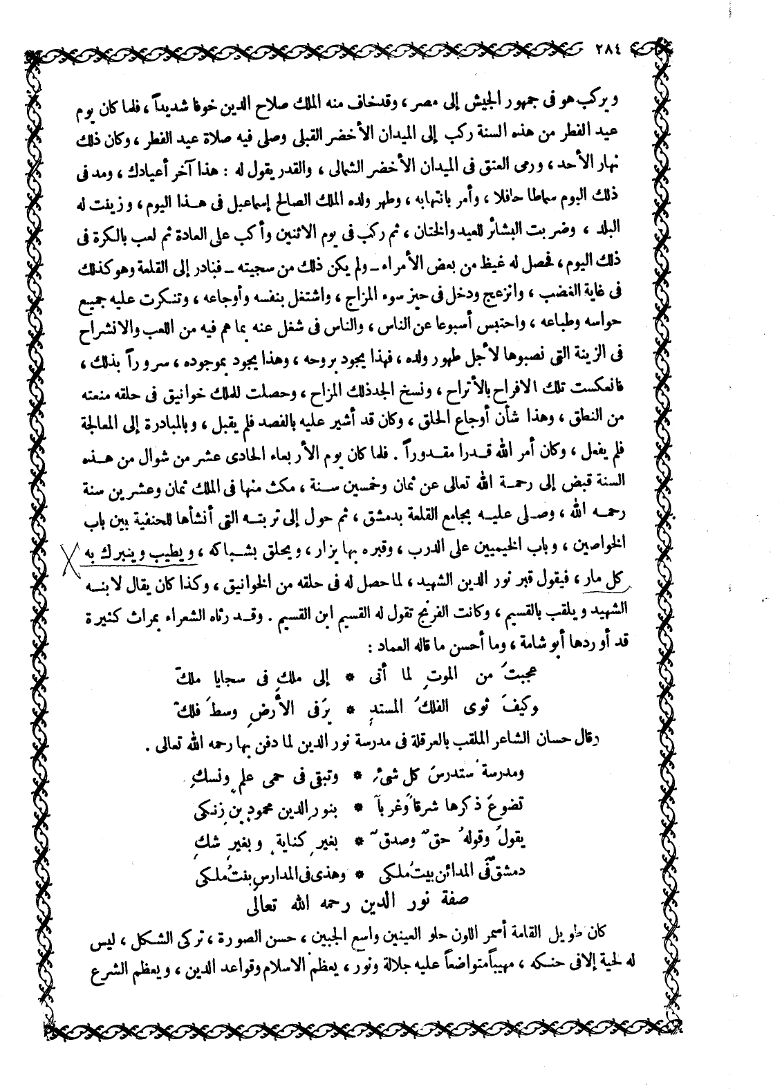 كل مار، فيقول قبر نُورُ الدِّينِ الشَّهِيدُ، لِمَا حَصَلَ لَهُ فِي حلقه من الخوانيق، وكذا كان يقال لابنه الشهيد ويلقب بالقسيم، وكانت الفرنج تقول له القسيم ابن القسيم. وَقَدْ رَثَاهُ الشُّعَرَاءُ بِمَرَاثٍ كَثِيرَةٍ قَدْ أَوْرَدَهَا أبو شامة، وما أحسن ما قاله العماد: