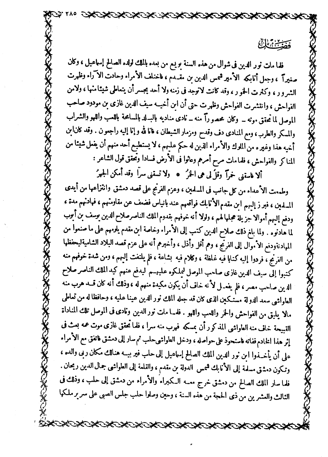 فلما مات نُورُ الدِّينِ فِي شَوَّالٍ مِنْ هَذِهِ السَّنَةِ بُويِعَ مِنْ بَعْدِهِ بِالْمُلْكِ لِوَلَدِهِ الصَّالِحِ إِسْمَاعِيلَ، وَكَانَ صَغِيرًا، وَجَعَلَ أَتَابِكَهُ الْأَمِيرَ شَمْسَ الدِّينِ بن مقدم، فاختلف الأمراء وحادت الآراء وظهرت الشرور، وكثرت الخمور، وقد كانت لا توجد في زمنه ولا أحد يجسر أن يتعاطى شيئا منها، ولا من الفواحش، وانتشرت الفواحش وظهرت حَتَّى إِنَّ ابْنَ أَخِيهِ سَيْفَ الدِّينِ غَازِيَّ بن مودود صاحب الموصل لما تحقق موته- وَكَانَ مَحْصُورًا مِنْهُ- نَادَى مُنَادِيهِ بِالْبَلَدِ بِالْمُسَامَحَةِ باللعب واللهو والشراب والمسكر والطرب، ومع المنادي دف وقدح ومزمار الشيطان، ف إِنَّا لِلَّهِ وَإِنَّا إِلَيْهِ راجِعُونَ 2: 156. وَقَدْ كَانَ ابْنُ أَخِيهِ هَذَا وَغَيْرُهُ مِنَ الْمُلُوكِ وَالْأُمَرَاءِ الَّذِينَ لَهُ حُكْمٌ عَلَيْهِمْ، لَا يَسْتَطِيعُ أَحَدٌ مِنْهُمْ أَنْ يَفْعَلَ شَيْئًا مِنَ الْمُنَاكِرِ وَالْفَوَاحِشِ، فَلَمَّا مات مرح أَمْرُهُمْ وَعَاثُوا فِي الْأَرْضِ فَسَادًا وَتَحَقَّقَ قَوْلُ الشَّاعِرِ: