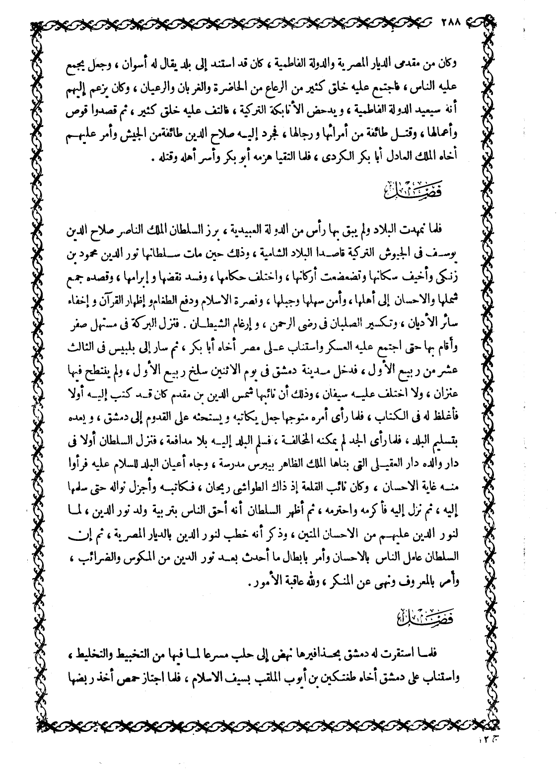 فلما تمهدت البلاد ولم يبق بها رأس من الدَّوْلَةِ الْعُبَيْدِيَّةِ، بَرَزَ السُّلْطَانُ الْمَلِكُ النَّاصِرُ صَلَاحُ الدِّينِ يُوسُفُ فِي الْجُيُوشِ التُّرْكِيَّةِ قَاصِدًا الْبِلَادَ الشَّامِيَّةَ، وَذَلِكَ حِينَ مَاتَ سُلْطَانُهَا نُورُ الدِّينِ مَحْمُودُ بْنُ زَنْكِيِّ وَأُخِيفَ سُكَّانُهَا وَتَضَعْضَعَتْ أَرْكَانُهَا، واختلف حكامها، وفسد نقضها وإبرامها، وقصده جَمْعُ شَمْلِهَا وَالْإِحْسَانُ إِلَى أَهْلِهَا، وَأَمْنُ سَهْلِهَا وَجَبَلِهَا، وَنُصْرَةُ الْإِسْلَامِ وَدَفْعُ الطَّغَامِ وَإِظْهَارُ الْقُرَآنِ وإخفاء سائر الأديان، وتكسير الصلبان في رضى الرحمن، وإرغام الشيطان. فنزل الْبِرْكَةِ فِي مُسْتَهَلِّ صَفَرٍ وَأَقَامَ بِهَا حَتَّى اجتمع عليه العسكر واستناب على مصر أخاه أَبَا بَكْرٍ، ثُمَّ سَارَ إِلَى بِلْبِيسَ فِي الثالث عشر من ربيع الأول، فَدَخَلَ مَدِينَةَ دِمَشْقَ فِي يَوْمِ الِاثْنَيْنِ سَلْخَ رَبِيعٍ الْأَوَّلِ، وَلَمْ يَنْتَطِحْ فِيهَا عَنْزَانِ، وَلَا اخْتَلَفَ عَلَيْهِ سَيْفَانِ، وَذَلِكَ أَنَّ نَائِبَهَا شَمْسَ الدِّينِ بْنَ مُقَدَّمٍ كَانَ قَدْ كَتَبَ إِلَيْهِ أَوَّلًا فَأَغْلَظَ لَهُ فِي الْكِتَابِ، فَلَمَّا رَأَى أَمْرَهُ مُتَوَجِّهًا جَعَلَ يُكَاتِبُهُ وَيَسْتَحِثُّهُ عَلَى الْقُدُومِ إِلَى دِمَشْقَ، وَيَعِدُهُ بِتَسْلِيمِ الْبَلَدِ، فَلَمَّا رَأَى الْجِدَّ لَمْ يُمْكِنْهُ الْمُخَالَفَةُ، فَسَلَّمَ الْبَلَدَ إِلَيْهِ بِلَا مُدَافَعَةٍ، فَنَزَلَ السُّلْطَانُ أَوَّلًا فِي دَارِ والده دار العقيلي التي بناها الملك الظاهر بيبرس مدرسة، وجاء أعيان البلد للسلام عليه فرأوا منه غاية الإحسان، وكان نائب القلعة إذ ذاك الطواشى ريحان، فكاتبه وأجزل نواله حتى سلمها إليه، ثم نزل إليه فأكرمه واحترمه، ثم أظهر السلطان أَنَّهُ أَحَقُّ النَّاسِ بِتَرْبِيَةِ وَلَدِ نُورِ الدِّينِ، لِمَا لِنُورِ الدِّينِ عَلَيْهِمْ مِنَ الْإِحْسَانِ الْمَتِينِ، وَذَكَرَ أَنَّهُ خَطَبَ لِنُورِ الدِّينِ بِالدِّيَارِ الْمِصْرِيَّةِ، ثم إن السلطان عَامَلَ النَّاسَ بِالْإِحْسَانِ وَأَمَرَ بِإِبْطَالِ مَا أُحْدِثَ بعد نور الدين من المكوس والضرائب، وَأَمَرَ بِالْمَعْرُوفِ وَنَهَى عَنِ الْمُنْكَرِ، وللَّه عَاقِبَةُ الْأُمُورِ.