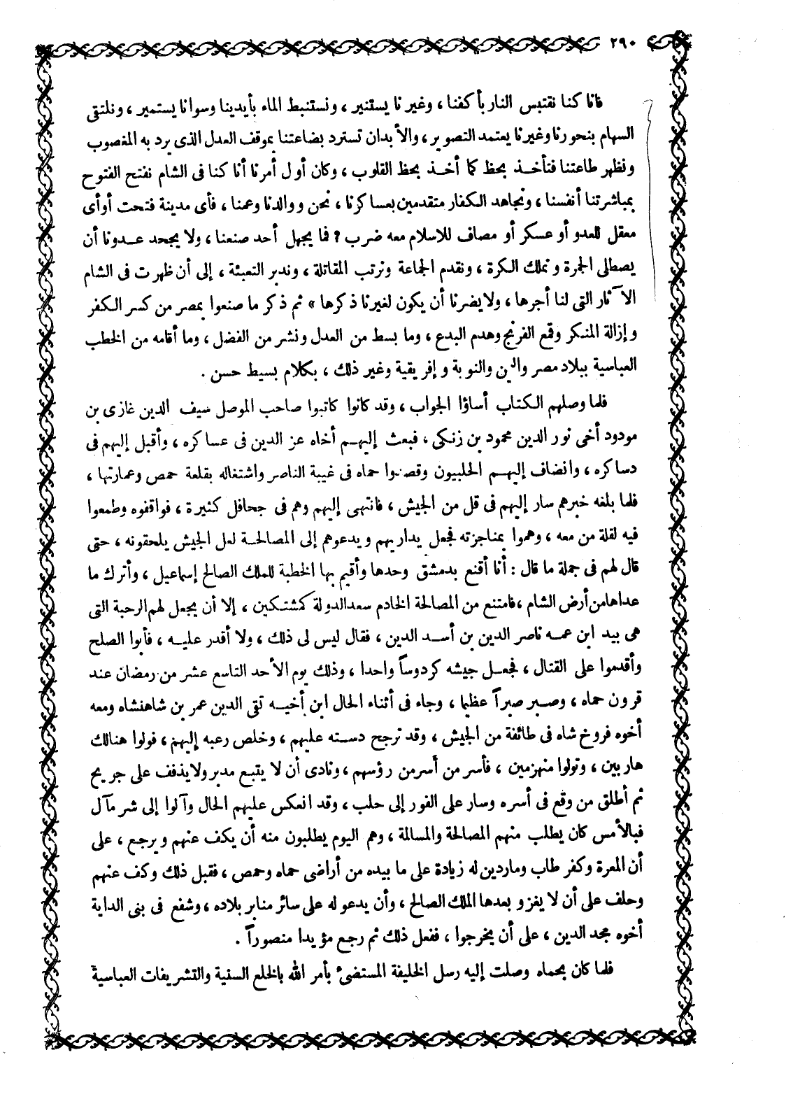 فَإِنَّا كُنَّا نَقْتَبِسُ النَّارَ بِأَكُفِّنَا، وَغَيْرُنَا يَسْتَنِيرُ، ونستنبط الماء بأيدينا وسوانا يستمير، ونلتقي السهام بنحورنا وغيرنا يعتمد التصوير، والأبدان تسترد بضاعتنا بموقف العدل الّذي يرد به المغصوب ونظهر طاعتنا فتأخذ بحظ كما أخذ بِحَظِّ الْقُلُوبِ، وَكَانَ أَوَّلَ أَمْرِنَا أَنَّا كُنَّا في الشام نفتح الفتوح بمباشرتنا أنفسنا، وَنُجَاهِدُ الْكَفَّارَ مُتَقَدِّمِينَ بِعَسَاكِرِنَا، نَحْنُ وَوَالِدُنَا وَعَمُّنَا، فأى مدينة فتحت أو أي معقل للعدو أو عسكر أو مصاف للإسلام معه ضرب؟ فَمَا يَجْهَلُ أَحَدٌ صُنْعَنَا، وَلَا يَجْحَدُ عَدُوُّنَا أن يصطلى الجمرة ونملك الكرة، ونقدم الْجَمَاعَةَ وَنُرَتِّبُ الْمُقَاتِلَةَ، وَنُدَبِّرُ التَّعْبِئَةَ، إِلَى أَنْ ظَهَرَتْ فِي الشَّامِ الْآثَارُ الَّتِي لَنَا أَجْرُهَا، وَلَا يَضُرُّنَا أَنْ يَكُونَ لِغَيْرِنَا ذِكْرُهَا» ثُمَّ ذَكَرَ مَا صَنَعُوا بِمِصْرَ مِنْ كَسْرِ الْكُفْرِ وإزالة المنكر وقمع الفرنج وهدم البدع، وما بسط من العدل ونشر مِنَ الْفَضْلِ، وَمَا أَقَامَهُ مِنَ الْخُطَبِ الْعَبَّاسِيَّةِ ببلاد مصر والدين وَالنُّوبَةِ وَإِفْرِيقِيَّةَ وَغَيْرِ ذَلِكَ، بِكَلَامٍ بَسِيطٍ حَسَنٍ.