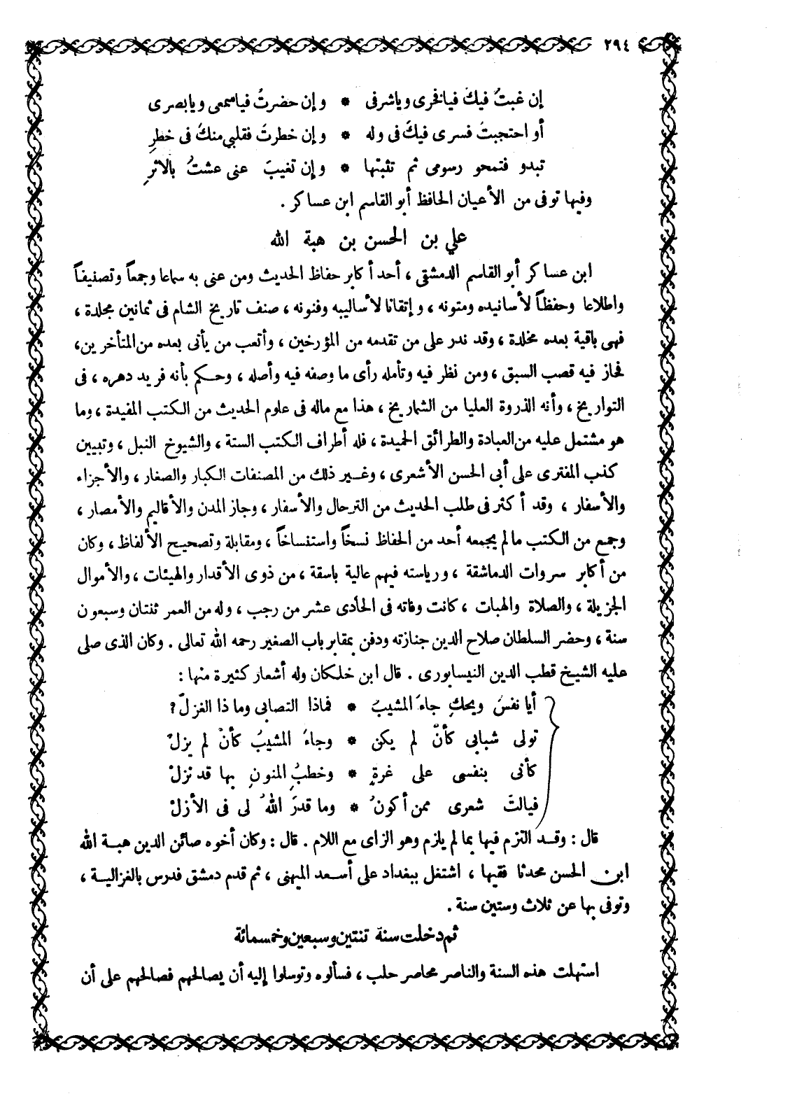 ابن عَسَاكِرَ أَبُو الْقَاسِمِ الدِّمَشْقِيُّ، أَحَدُ أَكَابِرِ حُفَّاظِ الْحَدِيثِ وَمَنْ عُنِيَ بِهِ سَمَاعًا وَجَمْعًا وَتَصْنِيفًا وَاطِّلَاعًا وَحِفْظًا لِأَسَانِيدِهِ وَمُتُونِهِ، وَإِتْقَانًا لِأَسَالِيبِهِ وَفُنُونِهِ، صَنَّفَ تَارِيخَ الشَّامِ فِي ثَمَانِينَ مُجَلَّدَةً، فَهِيَ باقية بعده مخلدة، وقد ندر عَلَى مَنْ تَقَدَّمَهُ مِنَ الْمُؤَرِّخِينَ، وَأَتْعَبَ مَنْ يأتى بعده من المتأخرين، فحاز فيه قصب السبق، ومن نظر فيه وتأمله رأى ما وصفه فيه وأصله، وحكم بأنه فريد دهره، في التواريخ، وأنه الذروة العليا من الشماريخ، هذا مع ماله في علوم الحديث من الكتب المفيدة، وما هو مشتمل عَلَيْهِ مِنَ الْعِبَادَةِ وَالطَّرَائِقِ الْحَمِيدَةِ، فَلَهُ أَطْرَافُ الكتب الستة، والشيوخ النبل، وتبيين كَذِبِ الْمُفْتَرِي عَلَى أَبِي الْحَسَنِ الْأَشْعَرِيِّ، وَغَيْرُ ذَلِكَ مِنَ الْمُصَنَّفَاتِ الْكِبَارِ وَالصِّغَارِ، وَالْأَجْزَاءِ وَالْأَسْفَارِ، وَقَدْ أَكْثَرَ فِي طَلَبِ الْحَدِيثِ مِنَ التِّرْحَالِ والأسفار، وجاز الْمُدُنَ وَالْأَقَالِيمَ وَالْأَمْصَارَ، وَجَمَعَ مِنَ الْكُتُبِ مَا لَمْ يَجْمَعْهُ أَحَدٌ مِنَ الْحُفَّاظِ نَسْخًا وَاسْتِنْسَاخًا، ومقابلة وتصحيح الألفاظ، وكان من أكابر سروات الدَّمَاشِقَةِ، وَرِيَاسَتُهُ فِيهِمْ عَالِيَةٌ بَاسِقَةٌ، مِنْ ذَوِي الأقدار والهيئات، والأموال الجزيلة، والصلاة والهبات، كَانَتْ وَفَاتُهُ فِي الْحَادِي عَشَرَ مِنْ رَجَبٍ، وله من العمر ثنتان وَسَبْعُونَ سَنَةً، وَحَضَرَ السُّلْطَانُ صَلَاحُ الدِّينِ جِنَازَتَهُ وَدُفِنَ بِمَقَابِرِ بَابِ الصَّغِيرِ رَحِمَهُ اللَّهُ تَعَالَى. وَكَانَ الَّذِي صَلَّى عَلَيْهِ الشَّيْخُ قُطْبُ الدِّينِ النَّيْسَابُورِيُّ. قَالَ ابْنُ خَلِّكَانَ وَلَهُ أَشْعَارٌ كَثِيرَةٌ منها: