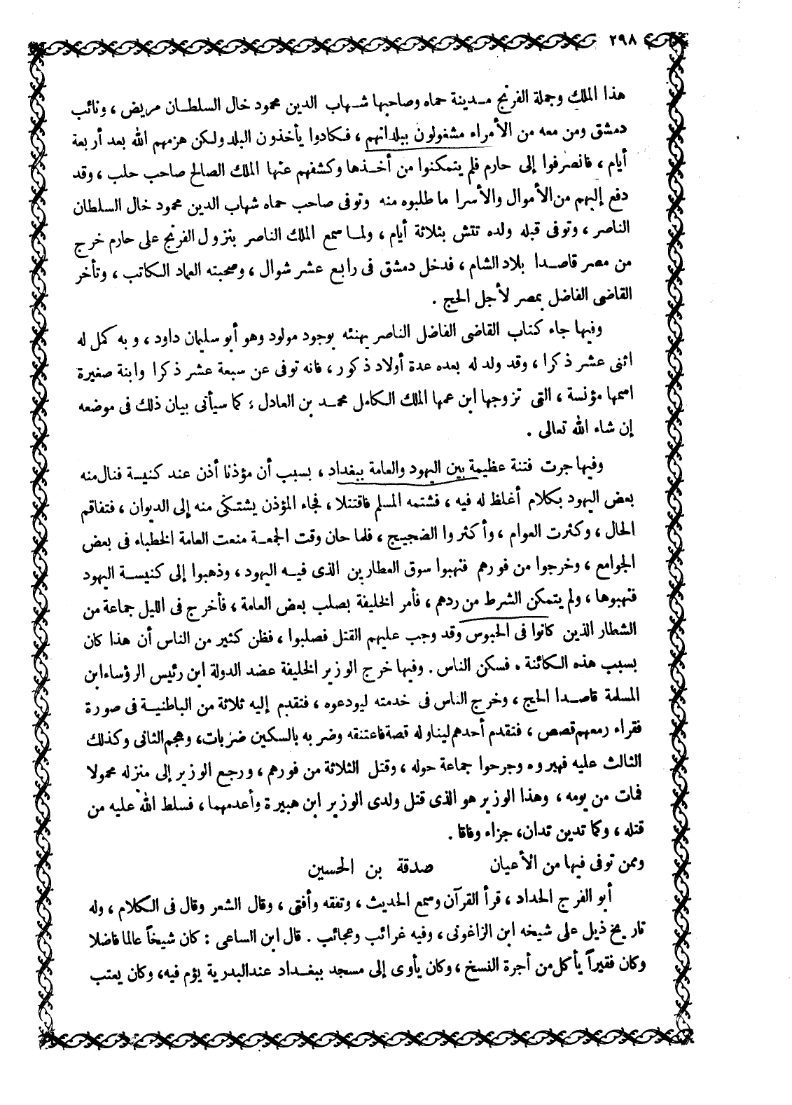 وَفِيهَا جَرَتْ فِتْنَةٌ عَظِيمَةٌ بَيْنَ الْيَهُودِ وَالْعَامَّةِ بِبَغْدَادَ، بسبب أن مؤذنا أذن عند كنيسة فنال منه بعض اليهود بكلام أغلظ له فيه، فَشَتَمَهُ الْمُسْلِمُ فَاقْتَتَلَا، فَجَاءَ الْمُؤَذِّنُ يَشْتَكِي مِنْهُ إلى الديوان، فتفاقم الحال، وكثرت العوام، وأكثروا الضجيج، فلما حان وقت الجمعة منعت العامة الخطباء فِي بَعْضِ الْجَوَامِعِ، وَخَرَجُوا مِنْ فَوْرِهِمْ فَنَهَبُوا سُوقَ الْعَطَّارِينَ الَّذِي فِيهِ الْيَهُودُ، وَذَهَبُوا إِلَى كَنِيسَةِ الْيَهُودِ فَنَهَبُوهَا، وَلَمْ يَتَمَكَّنِ الشُّرَطُ مِنْ رَدِّهِمْ، فَأَمَرَ الْخَلِيفَةُ بِصَلْبِ بَعْضِ الْعَامَّةِ، فَأَخْرَجَ فِي اللَّيْلِ جَمَاعَةً مِنَ الشُّطَّارِ الَّذِينَ كَانُوا فِي الْحُبُوسِ وَقَدْ وَجَبَ عَلَيْهِمُ الْقَتْلُ فَصُلِبُوا، فَظَنَّ كَثِيرٌ مِنَ النَّاسِ أَنَّ هَذَا كَانَ بسبب هذه الكائنة، فسكن الناس. وفيها خرج الوزير الْخَلِيفَةِ عَضُدُ الدَّوْلَةِ ابْنُ رَئِيسِ الرُّؤَسَاءِ ابْنُ الْمُسْلِمَةِ قَاصِدًا الْحَجَّ، وَخَرَجَ النَّاسُ فِي خِدْمَتِهِ لِيُوَدِّعُوهُ، فَتَقَدَّمَ إِلَيْهِ ثَلَاثَةٌ مِنَ الْبَاطِنِيَّةِ فِي صُورَةِ فُقَرَاءَ وَمَعَهُمْ قِصَصٌ، فَتَقَدَّمَ أَحَدُهُمْ لِيُنَاوِلَهُ قصة فاعتنقه وضربه بالسكين ضربات، وهجم الثاني وكذلك الثالث عليه فَهَبَرُوهُ وَجَرَحُوا جَمَاعَةً حَوْلَهُ، وَقُتِلَ الثَّلَاثَةُ مِنْ فورهم، ورجع الوزير إلى منزله محمولا فمات من يَوْمِهِ، وَهَذَا الْوَزِيرُ هُوَ الَّذِي قَتَلَ وَلَدَيِ الْوَزِيرِ ابْنِ هُبَيْرَةَ وَأَعْدَمَهُمَا، فَسَلَّطَ اللَّهُ عَلَيْهِ مَنْ قَتَلَهُ، وَكَمَا تَدِينُ تُدَانُ، جَزَاءً وِفَاقًا.