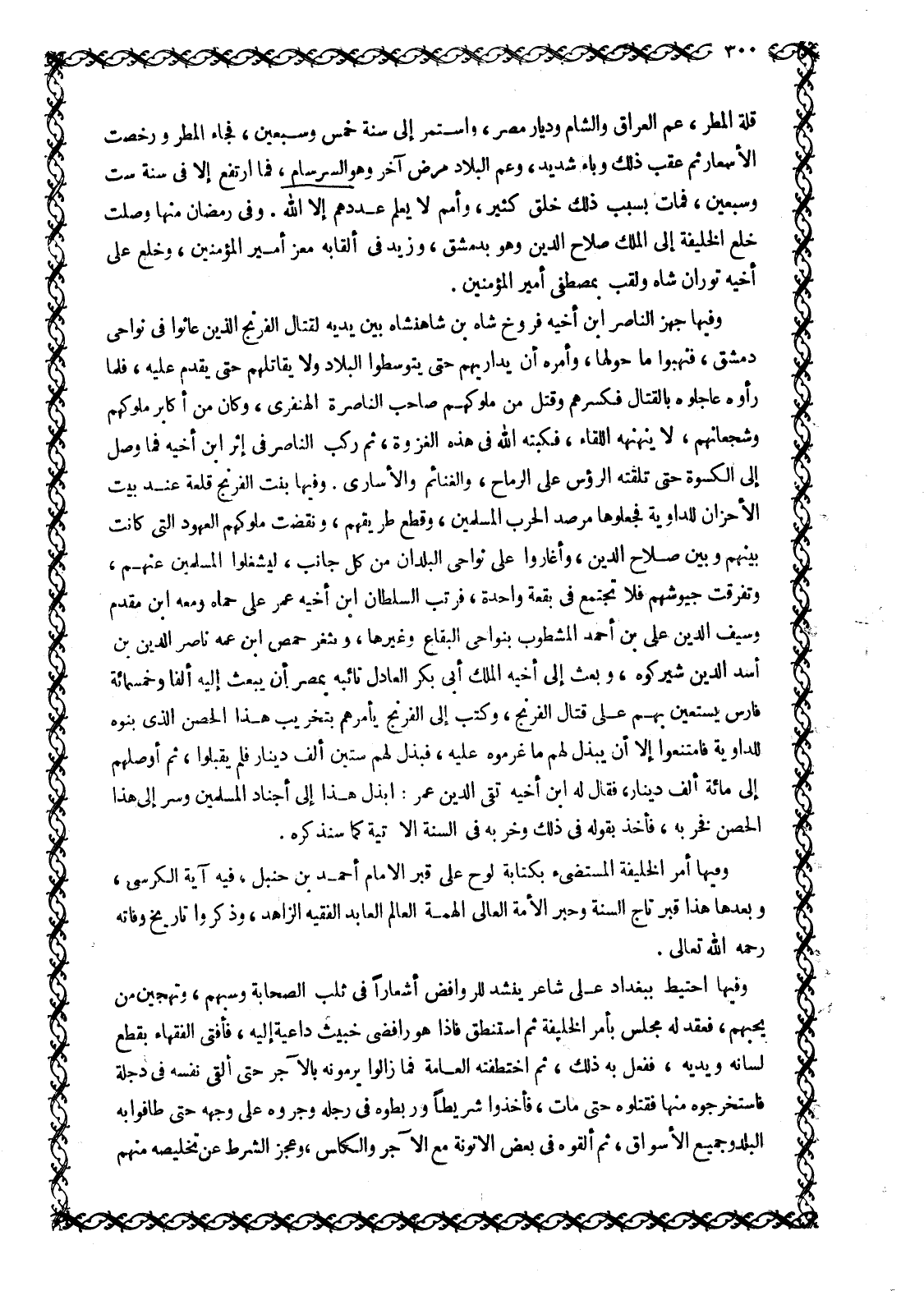 قِلَّةِ الْمَطَرِ، عَمَّ الْعِرَاقَ وَالشَّامَ وَدِيَارَ مِصْرَ، وَاسْتَمَرَّ إِلَى سَنَةِ خَمْسٍ وَسَبْعِينَ، فَجَاءَ الْمَطَرُ ورخصت الأسعار ثم عقب ذلك وباء شديد، وعم البلاد مرض آخر وَهُوَ السِّرْسَامُ، فَمَا ارْتَفَعَ إِلَّا فِي سَنَةِ سِتٍّ وَسَبْعِينَ، فَمَاتَ بِسَبَبِ ذَلِكَ خَلْقٌ كَثِيرٌ، وأمم لا يعلم عددهم إلا الله. وَفِي رَمَضَانَ مِنْهَا وَصَلَتْ خُلَعُ الْخَلِيفَةِ إِلَى الملك صلاح الدين وهو بدمشق، وَزِيدَ فِي أَلْقَابِهِ مُعِزُّ أَمِيرِ الْمُؤْمِنِينَ، وَخَلَعَ على أخيه توران شاه وَلُقِّبَ بِمُصْطَفَى أَمِيرِ الْمُؤْمِنِينَ.