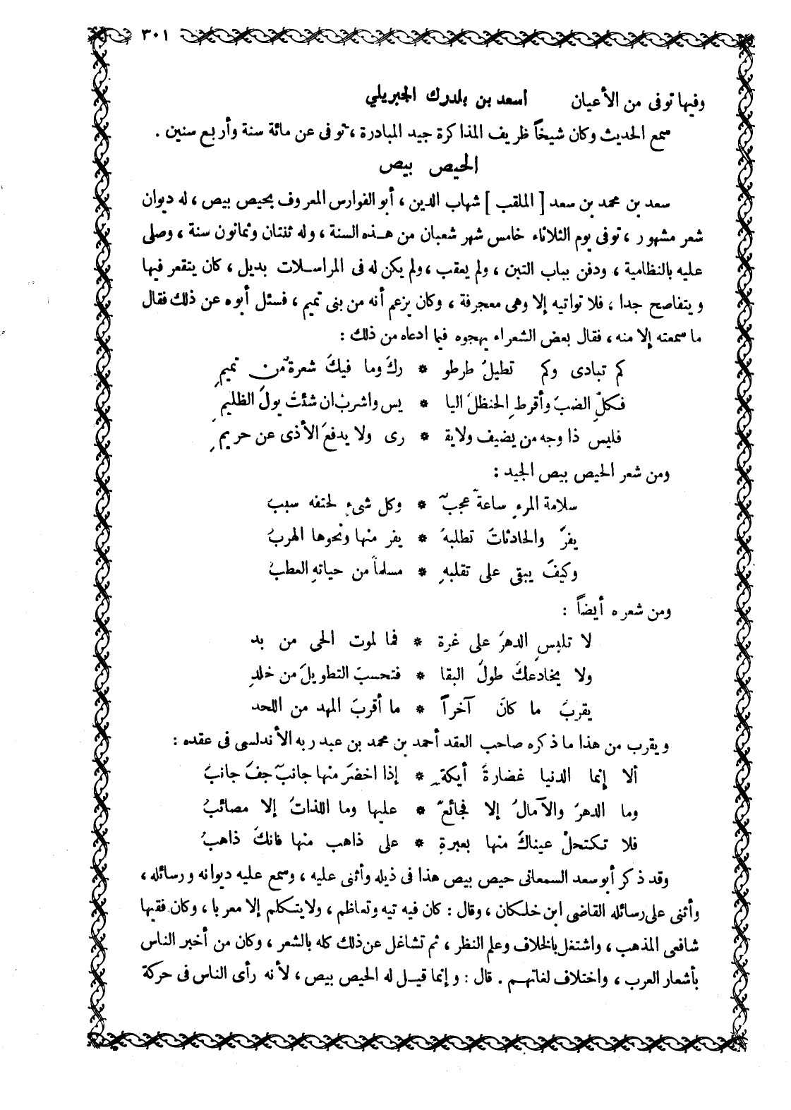 سَعْدُ بْنُ مُحَمَّدِ بْنِ سَعْدٍ [الملقب] شهاب الدين، أبو الفوارس المعروف بحيص بيص، له ديوان شعر مشهور، توفى يوم الثلاثاء خامس شهر شعبان من هذه السنة، وله ثنتان وَثَمَانُونَ سَنَةً، وَصُلِّيَ عَلَيْهِ بِالنِّظَامِيَّةِ، وَدُفِنَ بِبَابِ التِّبْنِ، وَلَمْ يُعْقِبْ، وَلَمْ يَكُنْ لَهُ فِي الْمُرَاسَلَاتِ بَدِيلٌ، كَانَ يَتَقَعَّرُ فِيهَا وَيَتَفَاصَحُ جِدًّا، فَلَا تُوَاتِيهِ إِلَّا وَهِيَ مُعَجْرَفَةٌ، وَكَانَ يَزْعُمُ أَنَّهُ مِنْ بَنِي تَمِيمٍ، فَسُئِلَ أَبُوهُ عَنْ ذَلِكَ فَقَالَ مَا سَمِعْتُهُ إِلَّا مِنْهُ، فَقَالَ بَعْضُ الشُّعَرَاءِ يَهْجُوهُ فِيمَا ادَّعَاهُ مِنْ ذَلِكَ: