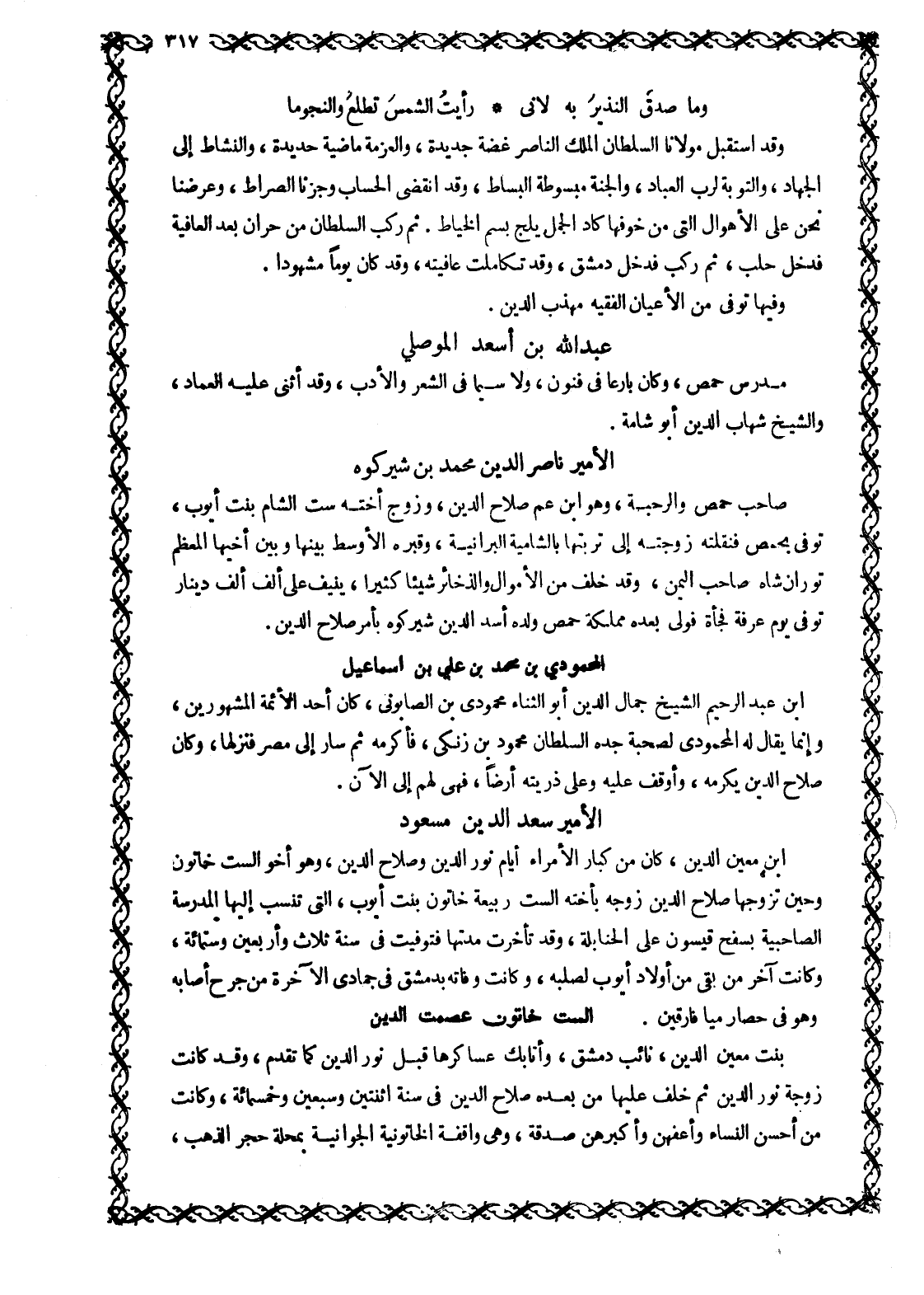 صَاحِبُ حِمْصَ وَالرَّحْبَةِ، وَهُوَ ابْنُ عَمِّ صَلَاحِ الدِّينِ، وَزَوْجِ أُخْتِهِ سِتِّ الشَّامِ بِنْتِ أيوب، توفى بحمص فنقلته زوجته إلى تربتها بالشامية البرانية، وقبره الأوسط بينها وبين أخيها المعظم توران شاه صاحب اليمن، وقد خلف مِنَ الْأَمْوَالِ وَالذَّخَائِرِ شَيْئًا كَثِيرًا، يُنَيِّفُ عَلَى ألف ألف دينار توفى يوم عرفة فجأة فولى بَعْدِهِ مَمْلَكَةَ حِمْصَ وَلَدُهُ أَسَدُ الدِّينِ شِيرَكُوهْ بأمر صلاح الدين.