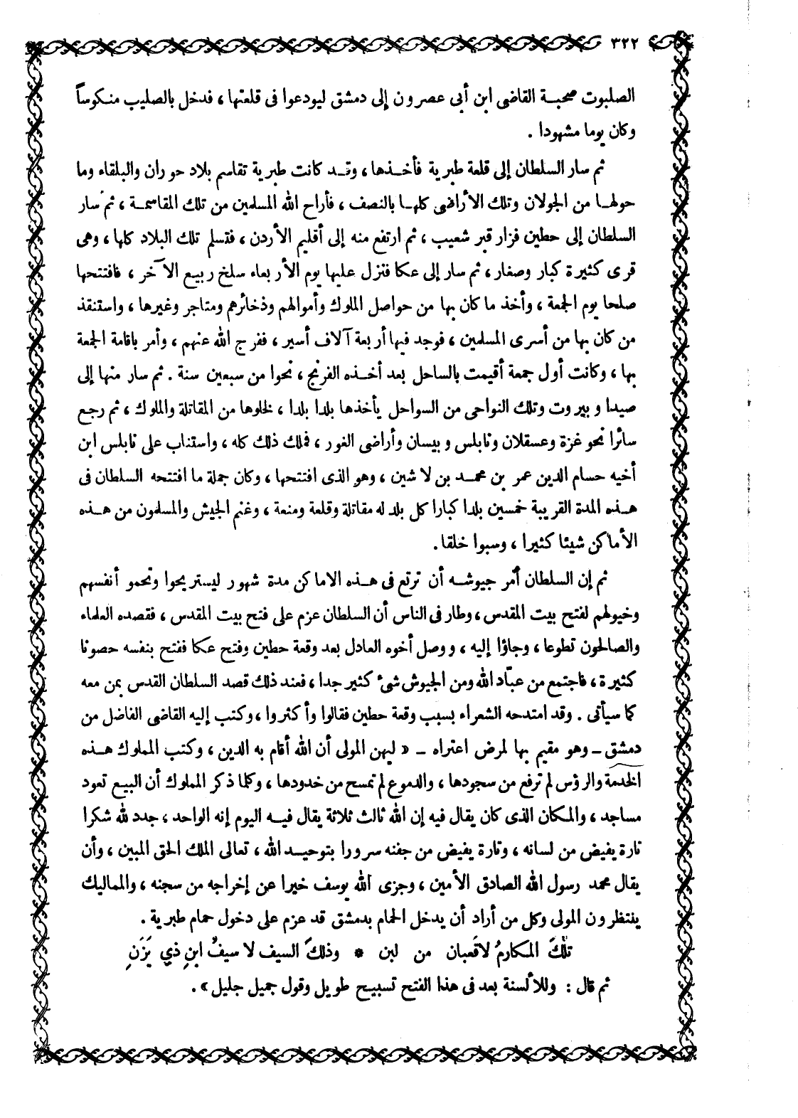 ثم إن السلطان أمر جيوشه أن ترتع في هذه الأماكن مدة شهور ليستريحوا وتحمو أنفسهم وخيولهم لفتح بيت المقدس، وَطَارَ فِي النَّاسِ أَنَّ السُّلْطَانَ عَزَمَ عَلَى فتح بيت المقدس، فقصده العلماء والصالحون تطوعا، وجاءوا إليه، ووصل أَخُوهُ الْعَادِلُ بَعْدَ وَقْعَةِ حِطِّينَ وَفَتَحَ عَكَّا ففتح بنفسه حصونا كثيرة، فاجتمع من عبّاد الله ومن الجيوش شيء كثير جدا، فعند ذلك قصد السلطان القدس بمن معه كما سيأتي. وقد امتدحه الشعراء بسبب وقعة حطين فقالوا وأكثروا، وكتب إليه الْقَاضِي الْفَاضِلُ مِنْ دِمَشْقَ- وَهُوَ مُقِيمٌ بِهَا لمرض اعتراه- «ليهن المولى أن الله أقام به الدين، وكتب المملوك هذه الخدمة والرءوس لَمْ تُرْفَعْ مِنْ سُجُودِهَا، وَالدُّمُوعُ لَمْ تُمْسَحْ من خدودها، وكلما ذكر المملوك أن البيع تعود مَسَاجِدُ، وَالْمَكَانُ الَّذِي كَانَ يُقَالُ فِيهِ إِنَّ الله ثالث ثلاثة يقال فيه اليوم إِنَّهُ الْوَاحِدُ، جَدَّدَ للَّه شُكْرًا تَارَةً يَفِيضُ من لسانه، وتارة يفيض من جفنه سرورا بتوحيد الله، تعالى الملك الحق المبين، وأن يقال محمد رسول الله الصادق الأمين، وجزى الله يوسف خيرا من إخراجه من سجنه، والمماليك ينتظرون المولى وكل مَنْ أَرَادَ أَنْ يَدْخُلَ الْحَمَّامَ بِدِمَشْقَ قَدْ عزم عَلَى دُخُولِ حَمَّامِ طَبَرِيَّةَ.
