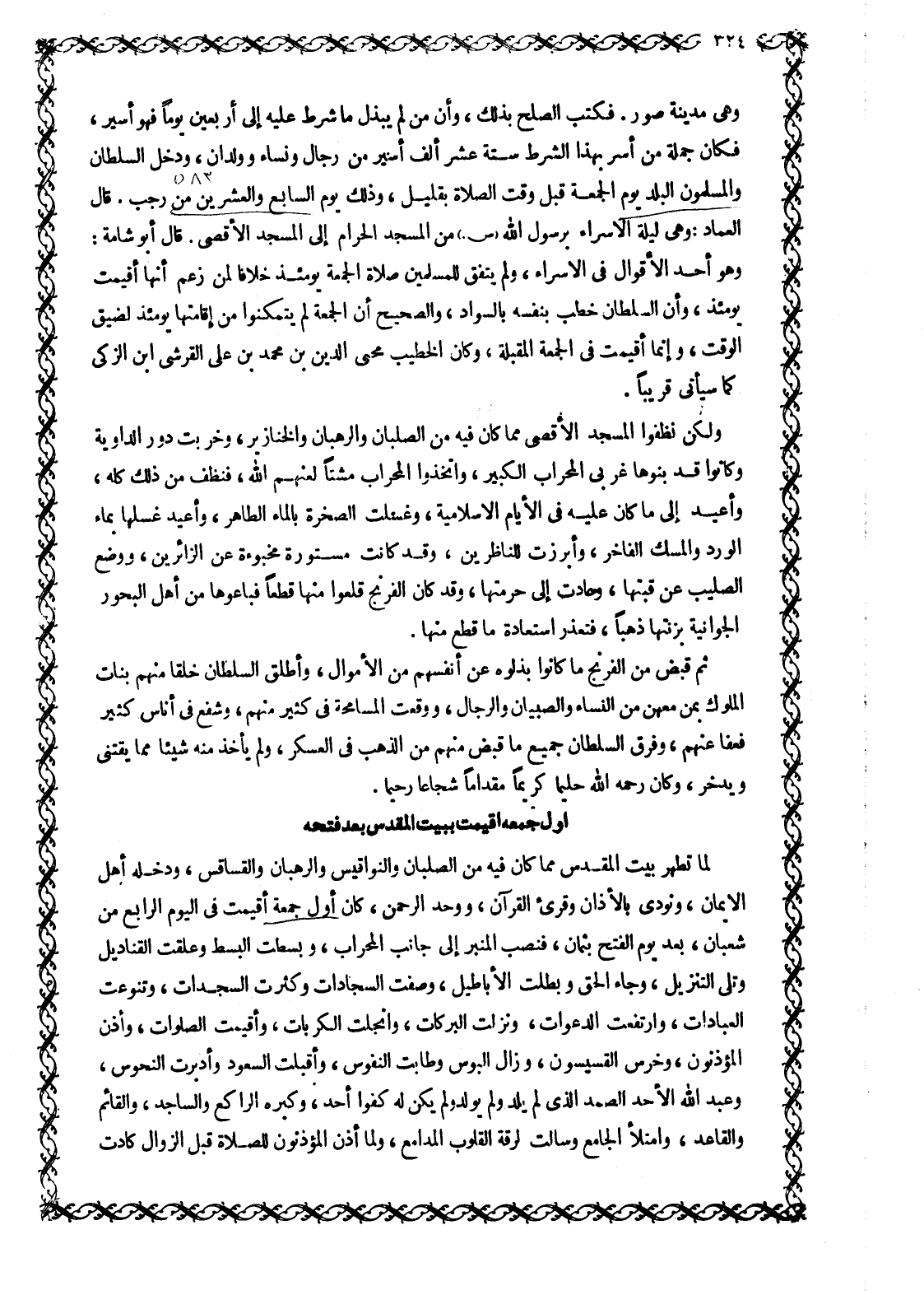 لما تطهر بيت الْمُقَدَّسُ مِمَّا كَانَ فِيهِ مِنَ الصُّلْبَانِ وَالنَّوَاقِيسِ والرهبان والقساقس، ودخله أهل الايمان، ونودي بالأذان وقرئ القرآن، ووحد الرحمن، كان أول جمعة أقيمت فِي الْيَوْمِ الرَّابِعِ مِنْ شَعْبَانَ، بَعْدَ يَوْمِ الْفَتْحِ بِثَمَانٍ، فَنُصِبَ الْمِنْبَرُ إِلَى جَانِبِ الْمِحْرَابِ، وبسطت البسط وعلقت القناديل وتلى التنزيل، وجاء الحق وبطلت الْأَبَاطِيلُ، وَصُفَّتِ السَّجَّادَاتُ وَكَثُرَتِ السَّجَدَاتُ، وَتَنَوَّعَتِ الْعِبَادَاتُ، وارتفعت الدَّعَوَاتُ، وَنَزَلَتِ الْبَرَكَاتُ، وَانْجَلَتِ الْكُرُبَاتُ، وَأُقِيمَتِ الصَّلَوَاتُ، وأذن المؤذنون، وخرس القسيسون، وزال البوس وطابت النفوس، وأقبلت السعود وأدبرت النحوس، وعبد الله الْأَحَدُ الصَّمَدُ الَّذِي لَمْ يَلِدْ وَلَمْ يُولَدْ وَلَمْ يَكُنْ لَهُ كفوا أحد، وكبره الرَّاكِعُ وَالسَّاجِدُ، وَالْقَائِمُ وَالْقَاعِدُ، وَامْتَلَأَ الْجَامِعُ وَسَالَتْ لرقة القلوب المدامع، ولما أذن المؤذنون للصلاة قبل الزوال كادت