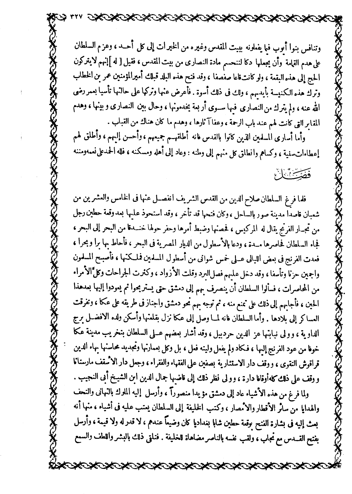 وأما أسارى المسلمين الذين كانوا بالقدس فإنه أطلقهم جميعهم، وأحسن إليهم، وأطلق لهم إعطاءات سنية، وكساهم وَانْطَلَقَ كُلٌّ مِنْهُمْ إِلَى وَطَنِهِ: وَعَادَ إِلَى أهله ومسكنه، فلله الحمد على نعمه ومننه