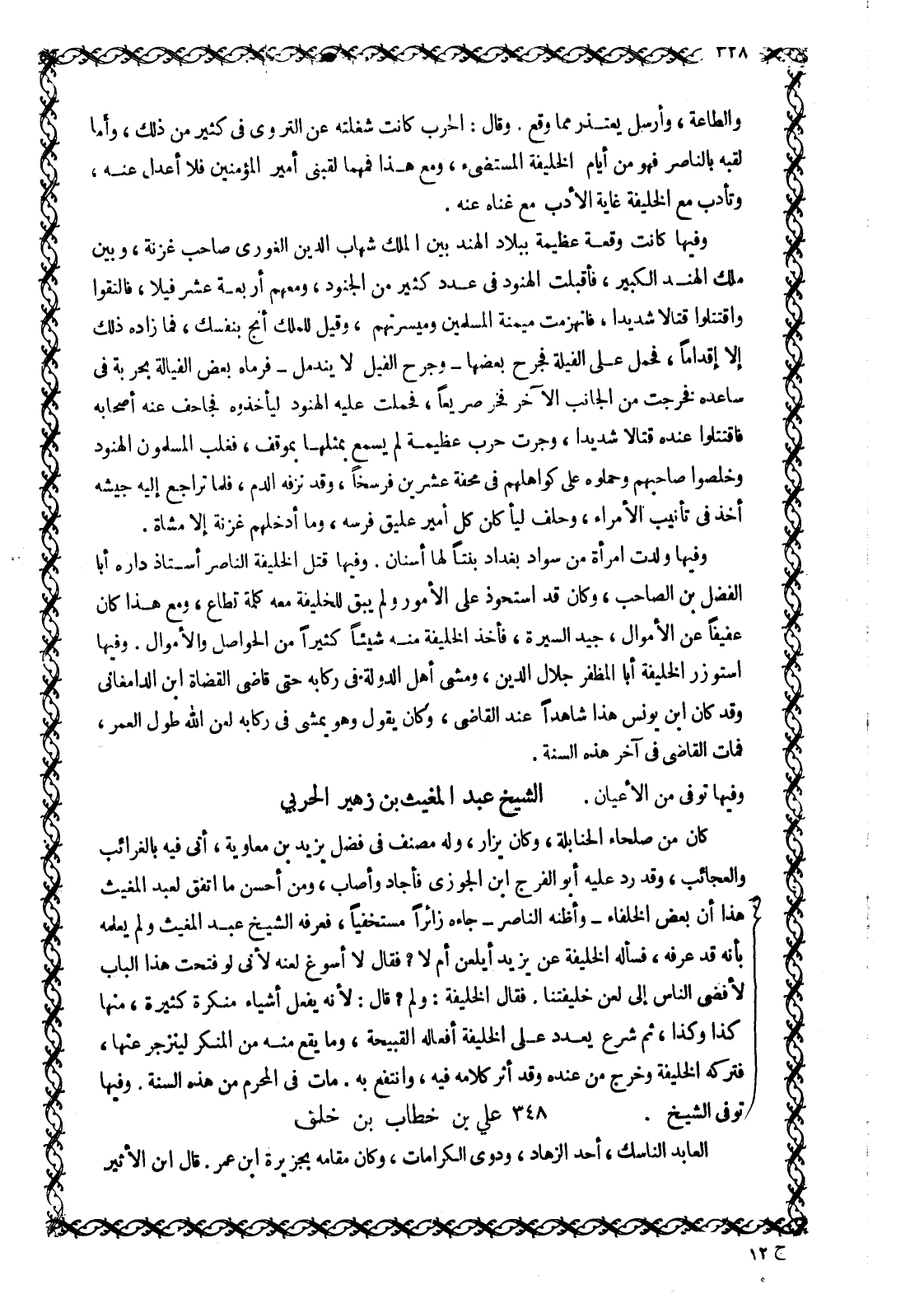 كَانَ مِنْ صُلَحَاءِ الْحَنَابِلَةِ، وَكَانَ يُزَارُ، وَلَهُ مُصَنَّفٌ فِي فَضْلِ يَزِيدَ بْنِ مُعَاوِيَةَ، أتى فيه بالغرائب والعجائب، وقد رد عليه أبو الفرج ابن الجوزي فَأَجَادَ وَأَصَابَ، وَمِنْ أَحْسَنِ مَا اتَّفَقَ لِعَبْدِ الْمُغِيثِ هَذَا أَنَّ بَعْضَ الْخُلَفَاءِ- وَأَظُنُّهُ النَّاصِرَ- جاءه زائرا مستخفيا، فعرفه الشيخ عبد المغيث ولم يعلمه بأنه قَدْ عَرَفَهُ، فَسَأَلَهُ الْخَلِيفَةُ عَنْ يَزِيدَ أَيُلْعَنُ أَمْ لَا؟ فَقَالَ لَا أُسَوِّغُ لَعْنَهُ لِأَنِّي لو فتحت هذا الباب لأفضى الناس إلى لعن خليفتنا. فقال الخليفة: وَلِمَ؟ قَالَ: لِأَنَّهُ يَفْعَلُ أَشْيَاءَ مُنْكَرَةً كَثِيرَةً، مِنْهَا كَذَا وَكَذَا، ثُمَّ شَرَعَ يُعَدِّدُ عَلَى الخليفة أفعاله القبيحة، وما يقع منه من المنكر لِيَنْزَجِرَ عَنْهَا، فَتَرَكَهُ الْخَلِيفَةُ وَخَرَجَ مِنْ عِنْدِهِ وقد أثر كلامه فيه، وانتفع به. مات في المحرم من هذه السنة. وَفِيهَا تُوُفِّيَ الشَّيْخُ