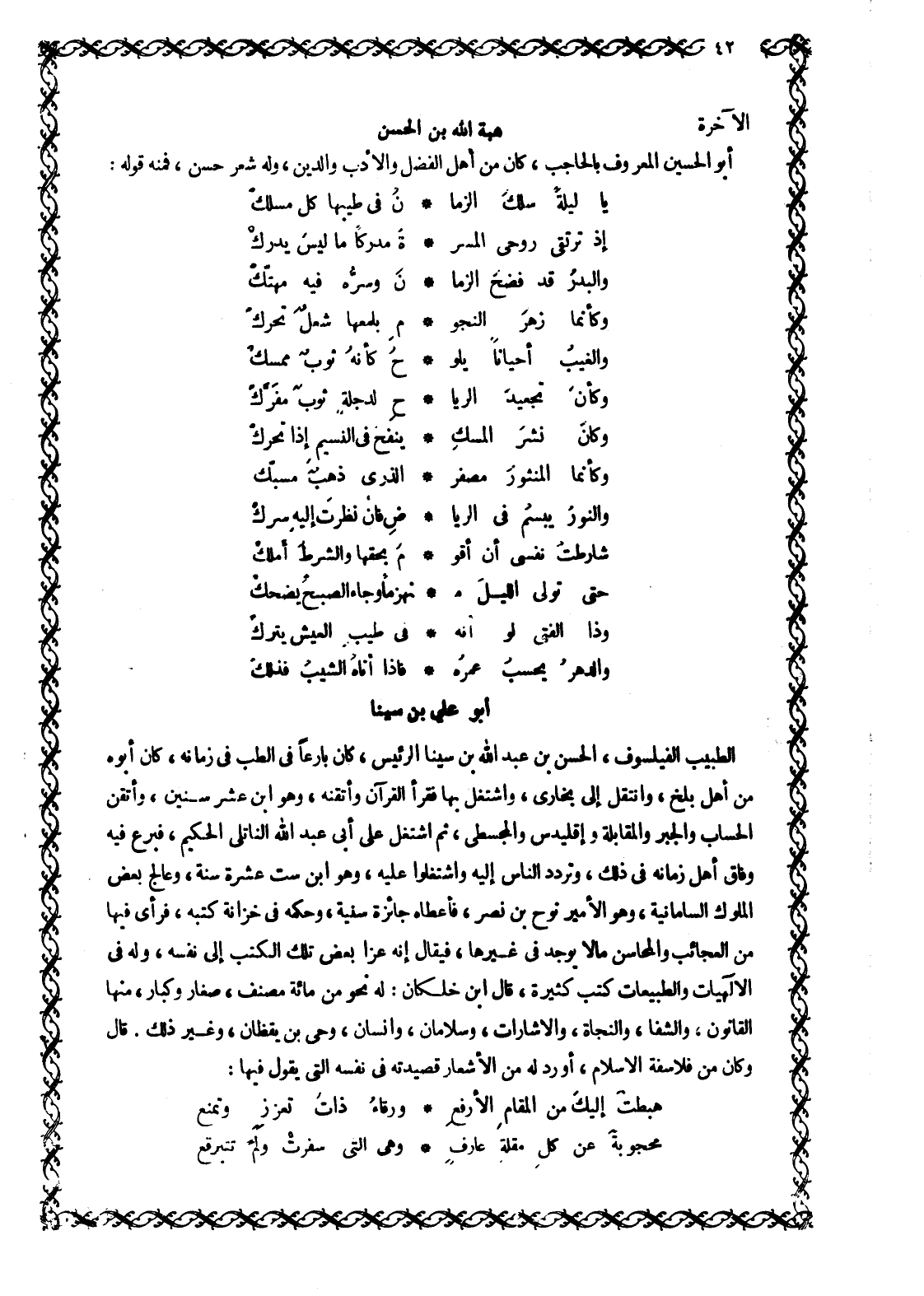 الطبيب الفيلسوف، الحسن بن عبد الله بن سينا الرئيس، كان بارعا في الطب فِي زَمَانِهِ، كَانَ أَبُوهُ مِنْ أَهْلِ بَلْخَ، وانتقل إلى بخارى، واشتغل بها فقرأ القرآن وأتقنه، وهو ابن عشر سنين، وأتقن الحساب والجبر والمقابلة وإقليدس والمجسطي، ثُمَّ اشْتَغَلَ عَلَى أَبِي عَبْدِ اللَّهِ النَّاتِلِيِّ الحكيم، فبرع فيه وفاق أهل زمانه في ذلك، وَتَرَدَّدَ النَّاسُ إِلَيْهِ وَاشْتَغَلُوا عَلَيْهِ، وَهُوَ ابْنُ ست عشرة سنة، وعالج بَعْضَ الْمُلُوكِ السَّامَانِيَّةِ، وَهُوَ الْأَمِيرُ نُوحُ بْنُ نَصْرٍ، فَأَعْطَاهُ جَائِزَةً سَنِيَّةً، وَحَكَّمَهُ فِي خِزَانَةِ كتبه، فرأى فيها من العجائب والمحاسن ما لا يوجد في غيرها، فَيُقَالُ إِنَّهُ عَزَا بَعْضَ تِلْكَ الْكُتُبِ إِلَى نفسه، وله في الإلهيات والطبيعات كُتُبٌ كَثِيرَةٌ، قَالَ ابْنُ خَلِّكَانَ: لَهُ نَحْوٌ مِنْ مِائَةِ مُصَنَّفٍ، صِغَارٍ وَكِبَارٍ، مِنْهَا الْقَانُونُ، والشفا، والنجاة، والإشارات، وسلامان، وإنسان، وحي بْنُ يَقْظَانَ، وَغَيْرُ ذَلِكَ. قَالَ وَكَانَ مِنْ فلاسفة الإسلام، أورد له من الأشعار قصيدته في نفسه التي يقول فيها: