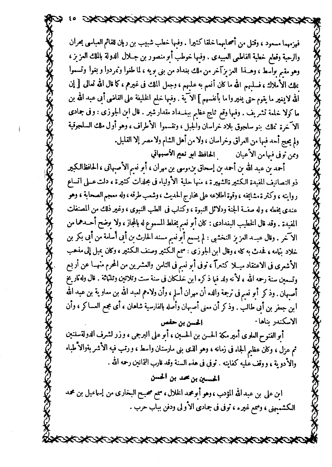 أَحْمَدُ بْنُ عَبْدِ اللَّهِ بْنِ أَحْمَدَ بْنِ إِسْحَاقَ بْنِ مُوسَى بْنِ مِهْرَانَ، أَبُو نُعَيْمٍ الْأَصْبَهَانِيُّ، الْحَافِظُ الْكَبِيرُ ذُو التَّصَانِيفِ المفيدة الكثيرة الشهيرة، منها حِلْيَةُ الْأَوْلِيَاءِ فِي مُجَلَّدَاتٍ كَثِيرَةٍ، دَلَّتْ عَلَى اتِّسَاعِ رِوَايَتِهِ، وَكَثْرَةِ مَشَايِخِهِ، وَقُوَّةِ اطِّلَاعِهِ عَلَى مخارج الحديث، وشعب طرقه، وَلَهُ مُعْجَمُ الصَّحَابَةِ، وَهُوَ عِنْدِي بِخَطِّهِ، وَلَهُ صفة الجنة ودلائل النبوة، وكتاب في الطب النبوي، وَغَيْرُ ذَلِكَ مِنَ الْمُصَنَّفَاتِ الْمُفِيدَةِ. وَقَدْ قَالَ الْخَطِيبُ الْبَغْدَادِيُّ: كَانَ أَبُو نُعَيْمٍ يَخْلِطُ الْمَسْمُوعَ لَهُ بِالْمَجَازِ، وَلَا يُوَضِّحُ أَحَدَهُمَا مِنَ الْآخَرِ. وَقَالَ عَبْدُ الْعَزِيزِ النَّخْشَبِيُّ: لَمْ يَسْمَعْ أَبُو نعيم مسند الحارث بن أبى أسامة بن أَبِي بَكْرِ بْنِ خَلَّادٍ بِتَمَامِهِ، فَحَدَّثَ بِهِ كله، وقال ابن الْجَوْزِيِّ: سَمِعَ الْكَثِيرَ وَصَنَّفَ الْكَثِيرَ، وَكَانَ يَمِيلُ إلى مذهب الأشعري في الاعتقاد ميلا كثيرا، توفى أبو نعيم في الثامن والعشرين مِنَ الْمُحَرَّمِ مِنْهَا عَنْ أَرْبَعٍ وَتِسْعِينَ سَنَةً رحمه الله، لأنه ولد فيما ذكره ابن خَلِّكَانَ فِي سَنَةِ سِتٍّ وَثَلَاثِينَ وَثَلَاثِمِائَةٍ. قَالَ وَلَهُ تَارِيخُ أَصْبَهَانَ. وَذَكَرَ أَبُو نُعَيْمٍ فِي تَرْجَمَةِ وَالِدِهِ أَنَّ مِهْرَانَ أَسْلَمَ، وَأَنَّ وَلَاءَهُمْ لِعَبْدِ اللَّهِ بْنِ مُعَاوِيَةَ بْنِ عَبْدِ اللَّهِ ابن جَعْفَرِ بْنِ أَبِي طَالِبٍ. وَذَكَرَ أَنَّ مَعْنَى أصبهان وأصله بالفارسية شاهان، أي مجمع العساكر، وأن الإسكندر بناها