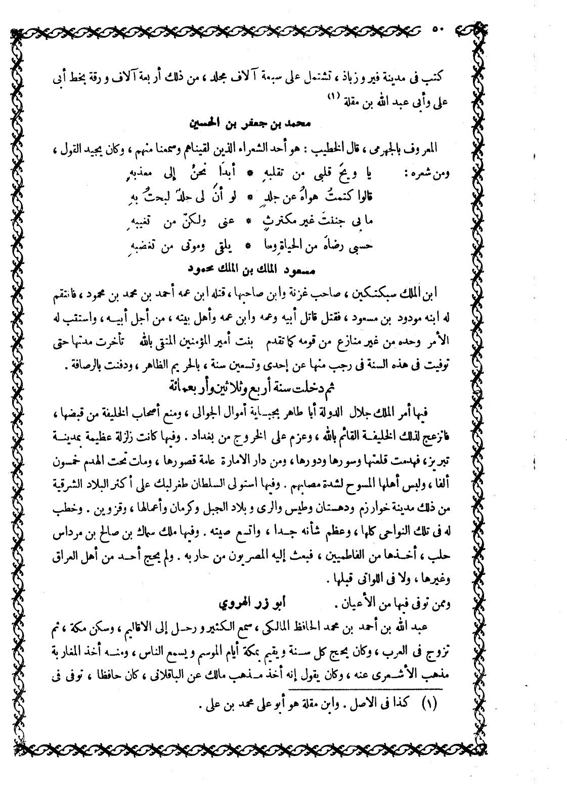 كُتُبٍ فِي مَدِينَةِ فِيرُوزَابَاذَ، تَشْتَمِلُ عَلَى سَبْعَةِ آلَافِ مُجَلَّدٍ، مِنْ ذَلِكَ أَرْبَعَةُ آلَافِ وَرَقَةٍ بخط أبى على وأبى عبد الله بن مقلة [1] .