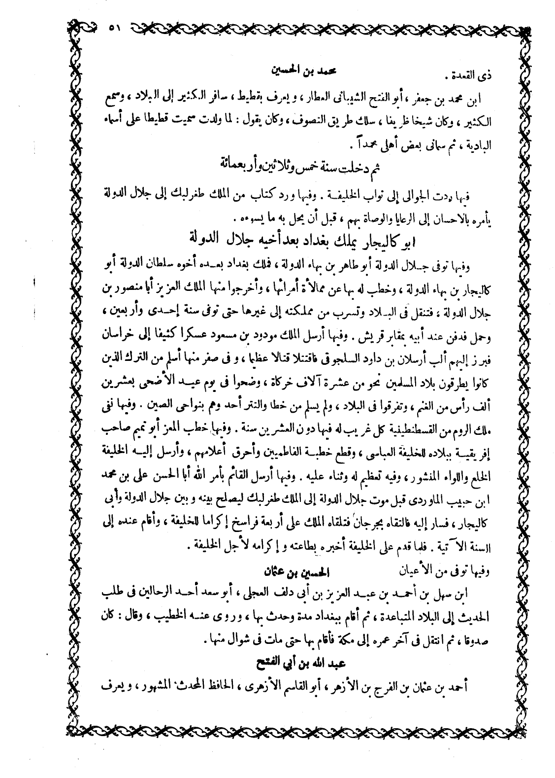 فِيهَا رُدَّتِ الْجَوَالَى إِلَى نُوَّابِ الْخَلِيفَةِ. وَفِيهَا ورد كتاب من الْمُلْكِ طُغْرُلْبَكَ إِلَى جَلَالِ الدَّوْلَةِ يَأْمُرُهُ بِالْإِحْسَانِ إلى الرعايا والوصاة بهم، قبل أن يحل به ما يسوءه.