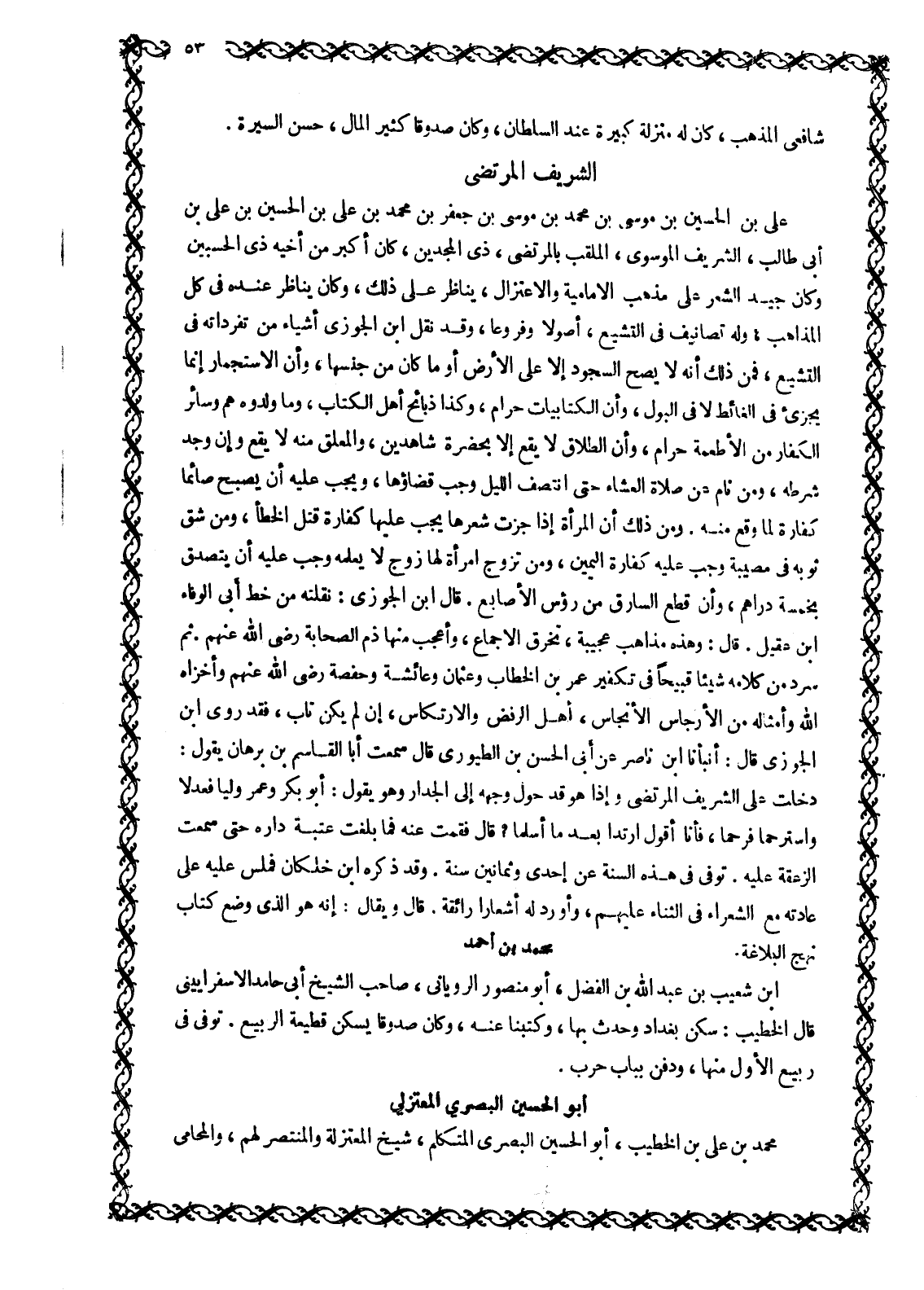 عَلِيُّ بْنُ الْحُسَيْنِ بْنِ مُوسَى بْنِ مُحَمَّدِ بْنُ مُوسَى بْنُ جَعْفَرِ بْنِ مُحَمَّدِ بْنِ عَلِيِّ بْنِ الْحُسَيْنِ بْنِ عَلِيِّ بْنِ أَبِي طَالِبٍ، الشَّرِيفُ الْمُوسَوِيُّ، الْمُلَقَّبُ بِالْمُرْتَضَى، ذِي الْمَجْدَيْنِ، كان أكبر من أخيه ذي الحسبين وَكَانَ جَيِّدَ الشِّعْرِ عَلَى مَذْهَبِ الْإِمَامِيَّةِ وَالِاعْتِزَالِ، يُنَاظَرُ عَلَى ذَلِكَ، وَكَانَ يُنَاظَرُ عِنْدَهُ فِي كُلِّ الْمَذَاهِبِ، وَلَهُ تَصَانِيفُ فِي التَّشَيُّعِ، أُصُولًا وفروعا، وقد نقل ابن الجوزي أَشْيَاءَ مِنْ تَفَرُّدَاتِهِ فِي التَّشَيُّعِ، فَمِنْ ذَلِكَ أَنَّهُ لَا يَصِحُّ السُّجُودُ إِلَّا عَلَى الْأَرْضِ أَوْ مَا كَانَ مِنْ جِنْسِهَا، وَأَنَّ الِاسْتِجْمَارَ إِنَّمَا يُجْزِئُ فِي الْغَائِطِ لَا فِي الْبَوْلِ، وأن الكتابيات حرام، وكذا ذبائح أهل الكتاب، وما ولدوه هم وسائر الكفار من الأطعمة حرام، وَأَنَّ الطَّلَاقَ لَا يَقَعُ إِلَّا بِحَضْرَةِ شَاهِدَيْنِ، وَالْمُعَلَّقَ مِنْهُ لَا يَقَعُ وَإِنْ وُجِدَ شَرْطُهُ، وَمَنْ نَامَ عَنْ صَلَاةِ الْعِشَاءِ حَتَّى انْتَصَفَ اللَّيْلُ وَجَبَ قَضَاؤُهَا، وَيَجِبُ عَلَيْهِ أَنْ يُصْبِحَ صَائِمًا كَفَّارَةً لِمَا وَقَعَ مِنْهُ. وَمِنْ ذَلِكَ أَنَّ الْمَرْأَةَ إِذَا جَزَّتْ شَعْرَهَا يَجِبُ عَلَيْهَا كَفَّارَةُ قَتْلِ الْخَطَأِ، وَمَنْ شَقَّ ثَوْبَهُ فِي مصيبة وجب عليه كفارة اليمين، وَمَنْ تَزَوَّجَ امْرَأَةً لَهَا زَوْجٌ لَا يَعْلَمُهُ وَجَبَ عَلَيْهِ أَنْ يَتَصَدَّقَ بِخَمْسَةِ دَرَاهِمَ، وَأَنَّ قطع السارق من رءوس الأصابع. قال ابن الجوزي: نقلته من خط أبى الوفاء ابن عُقَيْلٍ. قَالَ: وَهَذِهِ مَذَاهِبٌ عَجِيبَةٌ، تَخْرُقُ الْإِجْمَاعَ، وَأَعْجَبُ مِنْهَا ذَمُّ الصَّحَابَةَ رَضِيَ اللَّهُ عَنْهُمْ. ثُمَّ سَرَدَ مِنْ كَلَامِهِ شَيْئًا قَبِيحًا فِي تكفير عمر بن الخطاب وعثمان وعائشة وحفصة رضى الله عنهم وأخزاه الله وأمثاله من الأرجاس الأنجاس، أهل الرفض والارتكاس، إِنْ لَمْ يَكُنْ تَابَ، فَقَدْ رَوَى ابْنُ الْجَوْزِيِّ قَالَ: أَنْبَأَنَا ابْنُ نَاصِرٍ عَنْ أَبِي الْحَسَنِ بْنِ الطُّيُورِيِّ قَالَ سَمِعْتُ أَبَا الْقَاسِمِ بْنَ بُرْهَانَ يَقُولُ: