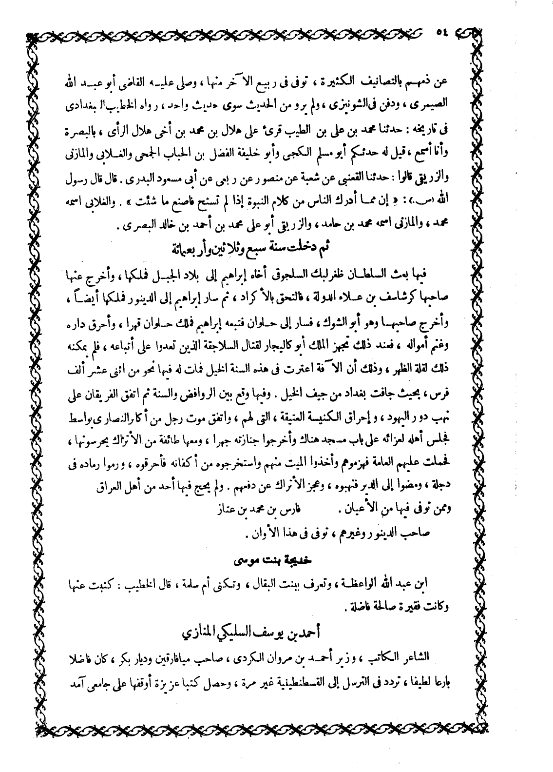 عن ذمهم بالتصانيف الكثيرة، توفى في ربيع الآخر منها، وَصَلَّى عَلَيْهِ الْقَاضِي أَبُو عَبْدِ اللَّهِ الصَّيْمَرِيُّ، ودفن في الشونيزى، ولم يرو من الحديث سوى حديث واحد، رواه الْخَطِيبُ الْبَغْدَادِيُّ فِي تَارِيخِهِ: حَدَّثَنَا مُحَمَّدُ بْنُ عَلِيِّ بْنِ الطَّيِّبِ قُرِئَ عَلَى هِلَالِ بْنِ مُحَمَّدِ بْنِ أَخِي هِلَالٍ الرَّأْيُ، بِالْبَصْرَةِ وَأَنَا أَسْمَعُ، قِيلَ لَهُ حَدَّثَكُمْ أَبُو مُسْلِمٍ الْكَجِّيُّ وَأَبُو خَلِيفَةَ الْفَضْلُ بْنُ الْحُبَابِ الْجُمَحِيُّ وَالْغَلَّابِيُّ وَالْمَازِنِيُّ وَالزُّرَيْقِيُّ قَالُوا: حَدَّثَنَا الْقَعْنَبِيُّ عَنْ شُعْبَةَ عَنْ مَنْصُورٍ عَنْ رَبْعِيٍّ عَنْ أَبِي مَسْعُودٍ الْبَدْرِيِّ. قَالَ قَالَ رَسُولُ اللَّهِ صَلَّى اللَّهُ عَلَيْهِ وَسَلَّمَ: «إِنَّ مِمَّا أَدْرَكَ النَّاسَ مِنْ كَلَامِ النُّبُوَّةِ إِذَا لَمْ تَسْتَحِ فَاصْنَعْ مَا شِئْتَ» . وَالْغَلَابِيُّ اسمه محمد، والمازني اسمه محمد بن حامد، وَالزُّرَيْقِيُّ أَبُو عَلِيٍّ مُحَمَّدُ بْنُ أَحْمَدَ بْنِ خَالِدٍ الْبَصْرِيُّ.