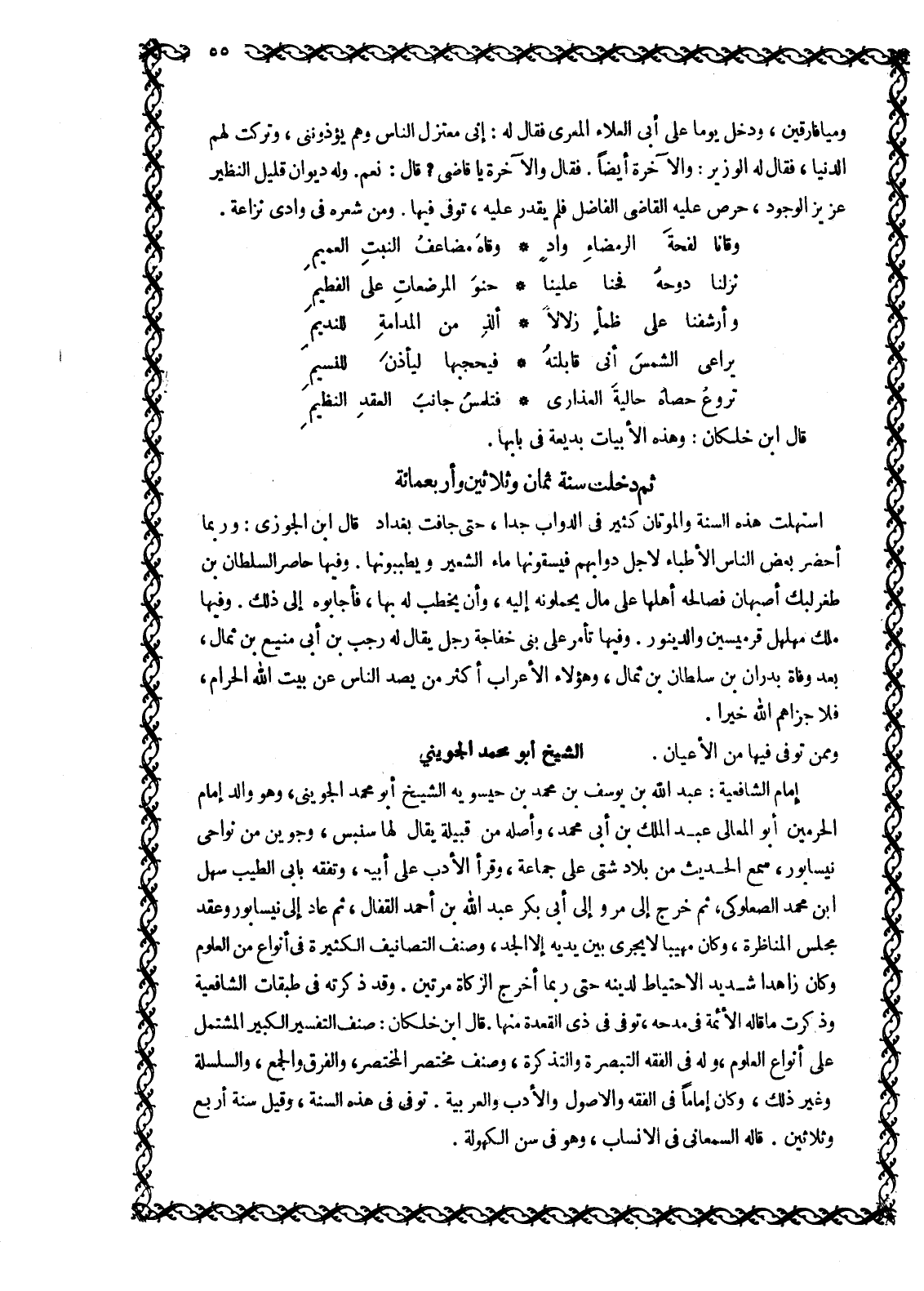 إمام الشافعية: عَبْدِ اللَّهِ بْنِ يُوسُفَ بْنِ مُحَمَّدِ بْنِ حيسويه الشيخ أبو محمد الجويني، وهو والد إمام الحرمين أبو الْمَعَالِي عَبْدِ الْمَلِكِ بْنِ أَبِي مُحَمَّدٍ، وَأَصْلُهُ مِنْ قَبِيلَةٍ يُقَالُ لَهَا سِنْبِسُ، وَجُوَيْنُ مِنْ نَوَاحِي نَيْسَابُورَ، سَمِعَ الْحَدِيثِ مِنْ بِلَادٍ شَتَّى عَلَى جَمَاعَةٍ، وَقَرَأَ الْأَدَبَ عَلَى أَبِيهِ، وَتَفَقَّهَ بابي الطيب سهل ابن مُحَمَّدٍ الصُّعْلُوكِيِّ، ثُمَّ خَرَجَ إِلَى مَرْوَ إِلَى أَبِي بَكْرٍ عَبْدِ اللَّهِ بْنِ أَحْمَدَ الْقَفَّالِ، ثُمَّ عَادَ إِلَى نَيْسَابُورَ وَعَقَدَ مَجْلِسَ الْمُنَاظَرَةِ، وَكَانَ مَهِيبًا لَا يَجْرِي بَيْنَ يَدَيْهِ إِلَّا الْجِدُّ، وَصَنَّفَ التَّصَانِيفَ الْكَثِيرَةَ فِي أَنْوَاعٍ مِنَ العلوم وكان زاهدا شديد الاحتياط لدينه حتى رُبَّمَا أَخْرَجَ الزَّكَاةَ مَرَّتَيْنِ. وَقَدْ ذَكَرْتُهُ فِي طبقات الشافعية وذكرت ما قاله الأئمة في مدحه، توفى في ذي القعدة منها. قال ابْنُ خَلِّكَانَ: صَنَّفَ التَّفْسِيرَ الْكَبِيرَ الْمُشْتَمِلَ عَلَى أنواع العلوم، وله في الفقه التبصرة والتذكرة، وصنف مختصر المختصر، والفرق والجمع، والسلسلة وَغَيْرُ ذَلِكَ، وَكَانَ إِمَامًا فِي الْفِقْهِ وَالْأُصُولِ والأدب والعربية. توفى فِي هَذِهِ السَّنَةِ، وَقِيلَ سَنَةِ أَرْبَعٍ وَثَلَاثِينَ. قَالَهُ السَّمْعَانِيُّ فِي الْأَنْسَابِ، وَهُوَ فِي سِنِّ الكهولة.