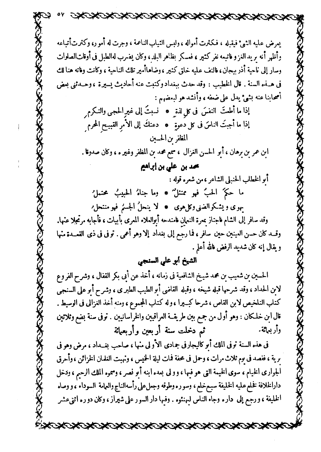 الْحُسَيْنُ بْنُ شُعَيْبِ بْنِ مُحَمَّدٍ شَيْخُ الشَّافِعِيَّةِ فِي زَمَانِهِ، أَخَذَ عَنْ أَبِي بَكْرٍ الْقَفَّالِ، وَشَرَحَ الْفُرُوعَ لِابْنِ الحداد، وقد شرحها قبله شيخه، وقبله الْقَاضِي أَبُو الطَّيِّبِ الطَّبَرِيُّ، وَشَرَحَ أَبُو عَلِيٍّ السِّنْجِيُّ كِتَابَ التَّلْخِيصِ لِابْنِ الْقَاصِّ، شَرْحًا كَبِيرًا، وله كتاب المجموع، ومنه أخذ الْغَزَّالِيُّ فِي الْوَسِيطِ.