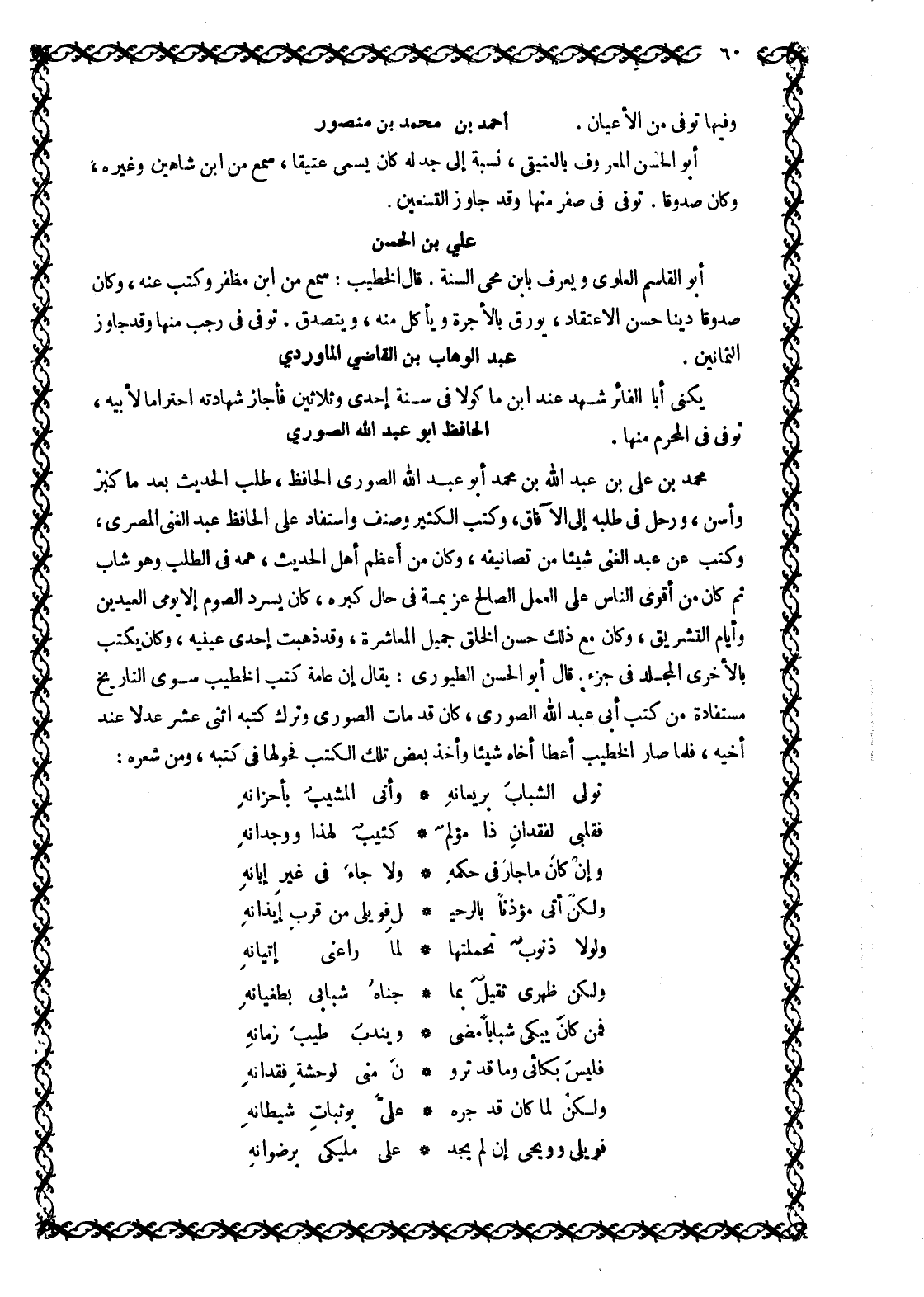 مُحَمَّدِ بْنِ عَلِيِّ بْنِ عَبْدِ اللَّهِ بْنِ محمد أبو عبد الله الصوري الحافظ، طلب الحديث بعد ما كبر وأسن، ورحل في طلبه إِلَى الْآفَاقِ، وَكَتَبَ الْكَثِيرَ وَصَنَّفَ وَاسْتَفَادَ عَلَى الحافظ عبد الغنى المصري، وكتب عن عبد الغنى شيئا من تَصَانِيفِهِ، وَكَانَ مِنْ أَعْظَمِ أَهْلِ الْحَدِيثِ، هِمَّةً فِي الطَّلَبِ وَهُوَ شَابٌّ ثُمَّ كَانَ مَنْ أقوى الناس على العمل الصالح عزيمة في حال كبره، كان يسرد الصوم إِلَّا يَوْمَيِ الْعِيدَيْنِ وَأَيَّامَ التَّشْرِيقِ، وَكَانَ مَعَ ذَلِكَ حَسَنَ الْخُلُقِ جَمِيلَ الْمُعَاشَرَةِ، وَقَدْ ذَهَبَتْ إحدى عينيه، وكان يَكْتُبُ بِالْأُخْرَى الْمُجَلَّدَ فِي جُزْءٍ. قَالَ أَبُو الحسن الطُّيُورِيِّ: يُقَالُ إِنَّ عَامَّةَ كُتُبِ الْخَطِيبِ سِوَى التَّارِيخِ مُسْتَفَادَةٌ مِنْ كُتُبِ أَبِي عَبْدِ اللَّهِ الصُّورِيِّ كَانَ قَدْ مَاتَ الصُّورِيُّ وَتَرَكَ كُتُبَهُ اثْنَيْ عَشَرَ عِدْلًا عِنْدَ أَخِيهِ، فَلَمَّا صَارَ الخطيب أعطا أَخَاهُ شَيْئًا وَأَخَذَ بَعْضَ تِلْكَ الْكُتُبَ فَحَوَّلَهَا في كتبه، ومن شعره: