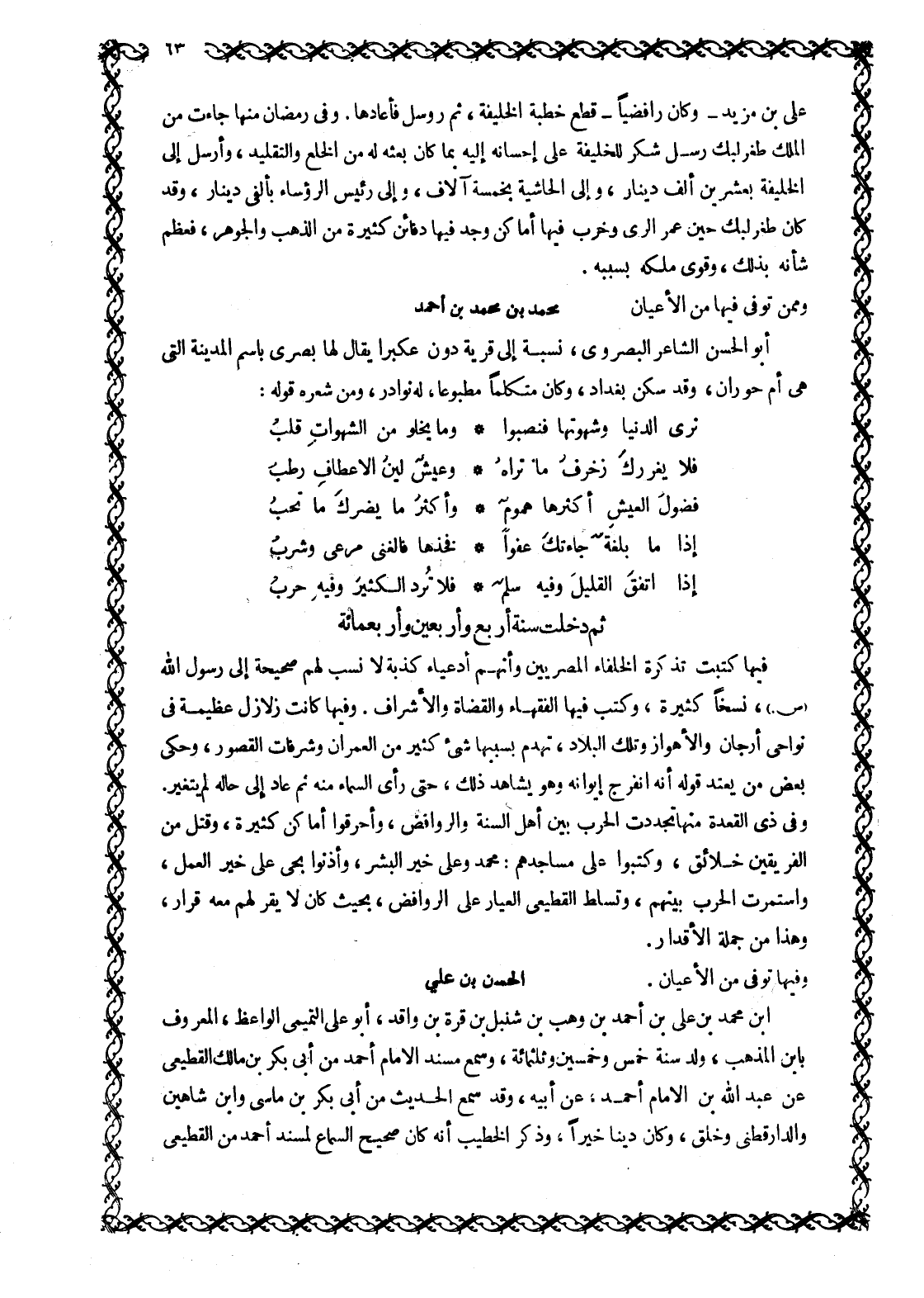 عَلِيِّ بْنِ مَزْيَدٍ- وَكَانَ رَافِضِيًّا- قَطَعَ خُطْبَةَ الخليفة، ثم روسل فأعادها. وفي رمضان منها جاءت من الملك طغرلبك رسل شكر للخليفة على إحسانه إِلَيْهِ بِمَا كَانَ بَعَثَهُ لَهُ مِنَ الْخِلَعِ وَالتَّقْلِيدِ، وَأَرْسَلَ إِلَى الْخَلِيفَةِ بِعِشْرِينَ أَلْفَ دِينَارٍ، وَإِلَى الْحَاشِيَةِ بِخَمْسَةِ آلَافٍ، وَإِلَى رَئِيسِ الرُّؤَسَاءِ بِأَلْفَيْ دِينَارٍ، وَقَدْ كَانَ طُغْرُلْبَكُ حِينَ عَمَّرَ الري وخرب فيها أماكن وَجَدَ فِيهَا دَفَائِنَ كَثِيرَةً مِنَ الذَّهَبِ وَالْجَوْهَرِ، فعظم شأنه بذلك، وقوى ملكه بسببه.