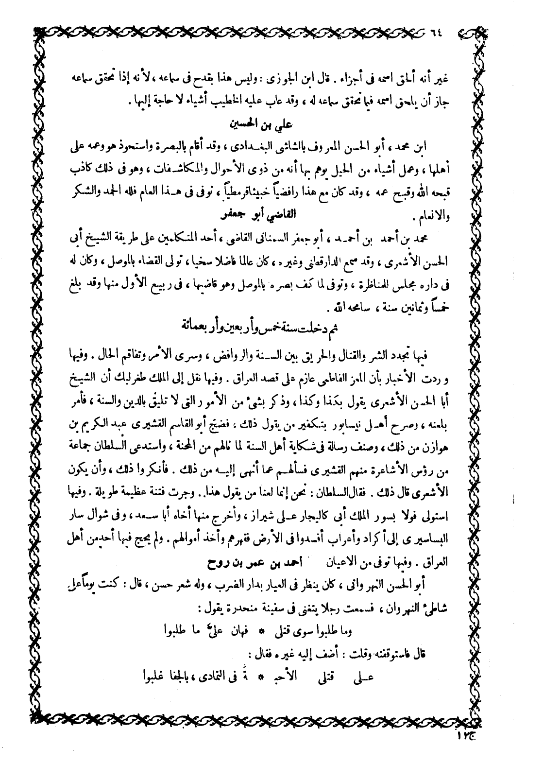 ابن محمد، أبو الحسن المعروف بالشاشي البغدادي، وقد أقام بالبصرة واستحوذ هو وعمه على أَهْلِهَا، وَعَمِلَ أَشْيَاءَ مِنَ الْحِيَلِ يُوهِمُ بِهَا أَنَّهُ مِنْ ذَوِي الْأَحْوَالِ وَالْمُكَاشَفَاتِ، وَهُوَ فِي ذلك كاذب قَبَّحَهُ اللَّهُ وَقَبَّحَ عَمَّهُ، وَقَدْ كَانَ مَعَ هذا رافضيا خبيثا قرمطيا، توفى في هذا العام فلله الحمد والشكر والانعام.