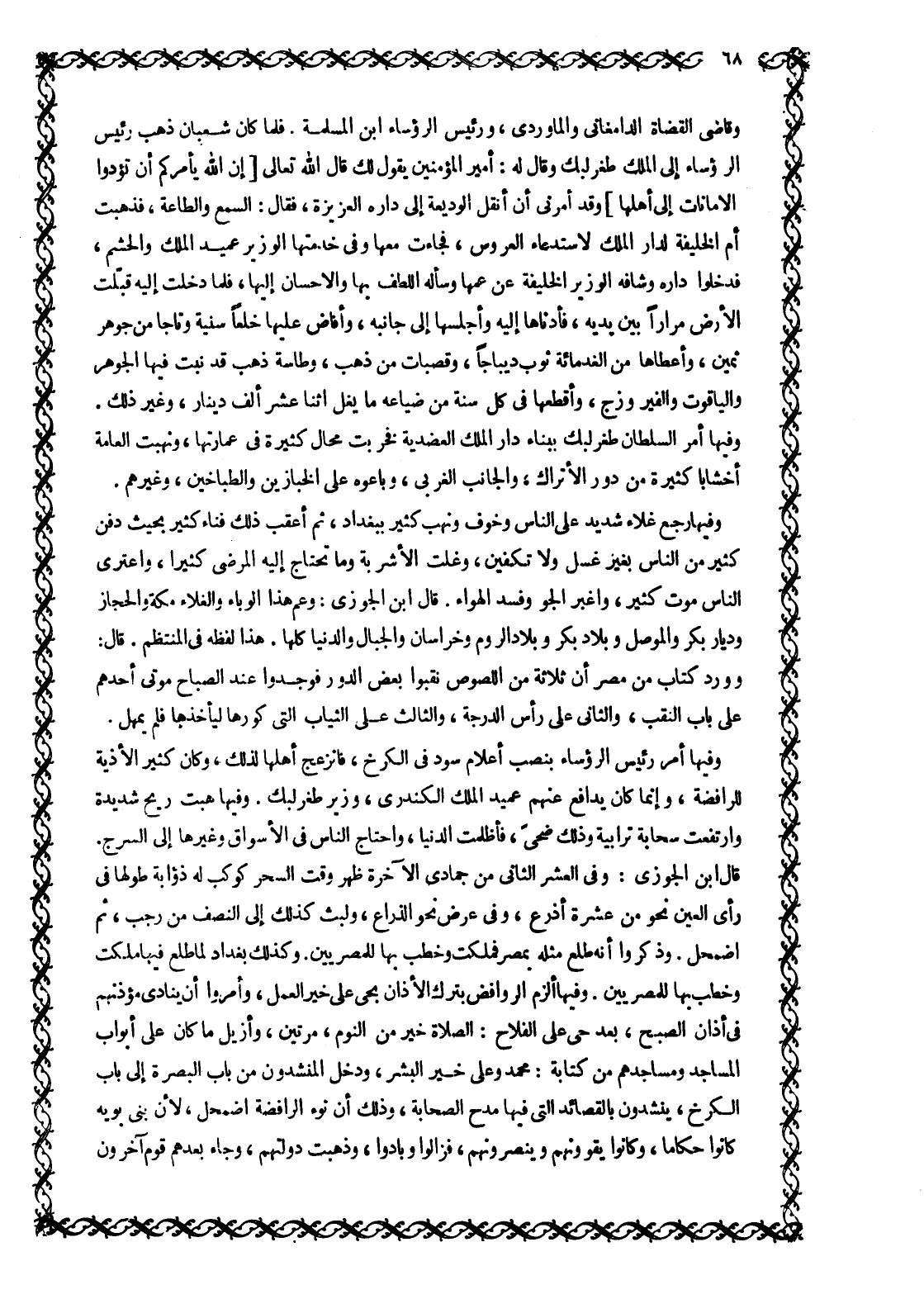 وفيها رجع غلاء شديد على الناس وخوف ونهب كثير ببغداد، ثم أعقب ذلك فناء كثير بِحَيْثُ دُفِنَ كَثِيرٌ مِنَ النَّاسِ بِغَيْرِ غَسْلٍ ولا تكفين، وغلت الأشربة وما تحتاج إليه المرضى كثيرا، واعترى الناس موت كثير، واغبر الجو وفسد الهواء. قال ابن الجوزي: وَعَمَّ هَذَا الْوَبَاءُ وَالْغَلَاءُ مَكَّةَ وَالْحِجَازَ وَدِيَارَ بكر والموصل وبلاد بكر وَبِلَادَ الرُّومِ وَخُرَاسَانَ وَالْجِبَالَ وَالدُّنْيَا كُلَّهَا. هَذَا لَفَظُهُ فِي الْمُنْتَظَمِ. قَالَ: