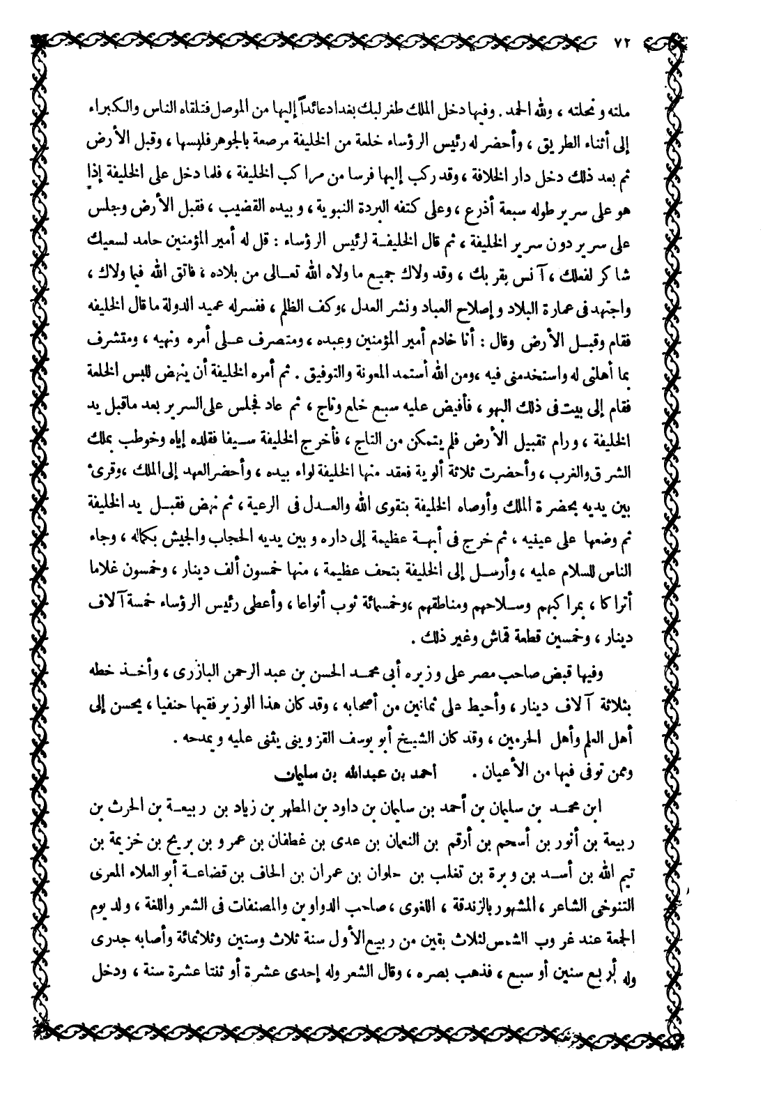 ملته ونحلته، وللَّه الْحَمْدُ. وَفِيهَا دَخَلَ الْمَلِكُ طُغْرُلْبَكُ بَغْدَادَ عائدا إليها من الموصل فتلقاه الناس والكبراء إِلَى أَثْنَاءِ الطَّرِيقِ، وَأَحْضَرَ لَهُ رَئِيسُ الرُّؤَسَاءِ خلعة من الخليفة مرصعة بالجوهر فَلَبِسَهَا، وَقَبَّلَ الْأَرْضَ ثُمَّ بَعْدَ ذَلِكَ دَخَلَ دَارَ الْخِلَافَةِ، وَقَدْ رَكِبَ إِلَيْهَا فَرَسًا مِنْ مَرَاكِبِ الْخَلِيفَةِ، فَلَمَّا دَخَلَ عَلَى الْخَلِيفَةِ إِذَا هُوَ عَلَى سَرِيرٍ طُولُهُ سَبْعَةُ أَذْرُعٍ، وَعَلَى كتفه البردة النبويّة، وبيده القضيب، فقبل الأرض وجلس عَلَى سَرِيرٍ دُونَ سَرِيرِ الْخَلِيفَةِ، ثُمَّ قَالَ الْخَلِيفَةُ لِرَئِيسِ الرُّؤَسَاءِ: قُلْ لَهُ أَمِيرُ الْمُؤْمِنِينَ حَامِدٌ لِسَعْيِكَ شَاكِرٌ لِفِعْلِكَ، آنِسٌ بِقُرْبِكَ، وَقَدْ ولاك جميع ما ولاه الله تعالى مِنْ بِلَادِهِ، فَاتَّقِ اللَّهَ فِيمَا وَلَّاكَ، وَاجْتَهِدْ فِي عِمَارَةِ الْبِلَادِ وَإِصْلَاحِ الْعِبَادِ وَنَشْرِ الْعَدْلِ، وَكَفِّ الظُّلْمِ، فَفَسَّرَ لَهُ عَمِيدُ الدَّوْلَةِ مَا قال الخليفة فَقَامَ وَقَبَّلَ الْأَرْضَ وَقَالَ: أَنَا خَادِمُ أَمِيرِ المؤمنين وعبده، ومتصرف على أَمْرِهِ وَنَهْيِهِ، وَمُتَشَرِّفٌ بِمَا أَهَّلَنِي لَهُ وَاسْتَخْدَمَنِي فِيهِ، وَمِنَ اللَّهِ أَسْتَمِدُّ الْمَعُونَةَ وَالتَّوْفِيقَ. ثُمَّ أمره الخليفة أَنْ يَنْهَضَ لِلُبْسِ الْخِلْعَةَ فَقَامَ إِلَى بَيْتٍ فِي ذَلِكَ الْبَهْوِ، فَأُفِيضَ عَلَيْهِ سَبْعُ خِلَعٍ وَتَاجٌ، ثُمَّ عَادَ فَجَلَسَ عَلَى السَّرِيرِ بَعْدَ مَا قَبَّلَ يَدَ الْخَلِيفَةِ، وَرَامَ تَقْبِيلَ الْأَرْضِ فَلَمْ يَتَمَكَّنْ مِنَ التَّاجِ، فَأَخْرَجَ الْخَلِيفَةُ سَيْفًا فقلده إياه وخوطب بِمَلِكِ الشَّرْقِ وَالْغَرْبِ، وَأُحْضِرَتْ ثَلَاثَةُ أَلْوِيَةٍ فَعَقَدَ منها الخليفة لواء بيده، وأحضر العهد إلى الملك، وقرئ بين يديه بحضرة الملك وأوصاه الخليفة بتقوى الله والعدل في الرعية، ثم نهض فقبل يد الخليفة ثم وضعها عَلَى عَيْنَيْهِ، ثُمَّ خَرَجَ فِي أُبَّهَةٍ عَظِيمَةٍ إلى داره وَبَيْنَ يَدَيْهِ الْحِجَابُ وَالْجَيْشُ بِكَمَالِهِ، وَجَاءَ النَّاسُ للسلام عليه، وَأَرْسَلَ إِلَى الْخَلِيفَةِ بِتُحَفٍ عَظِيمَةٍ، مِنْهَا خَمْسُونَ أَلْفَ دِينَارٍ، وَخَمْسُونَ غُلَامًا أَتْرَاكًا، بِمَرَاكِبِهِمْ وَسِلَاحِهِمْ وَمَنَاطِقِهِمْ، وَخَمْسُمِائَةِ ثَوْبٍ أَنْوَاعًا، وَأَعْطَى رَئِيسَ الرُّؤَسَاءِ خمسة آلاف دينار، وخمسين قطعة قماش وغير ذلك.
