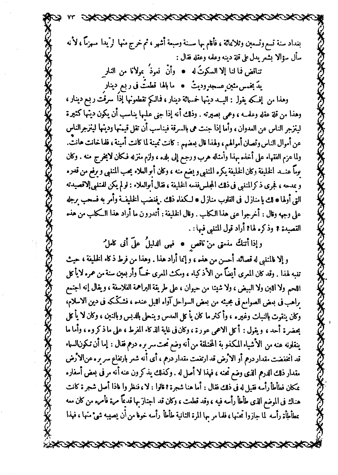 وَإِلَّا فَالْمُتَنَبِّي لَهُ قَصَائِدُ أَحْسَنُ مِنْ هَذِهِ، وَإِنَّمَا أَرَادَ هَذَا. وَهَذَا مِنْ فَرْطِ ذَكَاءِ الْخَلِيفَةِ، حَيْثُ تَنَبَّهَ لِهَذَا. وَقَدْ كَانَ الْمَعَرِّيُّ أَيْضًا مِنَ الْأَذْكِيَاءِ، وَمَكَثَ الْمَعَرِّيُّ خَمْسًا وَأَرْبَعِينَ سَنَةً مِنْ عُمُرِهِ لا يأكل اللحم ولا اللبن ولا البيض، وَلَا شَيْئًا مِنْ حَيَوَانٍ، عَلَى طَرِيقَةِ الْبَرَاهِمَةِ الفلاسفة، ويقال إنه اجتمع براهب في بعض الصوامع في مجيئه من بعض السواحل آواه الليل عنده، فشكّكه في دين الإسلام، وكان يتقوت بالنبات وغيره، وَأَكْثَرُ مَا كَانَ يَأْكُلُ الْعَدَسَ وَيَتَحَلَّى بِالدِّبْسِ وبالتين، وكان لا يَأْكُلُ بِحَضْرَةِ أَحَدٍ، وَيَقُولُ: أَكْلُ الْأَعْمَى عَوْرَةٌ، وَكَانَ فِي غَايَةِ الذَّكَاءِ الْمُفْرِطِ، عَلَى مَا ذكروه، وأما ما ينقلونه عنه من الأشياء المكذوبة المختلقة مِنْ أَنَّهُ وُضِعَ تَحْتَ سَرِيرِهِ دِرْهَمٌ فَقَالَ: إِمَّا أَنْ تَكُونَ السَّمَاءُ قَدِ انْخَفَضَتْ مِقْدَارَ درهم أو الأرض قد ارتفعت مقدار درهم، أي أنه شعر بارتفاع سريره عن الأرض مقدار ذلك الدرهم الّذي وضع تحته، فهذا لا أصل له. وكذلك يذكرون عنه أَنَّهُ مَرَّ فِي بَعْضِ أَسْفَارِهِ بِمَكَانٍ فَطَأْطَأَ رَأْسَهُ فَقِيلَ لَهُ فِي ذَلِكَ فَقَالَ: أَمَا هنا شجرة؟ قالوا: لا، فنظروا فإذا أصل شجرة كانت هناك في الموضع الّذي طأطأ رأسه فيه، وقد قطعت، وكان قد اجتاز بها قديما مَرَّةً فَأَمَرَهُ مَنْ كَانَ مَعَهُ بِمُطَأْطَأَةِ رَأْسِهِ لما جازوا تحتها، فلما مر بها المرة الثانية طأطأ رأسه خوفا من أن يصيبه شيء منها، فهذا