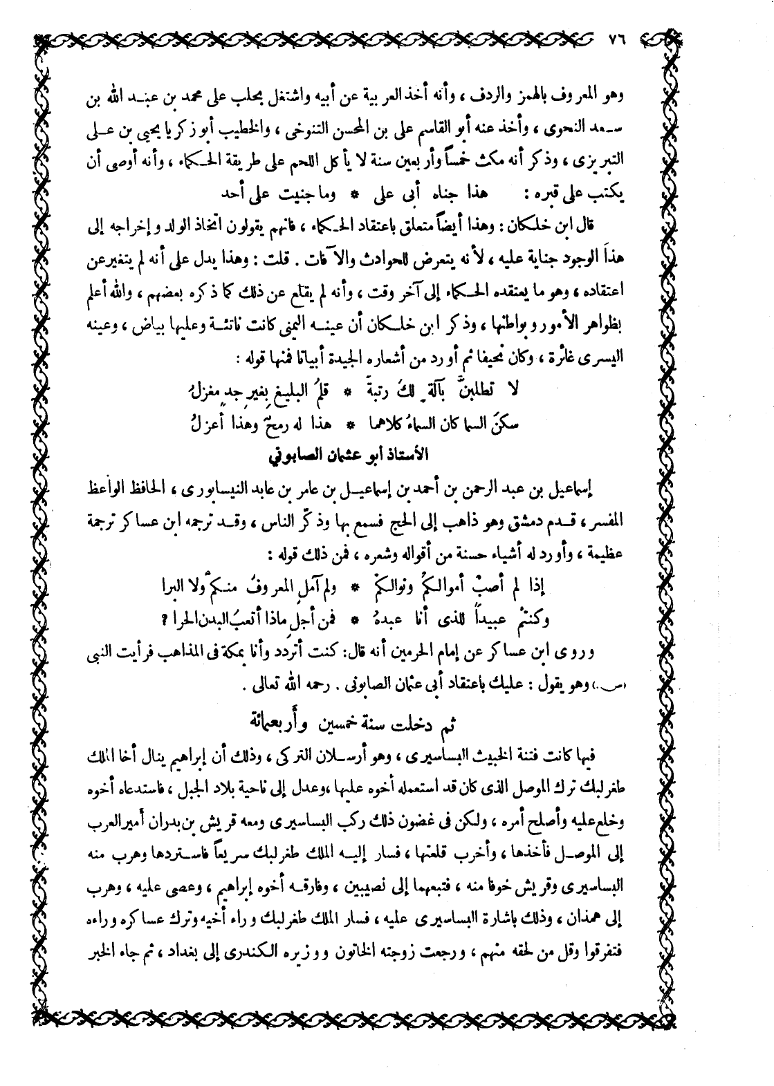 فِيهَا كَانَتْ فِتْنَةُ الْخَبِيثِ الْبَسَاسِيرِيِّ، وَهُوَ أَرْسَلَانُ التركي، وَذَلِكَ أَنَّ إِبْرَاهِيمَ يَنَّالَ أَخَا الْمَلِكِ طُغْرُلْبَكَ تَرَكَ الْمَوْصِلَ الَّذِي كَانَ قَدِ اسْتَعْمَلَهُ أَخُوهُ عَلَيْهَا، وَعَدَلَ إِلَى نَاحِيَةِ بِلَادِ الْجَبَلِ، فَاسْتَدْعَاهُ أَخُوهُ وَخَلَعَ عَلَيْهِ وَأَصْلَحَ أَمْرَهُ، وَلَكِنْ فِي غضون ذَلِكَ رَكِبَ الْبَسَاسِيرِيُّ وَمَعَهُ قُرَيْشُ بْنُ بَدْرَانَ أَمِيرُ الْعَرَبِ إِلَى الْمَوْصِلِ فَأَخَذَهَا، وَأَخْرَبَ قَلْعَتَهَا، فسار إليه الملك طغرلبك سريعا فَاسْتَرَدَّهَا وَهَرَبَ مِنْهُ الْبَسَاسِيرِيُّ وَقُرَيْشٌ خَوْفًا مِنْهُ، فَتَبِعَهُمَا إِلَى نَصِيبِينَ، وَفَارَقَهُ أَخُوهُ إِبْرَاهِيمُ، وَعَصَى عَلَيْهِ، وَهَرَبَ إِلَى هَمَذَانَ، وَذَلِكَ بِإِشَارَةِ الْبَسَاسِيرِيِّ عَلَيْهِ، فَسَارَ الْمَلِكُ طُغْرُلْبَكُ وَرَاءَ أَخِيهِ وَتَرَكَ عَسَاكِرَهُ وَرَاءَهُ فَتَفَرَّقُوا وَقَلَّ مَنْ لَحِقَهُ مِنْهُمْ، وَرَجَعَتْ زَوْجَتُهُ الْخَاتُونُ وَوَزِيرُهُ الْكُنْدُرِيُّ إِلَى بَغْدَادَ، ثُمَّ جَاءَ الْخَبَرُ