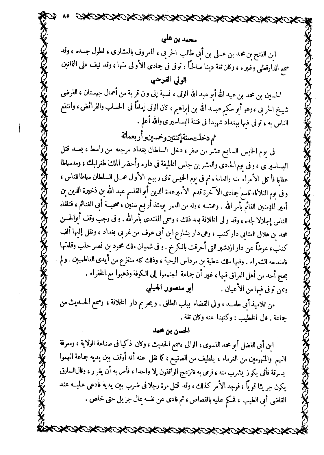 ابن الفتح بْنِ مُحَمَّدِ بْنِ عَلِيِّ بْنِ أَبِي طَالِبٍ الحربي، المعروف بالعشاري، لطول جسده، وقد سمع الدار قطنى وَغَيْرَهُ، وَكَانَ ثِقَةً دَيِّنًا صَالِحًا، تُوُفِّيَ فِي جمادى الأولى منها، وَقَدْ نَيَّفَ عَلَى الثَّمَانِينَ