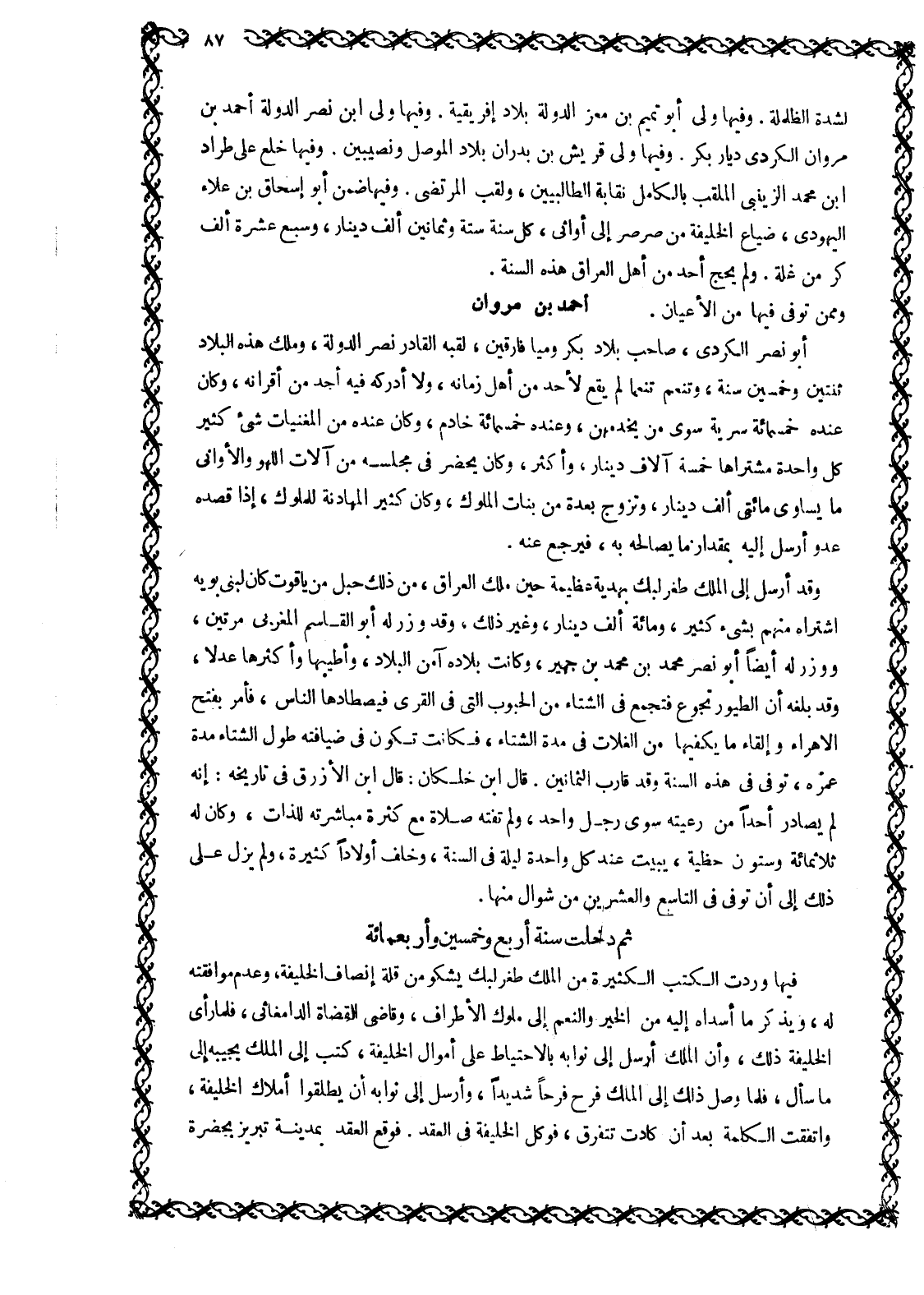 أَبُو نَصْرٍ الْكُرْدِيُّ، صَاحِبُ بِلَادِ بَكْرٍ وميافارقين، لقبه القادر نصر الدولة، وملك هَذِهِ الْبِلَادَ ثِنْتَيْنِ وَخَمْسِينَ سَنَةً، وَتَنَعَّمَ تَنَعُّمًا لَمْ يَقَعْ لِأَحَدٍ مِنْ أَهْلِ زَمَانِهِ، وَلَا أدركه فيه أحد من أقرانه، وَكَانَ عِنْدَهُ خَمْسُمِائَةِ سُرِّيَّةٍ سِوَى مَنْ يَخْدِمُهُنَّ، وعنده خمسمائة خادم، وكان عنده مِنَ الْمُغَنِّيَاتِ شَيْءٌ كَثِيرٌ كُلُّ وَاحِدَةٍ مُشْتَرَاهَا خَمْسَةُ آلَافِ دِينَارٍ، وَأَكْثَرُ، وَكَانَ يَحْضُرُ فِي مجلسه من آلات اللهو وَالْأَوَانِي مَا يُسَاوِي مِائَتَيْ أَلْفِ دِينَارٍ، وَتَزَوَّجَ بِعِدَّةٍ مِنْ بَنَاتِ الْمُلُوكِ، وَكَانَ كَثِيرَ الْمُهَادَنَةِ لِلْمُلُوكِ، إِذَا قَصَدَهُ عَدُوٌّ أَرْسَلَ إِلَيْهِ بِمِقْدَارِ ما يصالحه به، فَيَرْجِعُ عَنْهُ.
