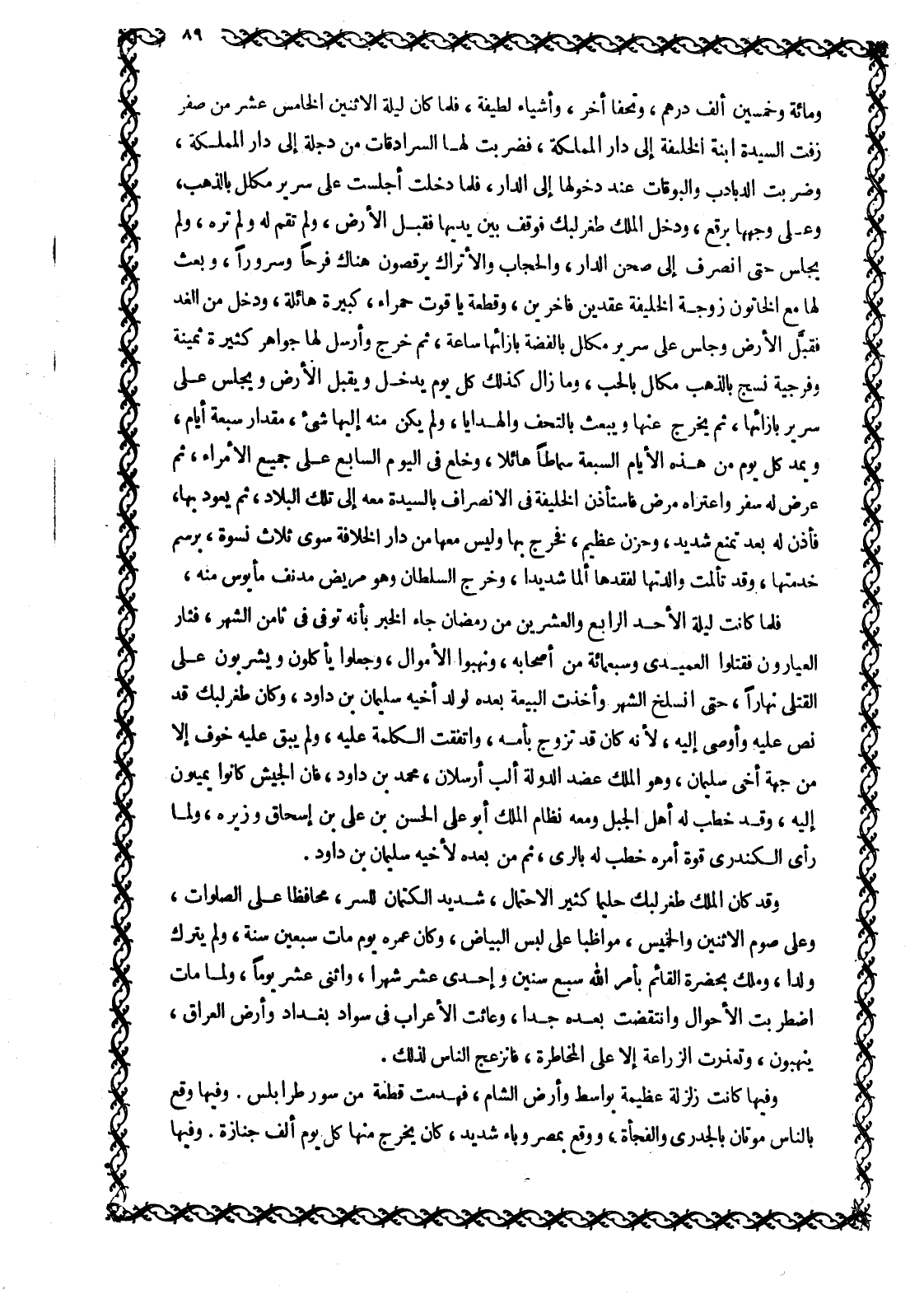 وَمِائَةً وَخَمْسِينَ أَلْفَ دِرْهَمٍ، وَتُحَفًا أُخَرَ، وَأَشْيَاءَ لَطِيفَةً، فَلَمَّا كَانَ لَيْلَةُ الِاثْنَيْنِ الْخَامِسَ عَشَرَ من صفر زُفَّتِ السَّيِّدَةُ ابْنَةُ الْخَلِيفَةِ إِلَى دَارِ الْمَمْلَكَةِ، فَضُرِبَتْ لَهَا السُّرَادِقَاتُ مِنْ دِجْلَةَ إِلَى دَارِ المملكة، وضربت الدبادب والبوقات عند دخولها إلى الدار، فلما دخلت أجلست عَلَى سَرِيرٍ مُكَلَّلٍ بِالذَّهَبِ، وَعَلَى وَجْهِهَا بُرْقُعٌ، وَدَخَلَ الْمَلِكُ طُغْرُلْبَكُ فَوَقَفَ بَيْنَ يَدَيْهَا فَقَبَّلَ الْأَرْضَ، وَلَمْ تَقُمْ لَهُ وَلَمْ تَرَهُ، وَلَمْ يَجْلِسْ حَتَّى انْصَرَفَ إِلَى صَحْنِ الدَّارِ، وَالْحُجَّابُ وَالْأَتْرَاكُ يَرْقُصُونَ هُنَاكَ فَرَحًا وَسُرُورًا، وَبَعَثَ لَهَا مع الخاتون زَوْجَةِ الْخَلِيفَةِ عِقْدَيْنِ فَاخِرَيْنِ، وَقِطْعَةَ يَاقُوتٍ حَمْرَاءَ، كَبِيرَةً هَائِلَةً، وَدَخَلَ مِنَ الْغَدِ فَقَبَّلَ الْأَرْضَ وَجَلَسَ عَلَى سَرِيرٍ مُكَلَّلٍ بِالْفِضَّةِ بِإِزَائِهَا سَاعَةً، ثم خرج وأرسل لها جواهر كثيرة ثمينة وفرجية نسج بالذهب مكلل بالحب، وَمَا زَالَ كَذَلِكَ كُلَّ يَوْمٍ يَدْخُلُ وَيُقَبِّلُ الْأَرْضَ وَيَجْلِسُ عَلَى سَرِيرٍ بِإِزَائِهَا، ثُمَّ يَخْرُجُ عنها ويبعث بِالتُّحَفِ وَالْهَدَايَا، وَلَمْ يَكُنْ مِنْهُ إِلَيْهَا شَيْءٌ، مِقْدَارَ سَبْعَةِ أَيَّامٍ، وَيَمُدُّ كُلَّ يَوْمٍ مِنْ هذه الأيام السبعة سماطا هائلا، وخلع في اليوم السَّابِعِ عَلَى جَمِيعِ الْأُمَرَاءِ، ثُمَّ عَرَضَ لَهُ سفر واعتراه مرض فاستأذن الخليفة في الانصراف بالسيدة معه إلى تلك البلاد، ثم يعود بها، فأذن له بَعْدَ تَمَنُّعٍ شَدِيدٍ، وَحُزْنٍ عَظِيمٍ، فَخَرَجَ بِهَا وَلَيْسَ مَعَهَا مِنْ دَارِ الْخِلَافَةِ سِوَى ثَلَاثِ نسوة، برسم خدمتها، وقد تألمت والدتها لفقدها ألما شديدا، وَخَرَجَ السُّلْطَانُ وَهُوَ مَرِيضٌ مُدْنِفٌ مَأْيُوسٌ مِنْهُ، فَلَمَّا كَانَتْ لَيْلَةُ الْأَحَدِ الرَّابِعِ وَالْعِشْرِينَ مِنْ رمضان جاء الخبر بأنه توفى في ثامن الشهر، فثار العيارون فقتلوا العميدي وَسَبْعَمِائَةٍ مِنْ أَصْحَابِهِ، وَنَهَبُوا الْأَمْوَالَ، وَجَعَلُوا يَأْكُلُونَ وَيَشْرَبُونَ عَلَى الْقَتْلَى نَهَارًا، حَتَّى انْسَلَخَ الشَّهْرُ وَأُخِذَتِ الْبَيْعَةُ بَعْدَهُ لِوَلَدِ أَخِيهِ سُلَيْمَانَ بْنِ دَاوُدَ، وَكَانَ طُغْرُلْبَكُ قَدْ نَصَّ عَلَيْهِ وَأَوْصَى إليه، لأنه كان قد تزوج بأمه، واتفقت الكلمة عليه، ولم يبق عليه خَوْفٌ إِلَّا مِنْ جِهَةِ أَخِي سُلَيْمَانَ، وَهُوَ الْمَلِكُ عَضُدِ الدَّوْلَةِ أَلْبُ أَرْسَلَانَ، مُحَمَّدُ بْنُ داود، فان الجيش كانوا يميلون إليه، وَقَدْ خَطَبَ لَهُ أَهْلُ الْجَبَلِ وَمَعَهُ نِظَامُ الْمُلْكِ أَبُو عَلِيٍّ الْحَسَنُ بْنُ عَلِيِّ بْنِ إِسْحَاقَ وَزِيرُهُ، وَلَمَّا رَأَى الْكُنْدُرِيُّ قُوَّةَ أَمْرِهِ خَطَبَ لَهُ بِالرَّيِّ، ثُمَّ مِنْ بَعْدِهِ لِأَخِيهِ سُلَيْمَانَ بْنِ دَاوُدَ.