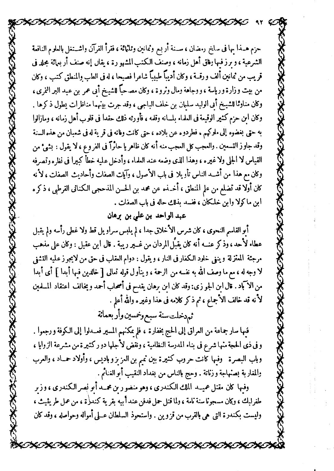 أَبُو الْقَاسِمِ النَّحْوِيُّ، كَانَ شَرِسَ الْأَخْلَاقِ جِدًّا، لَمْ يَلْبَسْ سَرَاوِيلَ قَطُّ وَلَا غَطَّى رَأْسَهُ وَلَمْ يَقْبَلْ عَطَاءً لِأَحَدٍ، وَذُكِرَ عَنْهُ أَنَّهُ كَانَ يقبّل المردان من غير ريبة. قال ابن عقيل: وكان على مذهب مرجئة المعتزلة وينفى خلود الكفار في النار، وَيَقُولُ: دَوَامُ الْعِقَابِ فِي حَقِّ مَنْ لَا يَجُوزُ عَلَيْهِ التَّشَفِّي لَا وَجْهَ لَهُ، مَعَ ما وصف الله بِهِ نَفْسَهُ مِنَ الرَّحْمَةِ، وَيَتَأَوَّلُ قَوْلَهُ تَعَالَى (خالِدِينَ فِيها أَبَداً) 4: 57 أِيْ أَبَدًا مِنَ الْآبَادِ. قَالَ ابْنُ الْجَوْزِيِّ: وَقَدْ كَانَ ابْنُ بُرْهَانَ يَقْدَحُ فِي أَصْحَابِ أحمد ويخالف اعتقاد المسلمين لأنه قد خالف الإجماع، ثم ذكر كلامه في هذا وغيره والله أعلم.