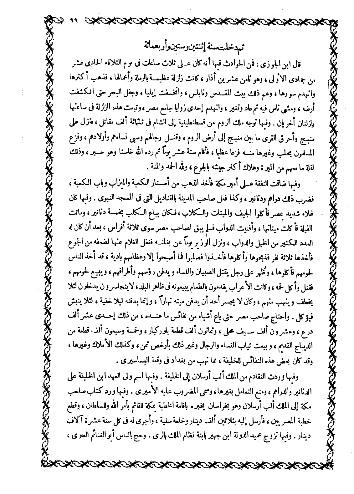 قَالَ ابْنُ الْجَوْزِيِّ: فَمِنَ الْحَوَادِثِ فِيهَا أَنَّهُ كَانَ عَلَى ثَلَاثِ سَاعَاتٍ فِي يَوْمِ الثُّلَاثَاءِ الحادي عشر من جمادى الأولى، وهو ثامن عشرين آذَارَ، كَانَتْ زَلْزَلَةٌ عَظِيمَةٌ بِالرَّمْلَةِ وَأَعْمَالِهَا، فَذَهَبَ أَكْثَرُهَا وَانْهَدَمَ سُورُهَا، وَعَمَّ ذَلِكَ بَيْتَ الْمَقْدِسِ ونابلس، وانخسفت إيليا، وجفل الْبَحْرُ حَتَّى انْكَشَفَتْ أَرْضُهُ، وَمَشَى نَاسٌ فِيهِ ثم عاد وتغير، وانهدم إِحْدَى زَوَايَا جَامِعِ مِصْرَ، وَتَبِعَتْ هَذِهِ الزَّلْزَلَةَ فِي سَاعَتِهَا زَلْزَلَتَانِ أُخْرَيَانِ. وَفِيهَا تَوَجَّهُ مَلِكُ الرُّومِ مِنْ قُسْطَنْطِينِيَّةَ إِلَى الشَّامِ فِي ثَلَاثِمِائَةِ ألف مقاتل، فَنَزَلَ عَلَى مَنْبِجَ وَأَحْرَقَ الْقُرَى مَا بَيْنَ مَنْبِجَ إِلَى أَرْضِ الرُّومِ، وَقَتَلَ رِجَالَهُمْ وَسَبَى نساءهم وأولادهم، وَفَزِعَ الْمُسْلِمُونَ بِحَلَبَ وَغَيْرِهَا مِنْهُ فَزَعًا عَظِيمًا، فَأَقَامَ سِتَّةَ عَشَرَ يَوْمًا ثُمَّ رَدَّهُ اللَّهُ خاسئا وهو حسير، وَذَلِكَ لِقِلَّةِ مَا مَعَهُمْ مِنَ الْمِيرَةِ وَهَلَاكِ أَكْثَرِ جَيْشِهِ بِالْجُوعِ، وللَّه الْحَمْدُ وَالْمِنَّةُ.
