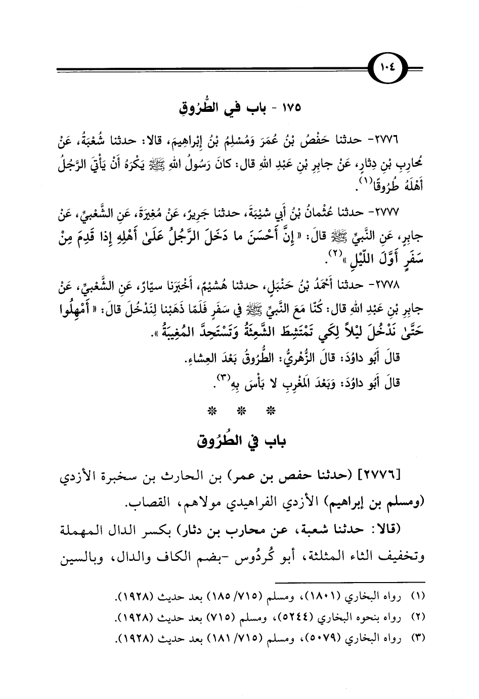 2776 - حدثنا حَفْصُ بْنُ عُمَرَ وَمُسْلِمُ بْنُ إِبْراهِيمَ، قالا: حدثنا شُعْبَةُ، عَنْ مُحارِبِ بْنِ دِثارٍ، عَنْ جابِرِ بْنِ عَبْدِ اللهِ قال: كانَ رَسُولُ اللهِ - صلى الله عليه وسلم - يَكْرَهُ أَنْ يَأْتَي الرَّجُلُ أَهْلَهُ طُرُوقًا (¬1).