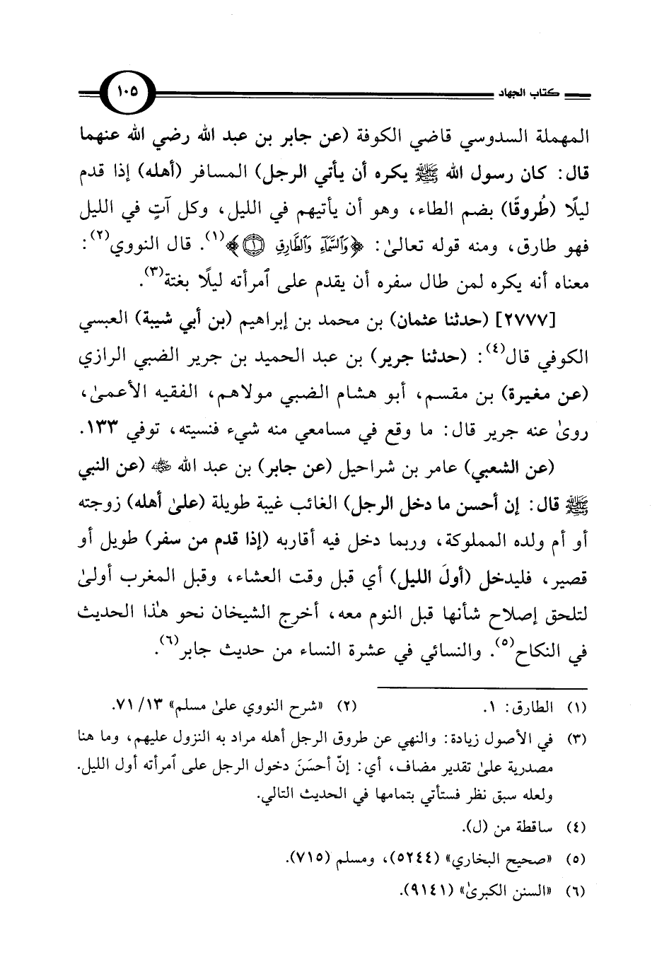 (عن الشعبي) عامر بن شراحيل (عن جابر) بن عبد الله -رضي الله عنه - (عن النبي - صلى الله عليه وسلم - قال: إن أحسن ما دخل الرجل) الغائب غيبة طويلة (على أهله) زوجته أو أم ولده المملوكة، وربما دخل فيه أقاربه (إذا قدم من سفر) طويل أو قصير، فليدخل (أولَ الليل) أي قبل وقت العشاء، وقبل المغرب أولى لتلحق إصلاح شأنها قبل النوم معه، أخرج الشيخان نحو هذا الحديث في النكاح (¬5). والنسائيُّ في عشرة النساء من حديث جابر (¬6).