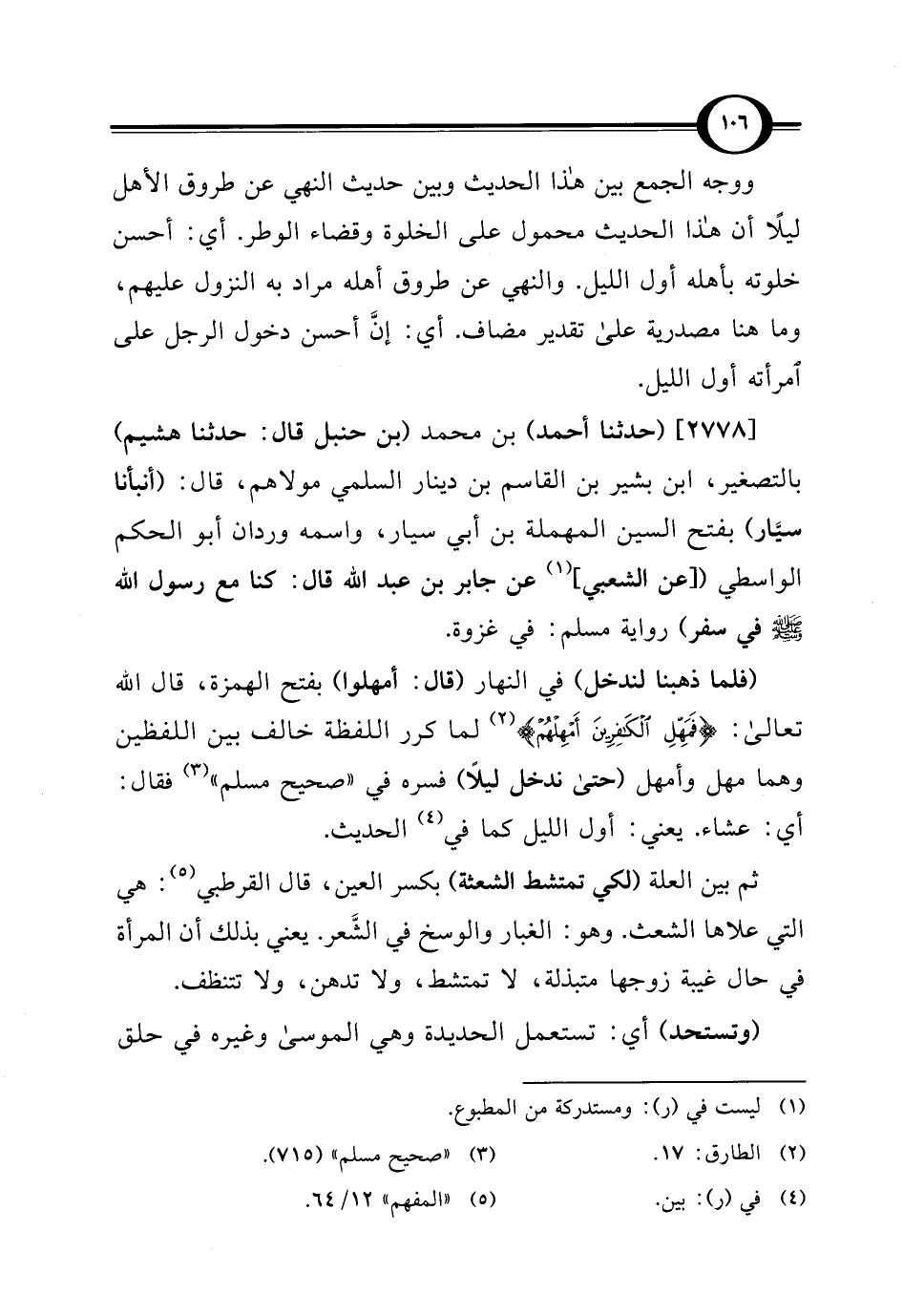 [2778] (حدثنا أحمد) بن محمَّد (بن حنبل قال: حدثنا هشيم) بالتصغير، ابن بشير بن القاسم بن دينار السلمي مولاهم، قال: (أنبأنا سيَّار) بفتح السين المهملة بن أبي سيار، واسمه وردان أبو الحكم الواسطي ([عن الشعبي] (¬1) عن جابر بن عبد الله قال: كنا مع رسول الله - صلى الله عليه وسلم - في سفر) رواية مسلم: في غزوة.