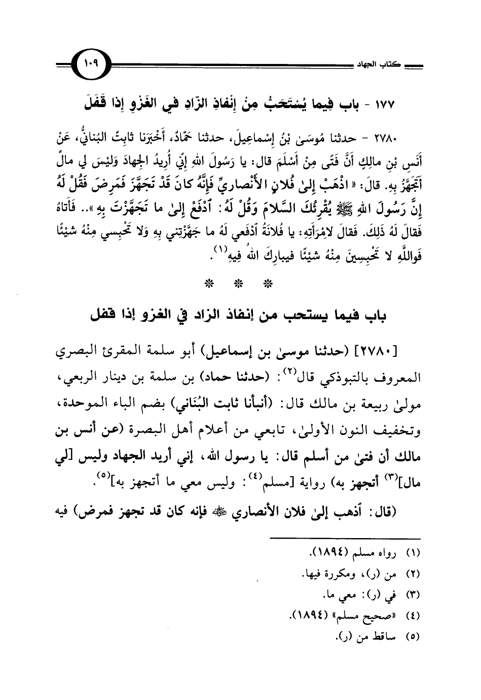 2780 - حدثنا مُوسَى بْنُ إِسْماعِيلَ، حدثنا حَمّادٌ، أَخْبَرَنا ثابِتٌ البُنانيُّ، عَنْ أَنَسِ بْنِ مالِكٍ أَنَّ فَتًى مِنْ أَسْلَمَ قال: يا رَسُولَ اللهِ إِنّي أُرِيدُ الجِهادَ وَليْسَ لي مالٌ أَتَجَهَّزُ بِهِ. قَالَ: "اذْهَبْ إِلى فُلانٍ الأَنْصاريِّ فَإِنَّهُ كانَ قَدْ تَجَهَّزَ فَمَرِضَ فَقُلْ لَهُ إِنَّ رَسُولَ اللهِ - صلى الله عليه وسلم - يُقْرِئُكَ السَّلامَ وَقُلْ لَهُ: ادْفَعْ إِلى ما تَجَهَّزْتَ بِهِ" .. فَأَتاهُ فَقالَ لَهُ ذَلِكَ. فَقالَ لاِمْرَأَتِهِ: يا فُلانَةُ ادْفَعي لَهُ ما جَهَّزْتِني بِهِ وَلا تَحْبِسي مِنْهُ شيْئًا فَواللهِ لا تَحْبِسِينَ مِنْهُ شيْئًا فيبارِكَ اللهُ فِيهِ (¬1).