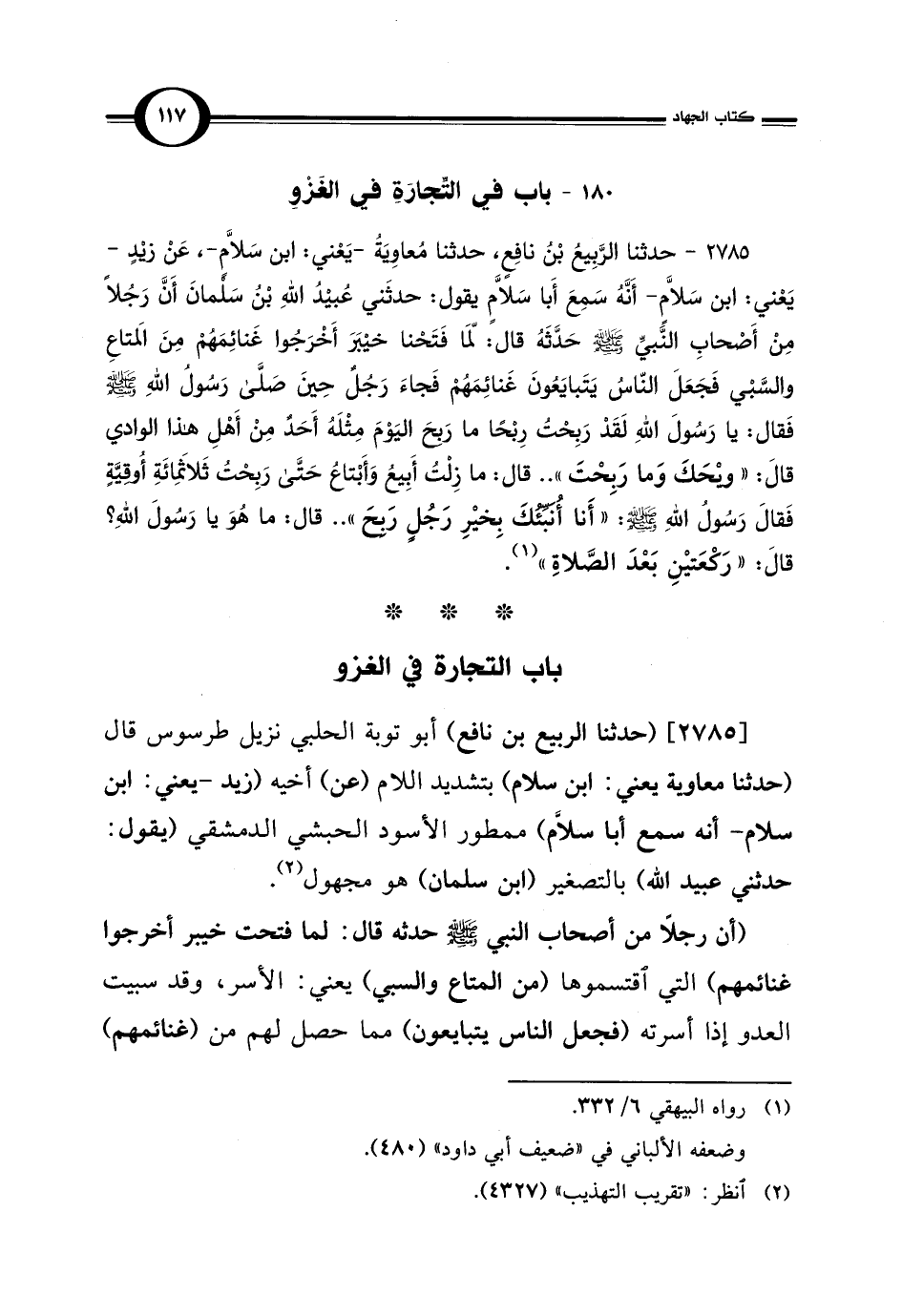 3785 - حدثنا الرَّبِيعُ بْنُ نافِعٍ، حدثنا مُعاوِيَةُ -يَعْني: ابن سَلَّامٍ-، عَنْ زيْدٍ -يَعْني: ابن سَلَّامٍ - أَنَّهُ سَمِعَ أَبا سَلَّامٍ يقول: حدثَني عُبيْدُ اللهِ بْنُ سَلْمانَ أَنَّ رَجُلًا مِنْ أَصْحابِ النَّبيِّ - صلى الله عليه وسلم - حَدَّثَهُ قال: لمَّا فَتَحْنا خيْبَرَ أَخْرَجُوا غَنائِمَهُمْ مِنَ المَتاعِ والسَّبْي فَجَعَلَ النّاسُ يَتَبايَعُونَ غَنائِمَهُمْ فَجاءَ رَجُلٌ حِينَ صَلَّى رَسُولُ اللهِ - صلى الله عليه وسلم - فَقال: يا رَسُولَ اللهِ لَقَدْ رَبِحْتُ رِبْحًا ما رَبِحَ اليَوْمَ مِثْلَهُ أَحَدٌ مِنْ أَهْلِ هذا الوادي قَالَ: "ويْحَكَ وَما رَبِحْتَ" .. قال: ما زِلْتُ أَبِيعُ وَأَبْتاعُ حَتَّى رَبِحْتُ ثَلاثَمِائَةِ أُوقِيَّةٍ فَقالَ رَسُولُ اللهِ - صلى الله عليه وسلم -: "أَنا أُنَبِّئُكَ بِخيْرِ رَجُلٍ رَبِحَ" .. قال: ما هُوَ يا رَسُولَ اللهِ؟ قَالَ: "رَكْعَتيْنِ بَعْدَ الصَّلاةِ" (¬1).