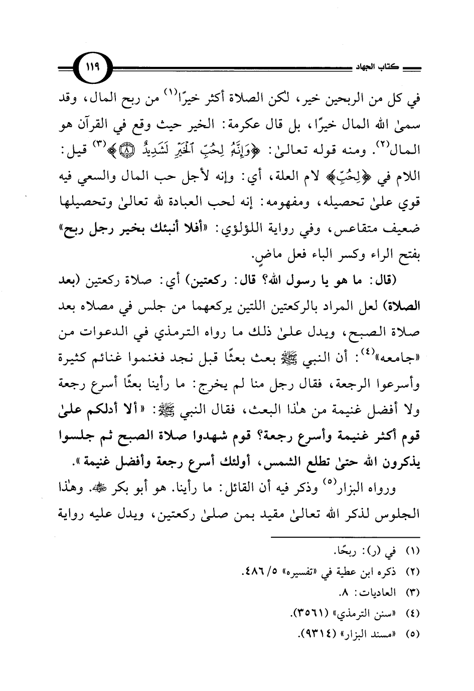 في كل من الربحين خير، لكن الصلاة أكثر خيرًا (¬1) من ربح المال، وقد سمى الله المال خيرًا، بل قال عكرمة: الخير حيث وقع في القرآن هو المال (¬2). ومنه قوله تعالى: {وَإِنَّهُ لِحُبِّ الْخَيْرِ لَشَدِيدٌ} (¬3) قيل: اللام في {لِحُبِّ} لام العلة، أي: وإنه لأجل حب المال والسعي فيه قوي على تحصيله، ومفهومه: إنه لحب العبادة لله تعالى وتحصيلها ضعيف متقاعس، وفي رواية اللؤلؤي: "أفلا أنبئك بخير رجل ربح" بفتح الراء وكسر الباء فعل ماضٍ.