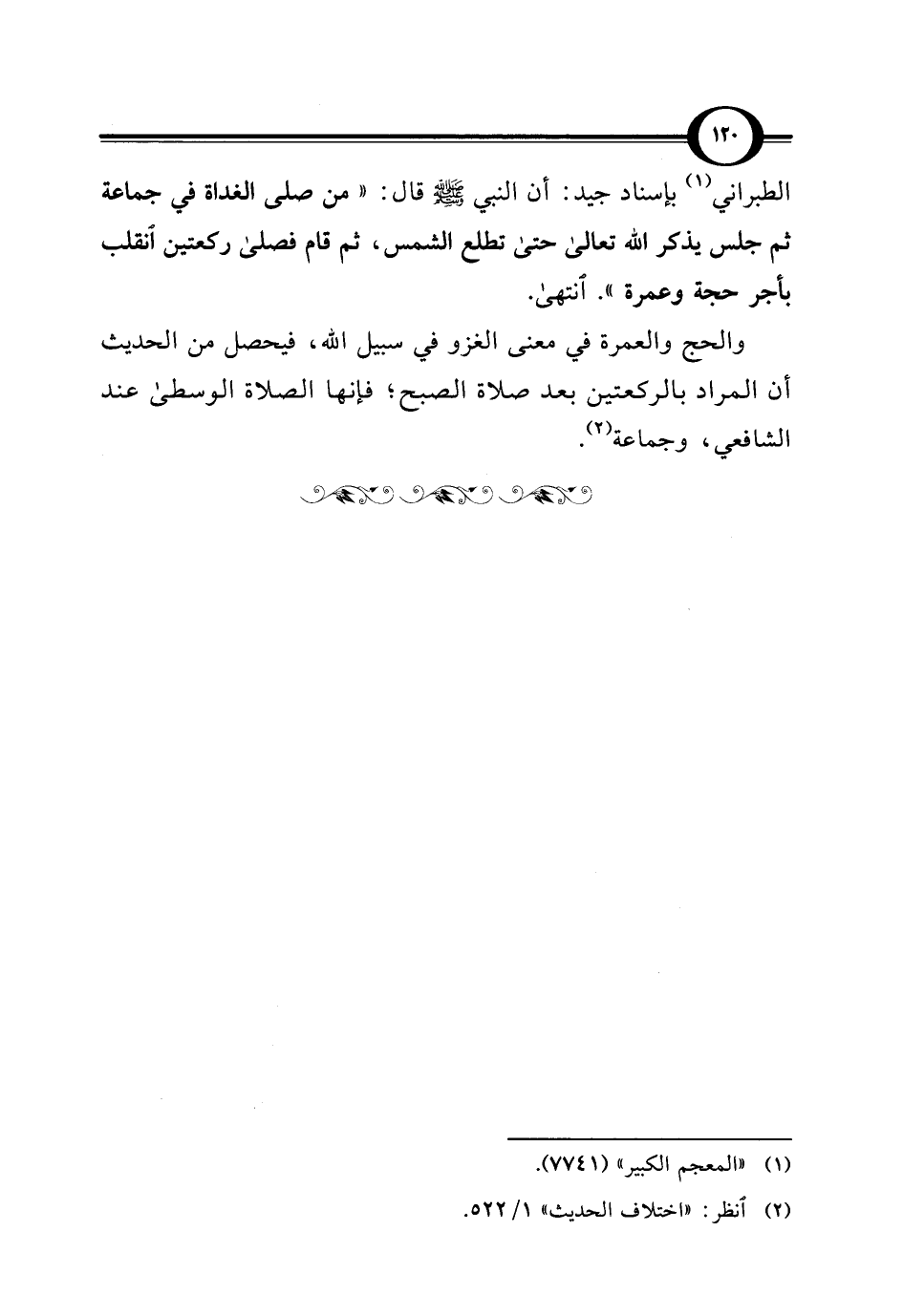 الطبراني (¬1) بإسناد جيد: أن النبي - صلى الله عليه وسلم - قال: "من صلى الغداة في جماعة ثمَّ جلس يذكر الله تعالى حتى تطلع الشمس، ثمَّ قام فصلى ركعتين انقلب بأجر حجة وعمرة". انتهى.